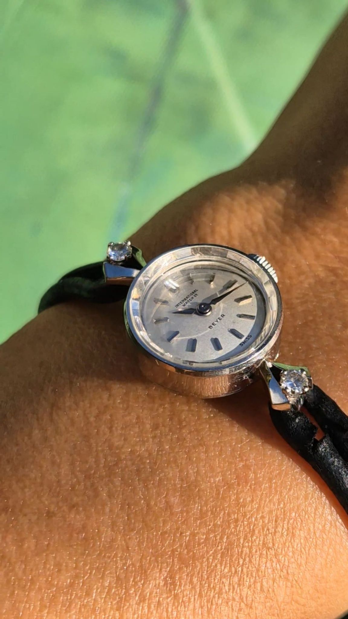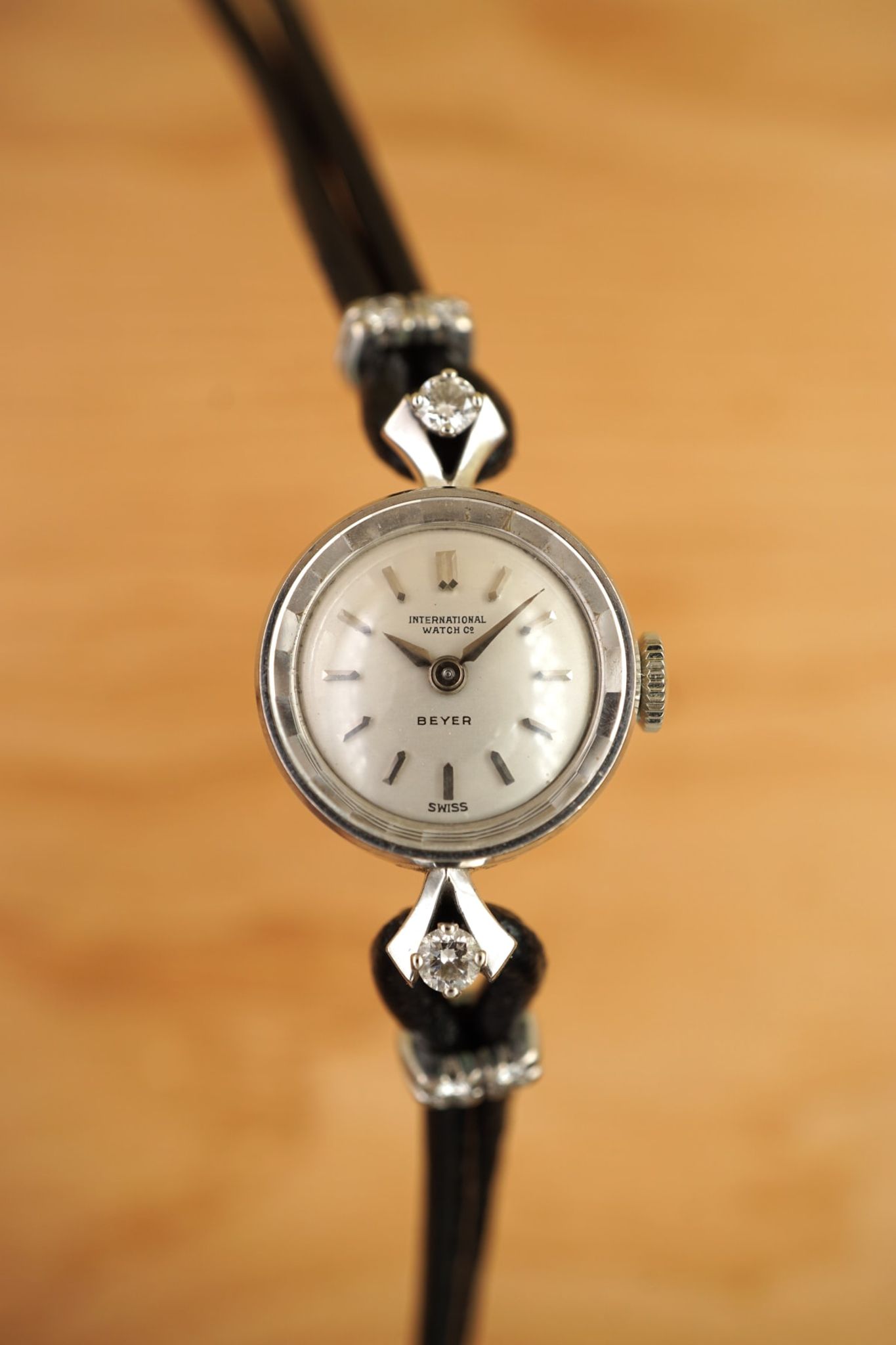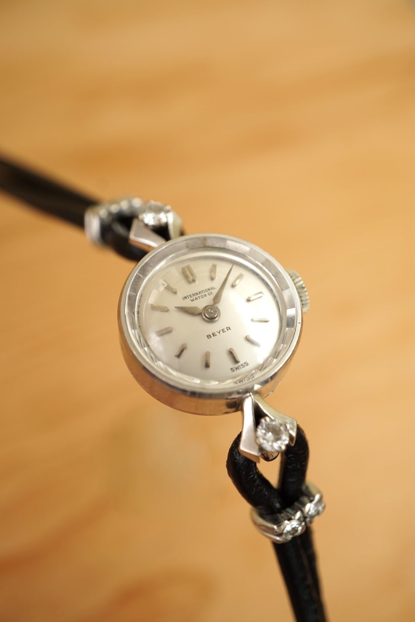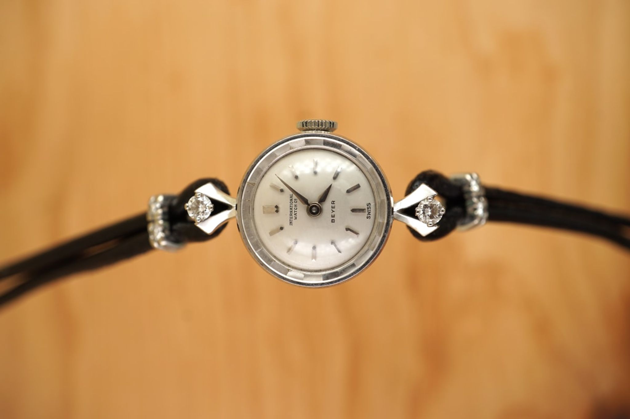 Indeed, ready for the opera or club-evening but also dressy on a office-day or the lazy Friday-afternoon. Very beautiful and very feminine: Produced by IWC in 1957 or 1958 according to our books and research and proudly sold by Beyer, Zurich as indicated by the retailer-print on the dial. And with a reason: the fine and feminine round-case executed in 18K-whitegold holds a horological masterpiece with the small cal431 IWC. The center-lugs are decorated with lively-sparkling diamonds and even the clasp is made of 18K-whitegold and as are the cuffs, which are accented with further diamonds.