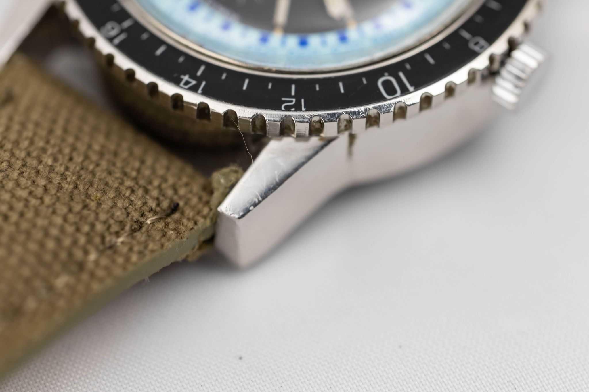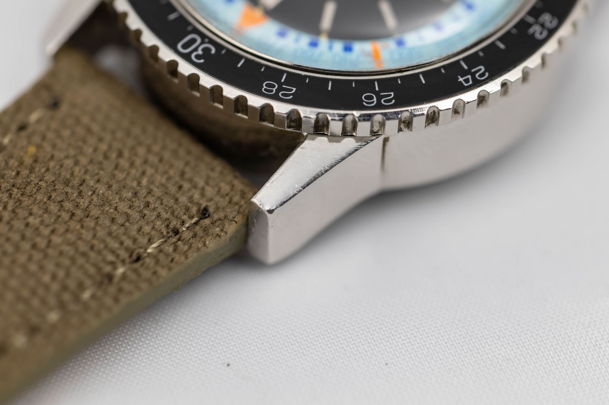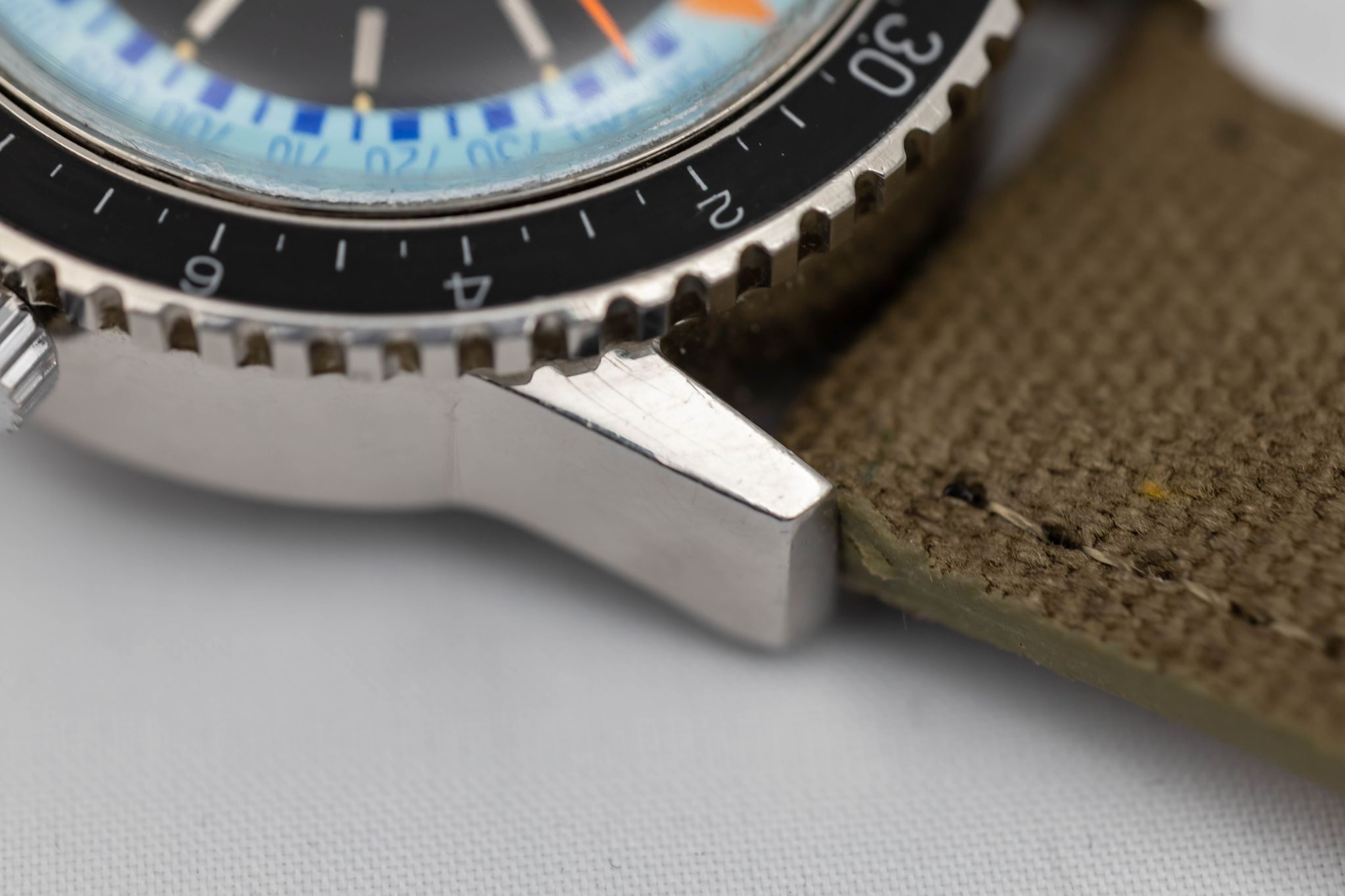This particular model, identified by its reference number 53223, boasts distinctive features that enhance its functionality and aesthetic appeal. A striking blue barometer scale adorns its dial, offering precise atmospheric pressure readings, while silver hour markers, complemented by tritium lume dots, ensure optimal visibility in low-light conditions. Positioned at 6 o'clock, a small second sub-register adds a subtle yet functional element to its design. Moreover, a rotating black bezel (Bakelite?) serves as a reliable indicator of altitude, capable of measuring heights up to 3000 meters above sea level.