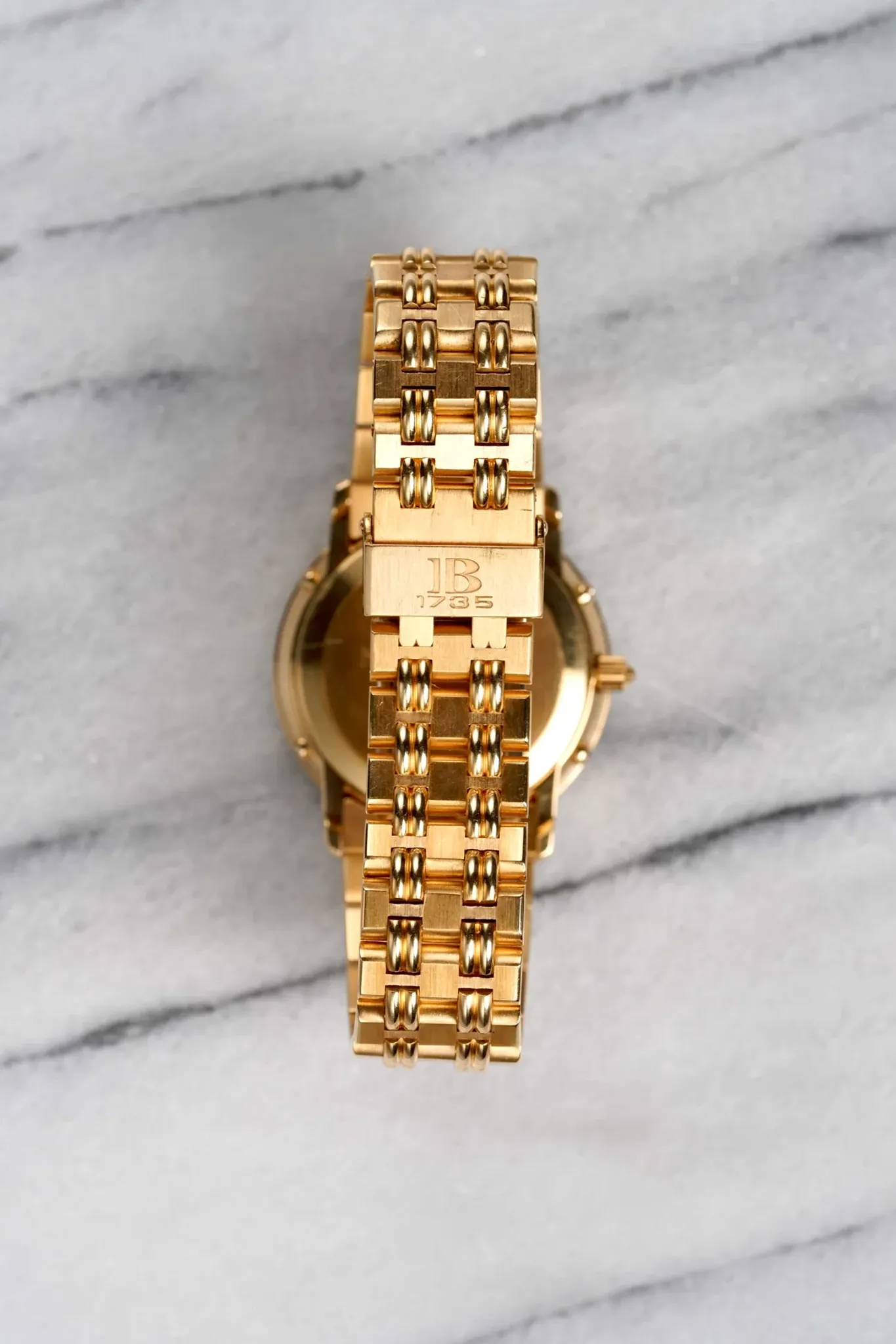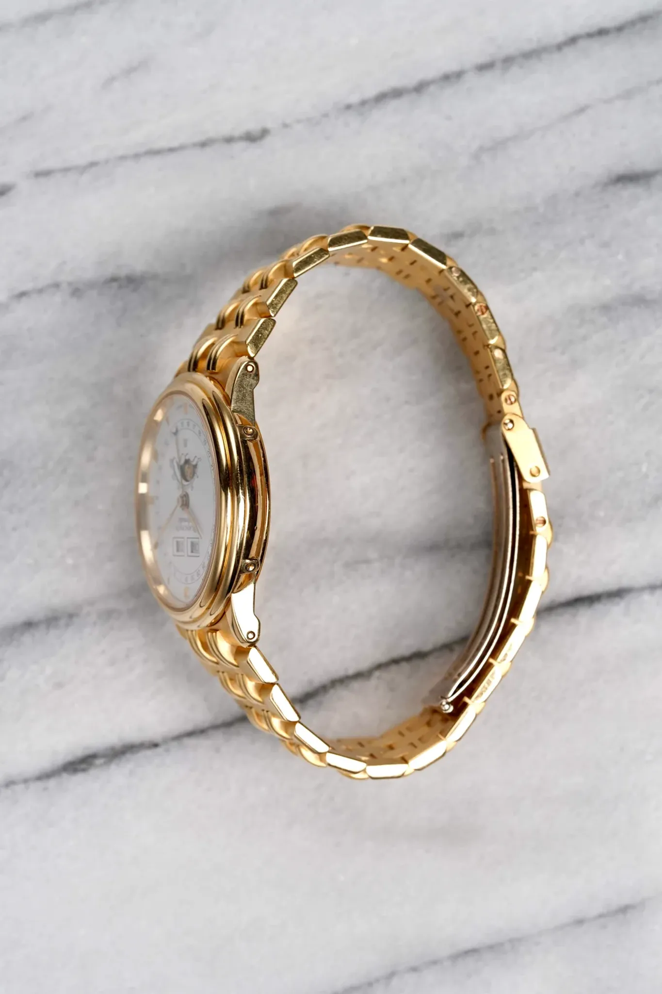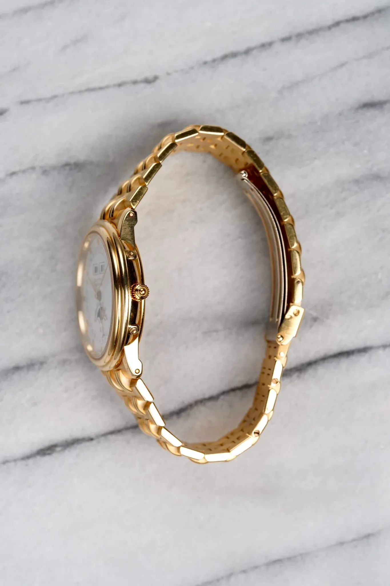 Here's a Blancpain Moonphase Triple Calendar automatic in 18K yellow gold from the 1990s. Keeps great time and is fully functional. Measurements include a 35mm case and 18mm lugs. It’s on its original two tone braided finish bracelet the fits up to a 7 inch wrist. Function include the time, day, date, month, and moon phase indicator. The day and month are at 12 a clock. Moonphase are at 6 a clock. 18K gold case and caseback. Matching gold hands and hour markers. Gold Roman numerals and aloha hands. Both the dial and crystal are free from any scratches or marks. Unpolished case and bracelet. A unique bracelet and a great alternative to the Cartier Santos! All parts are original including the signed crown, caseback, dial, and movement. Both the dial and case are in great cosmetic, untouched condition.