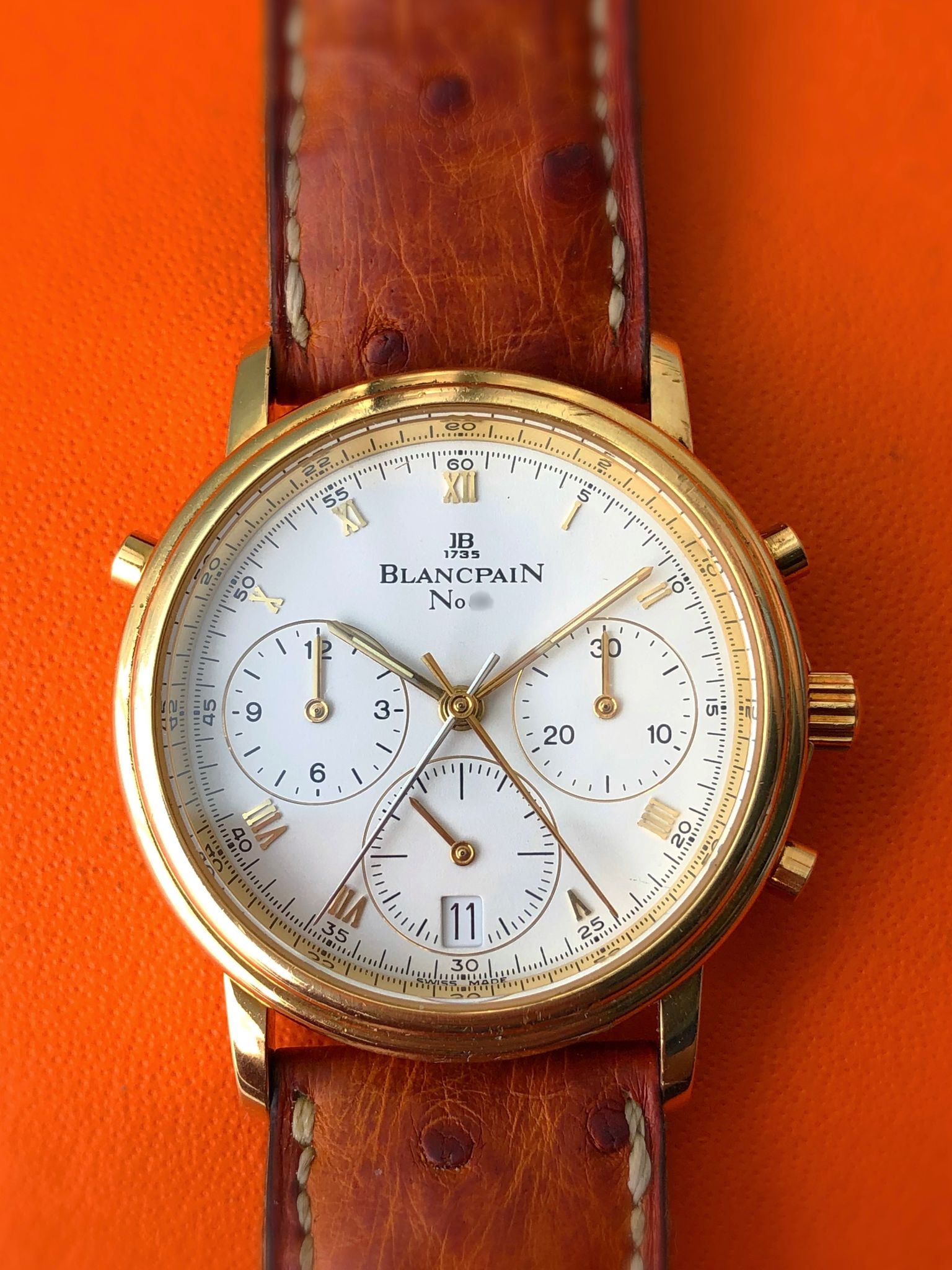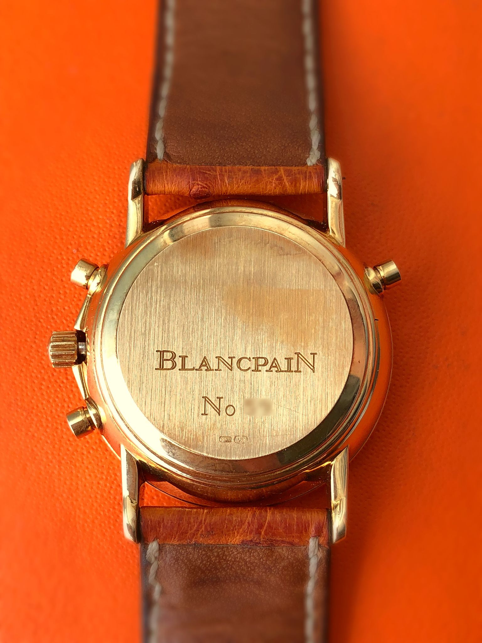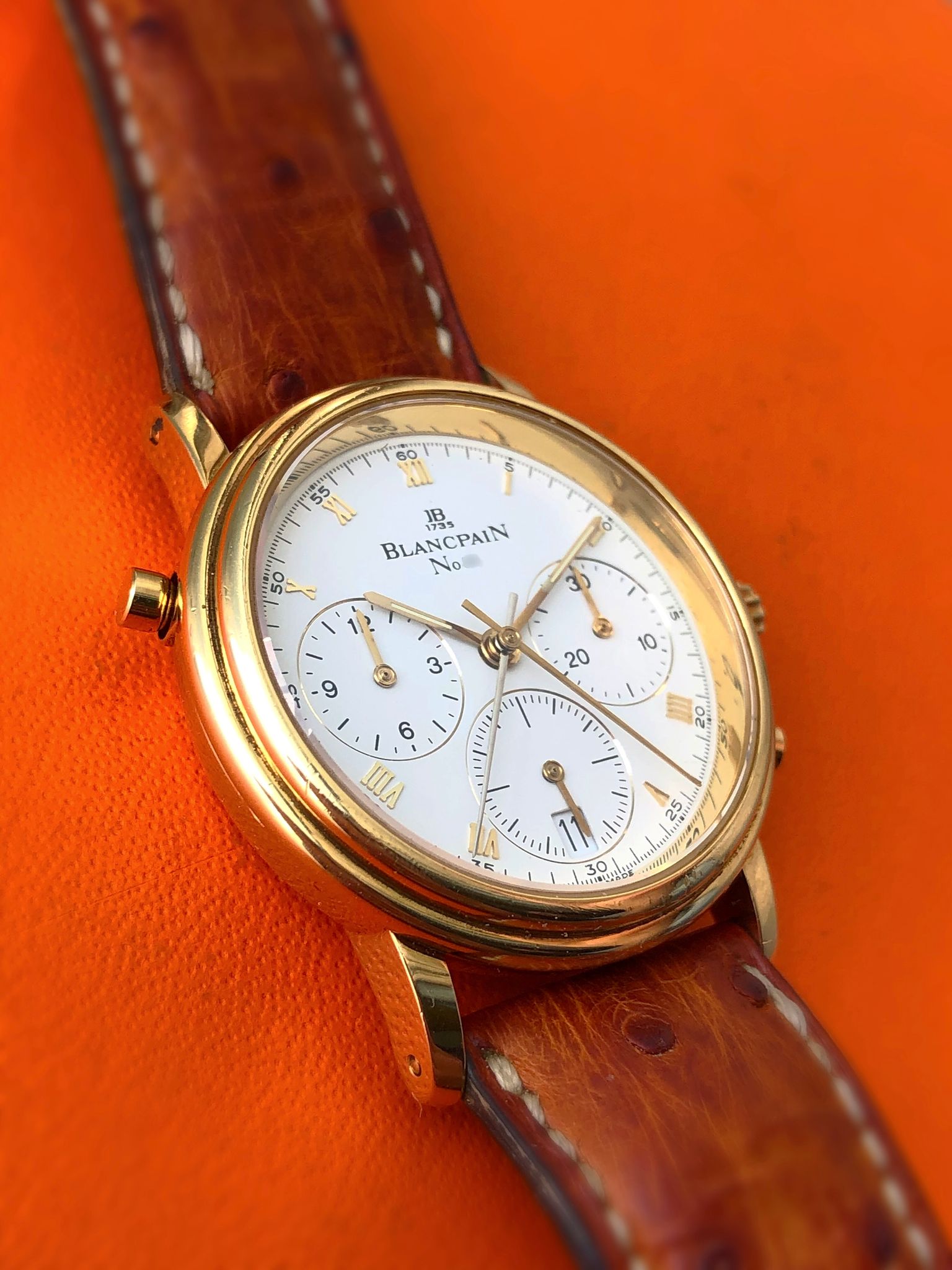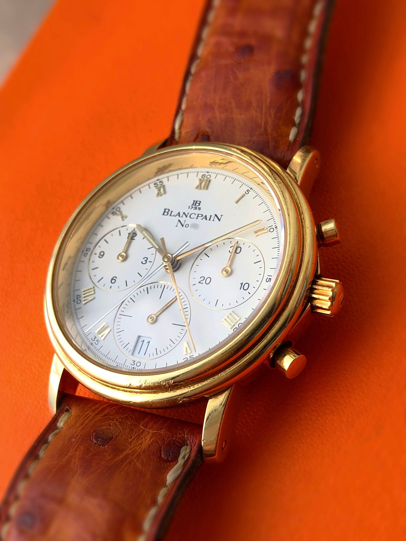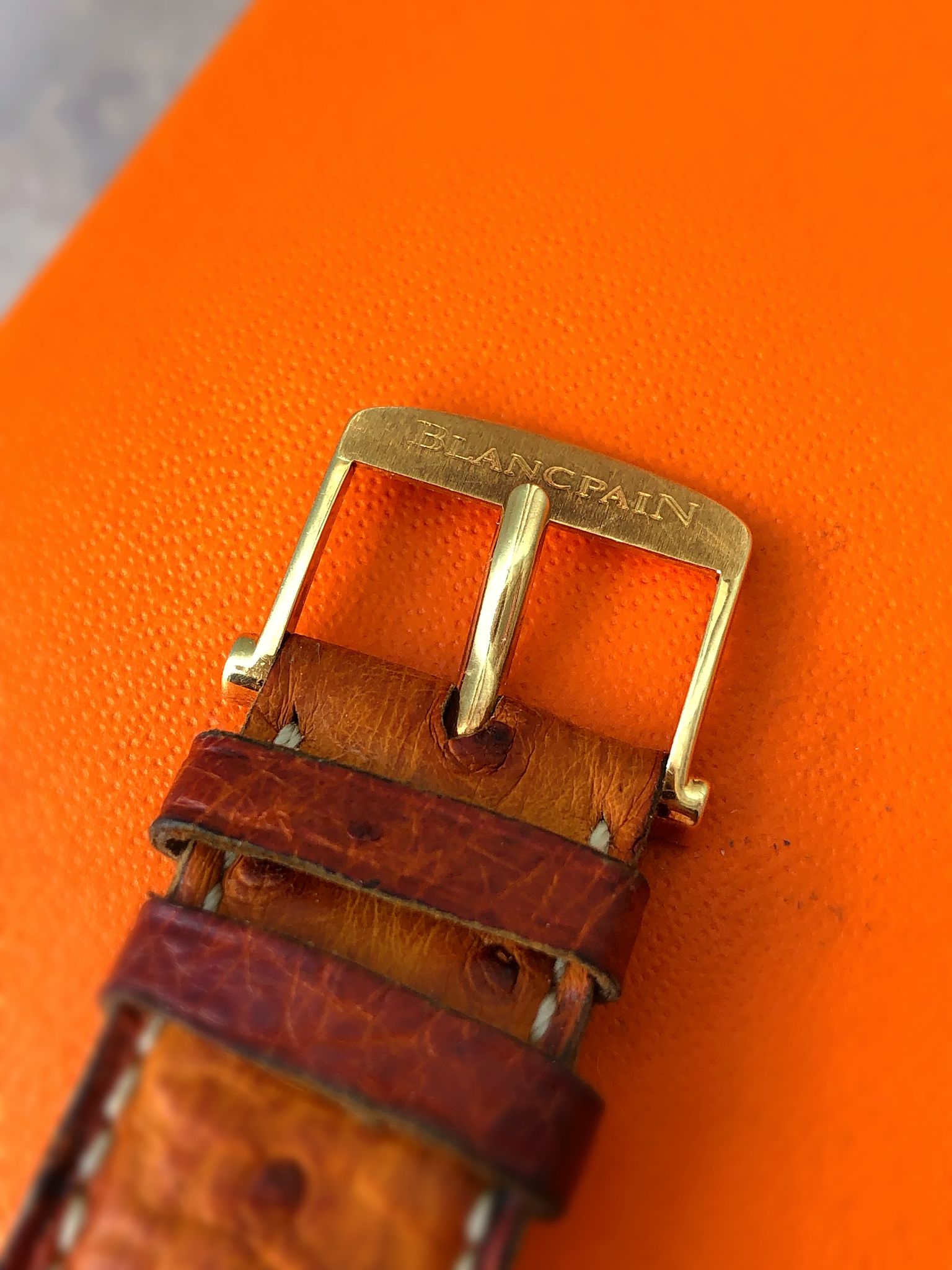 Watch comes with its Original yellow-gold Blancpain Tang Buckle, orange Ostrich Blancpain Strap and Blancpain Inner & Outer Box.