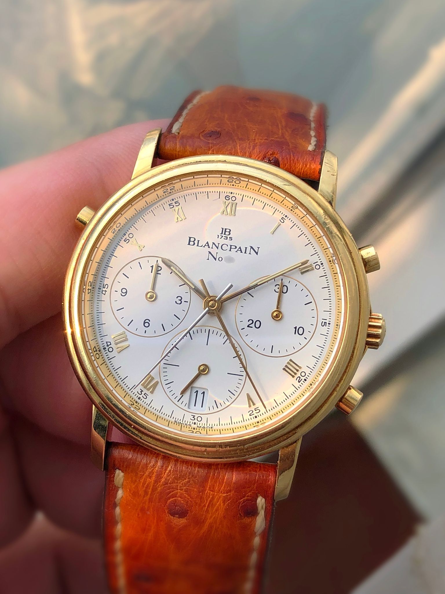 It was in Basel 1988 that Blancpain showed its first chronograph. This remarkable watch included not just a flyback chronograph complication and automatic winding (the first such movement developed in over a decade) but was remarkably thin just 6.75 mm overall. It was based on the F.Piguet Cal.1185, which had been introduced in 1987 as the hand-winding Cal.1180 introduced earlier.