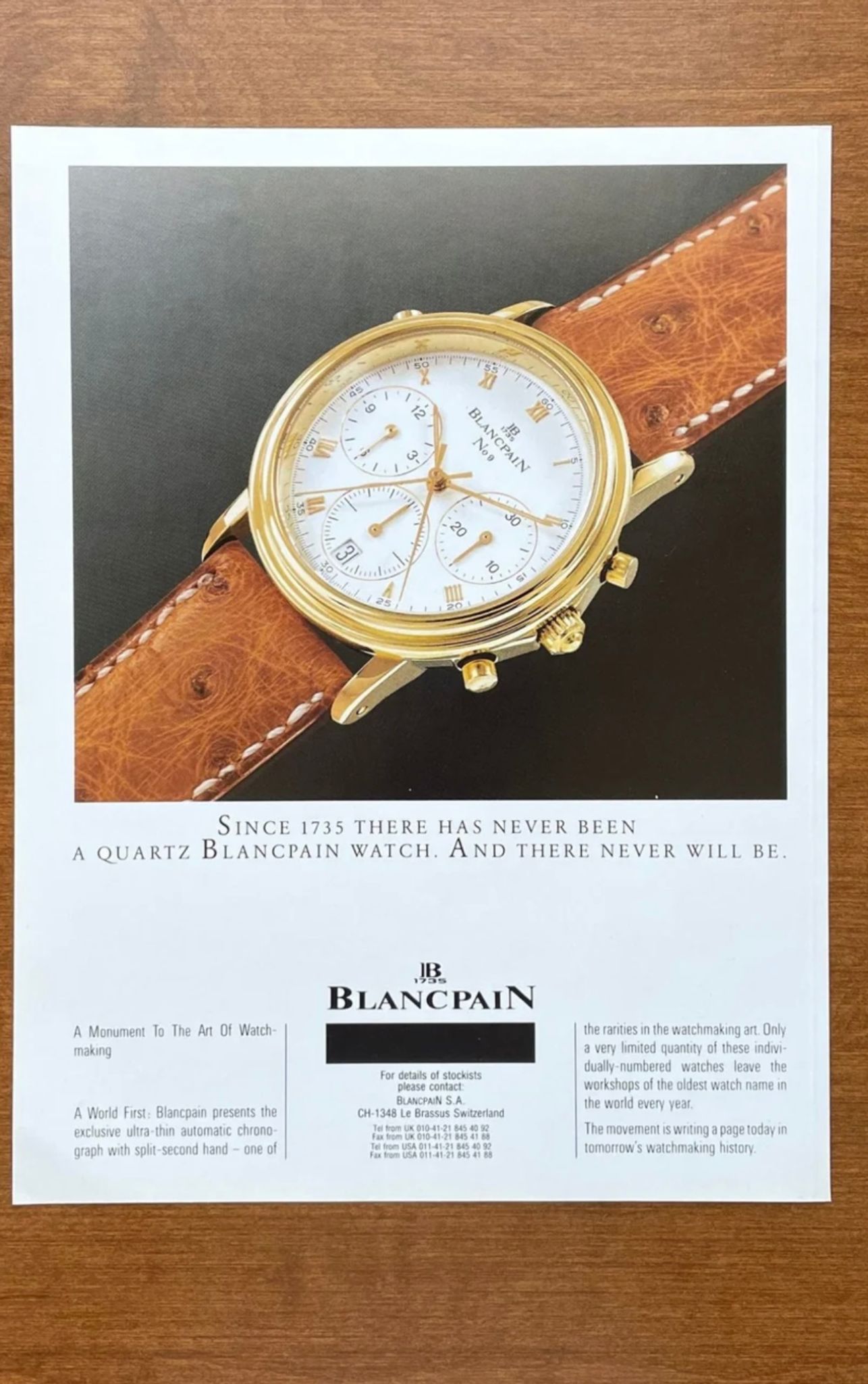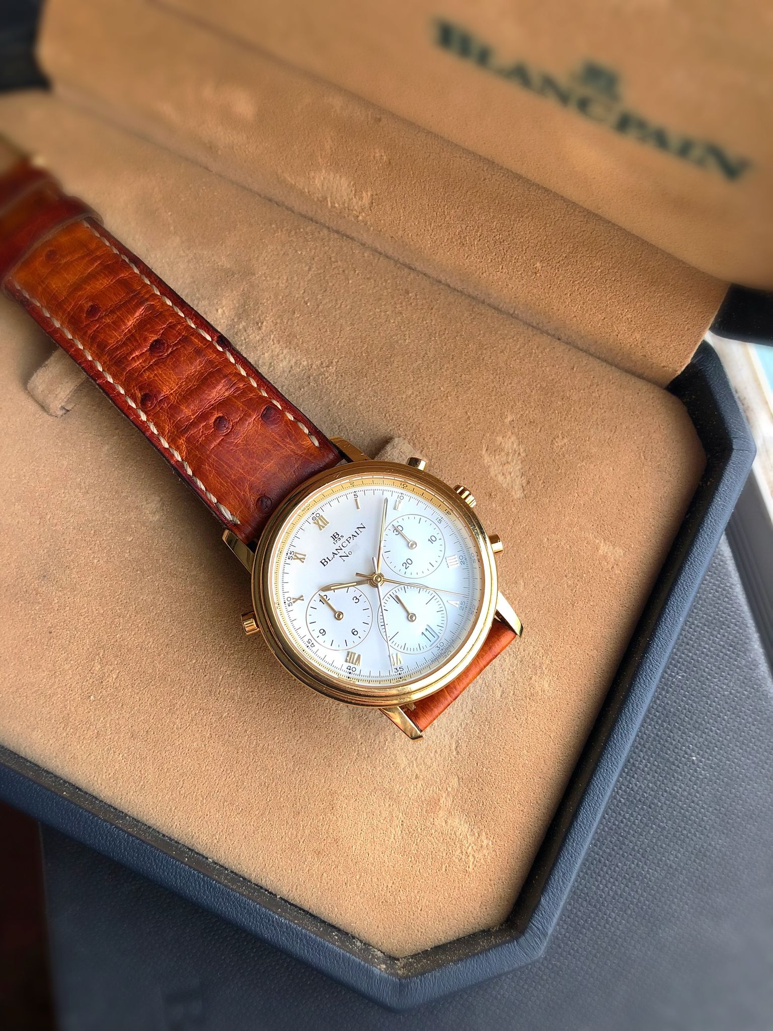 The simple design remains an icon for Blancpain and was one of the “six masterpieces” from the brand that exemplified “the living museum of the past” concept championed by Mr Biver. Blancpain would build six key mechanical watches over the next decade: An ultra-thin watch, the moon phase display, a perpetual calendar, a split-seconds chronograph, a tourbillon, and a minute repeater. The 4th mentioned is the one we have today.