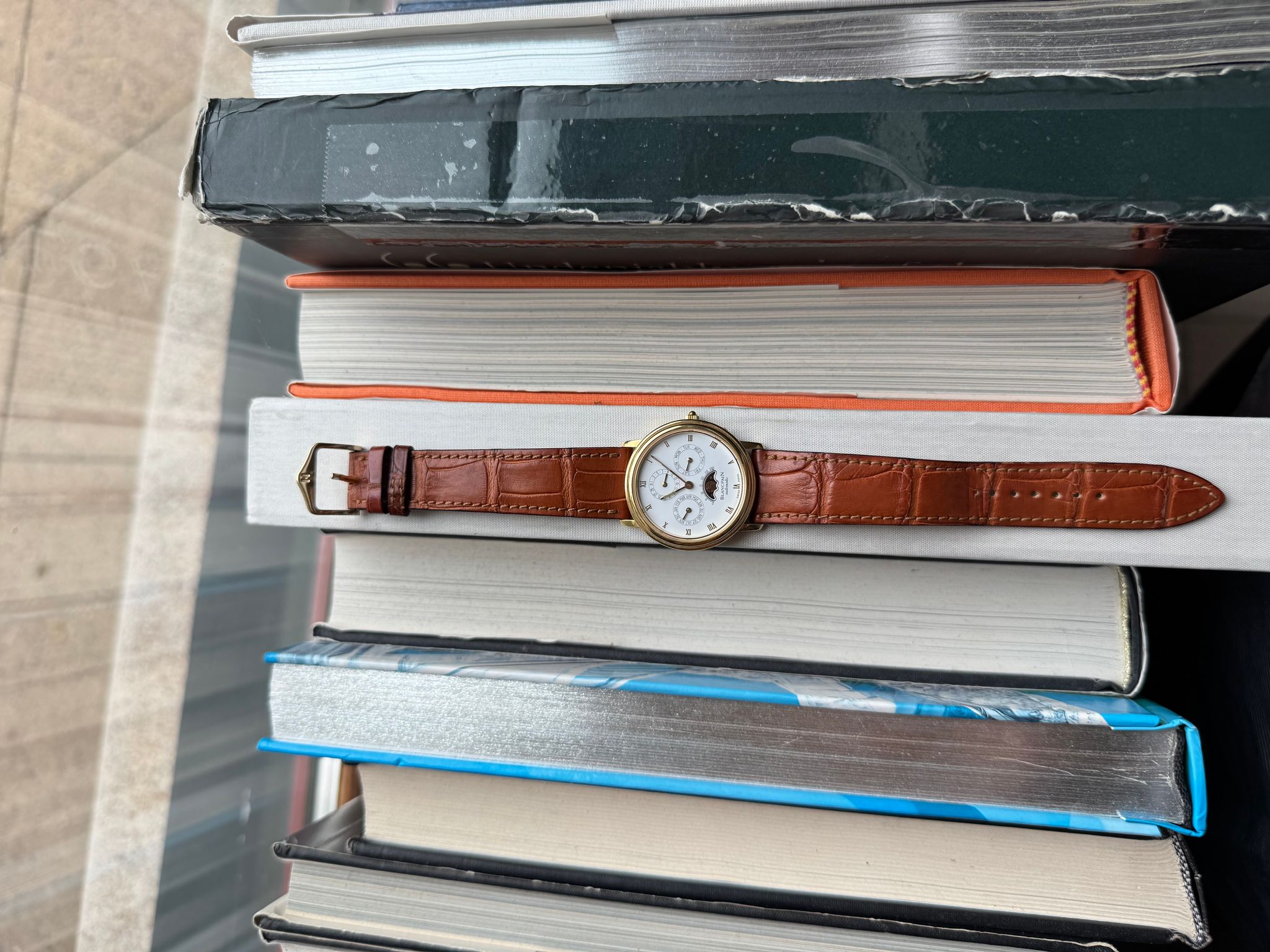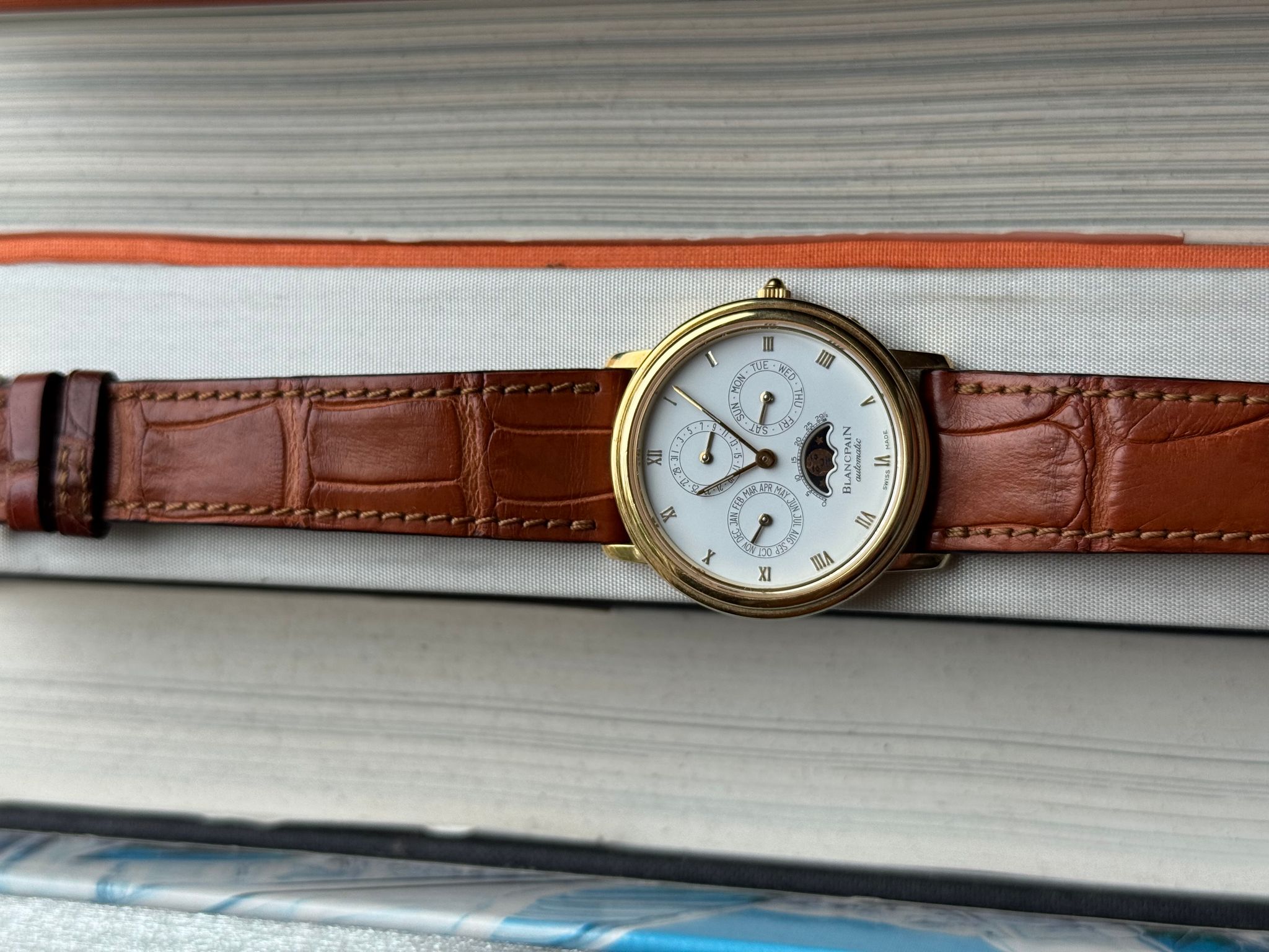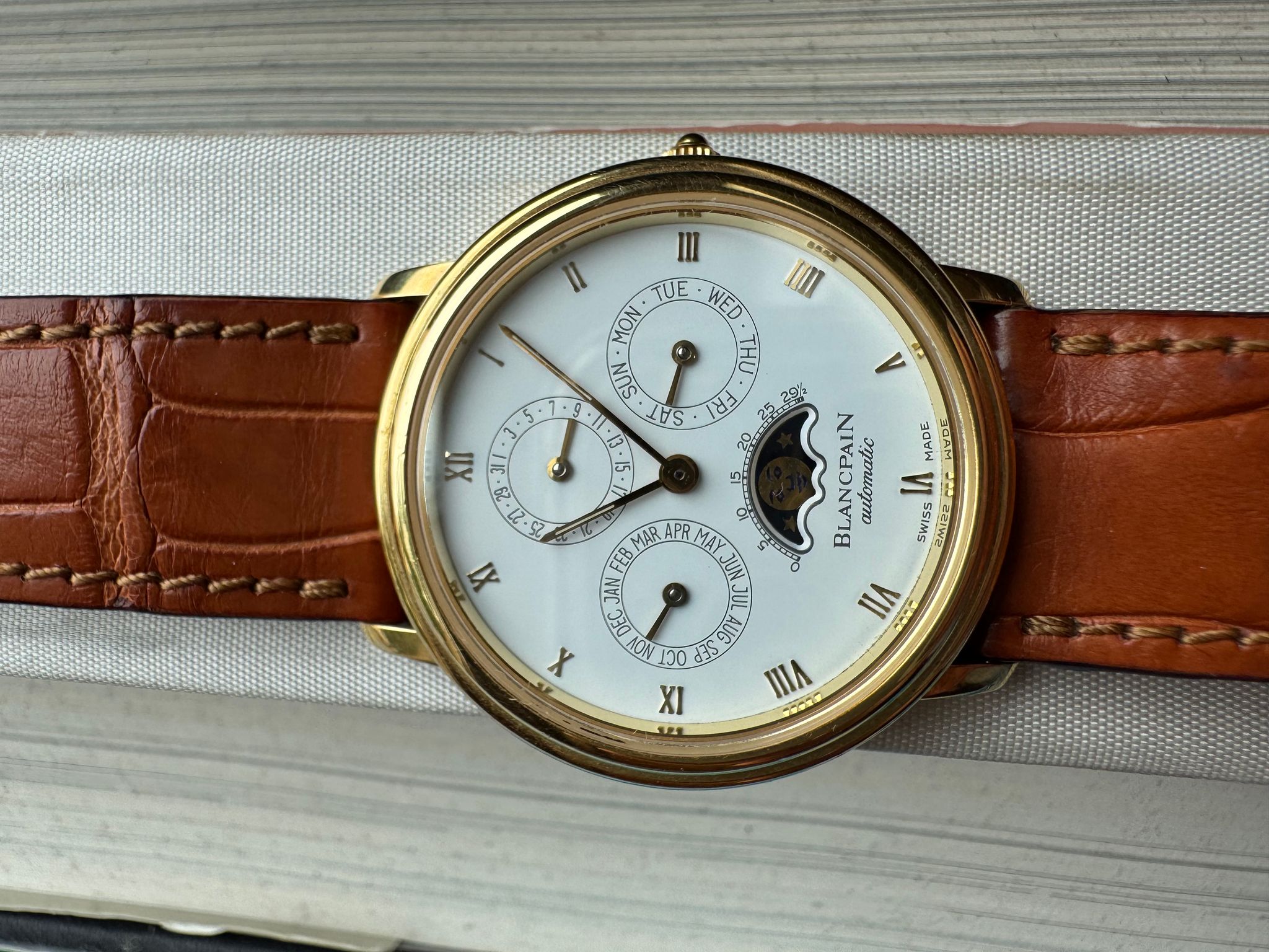 Blancpain Villeret Perpetual Calendar Moonphase 18k Gold Watch Cal.6511. This watch is in great pre-owned condition and running well. This watch features a Frederic Piguet 6511 movement, while most of these 80’s perpetual calendars feature a 5395 Caliber before the transition to the 5495. No box or papers, on afterma