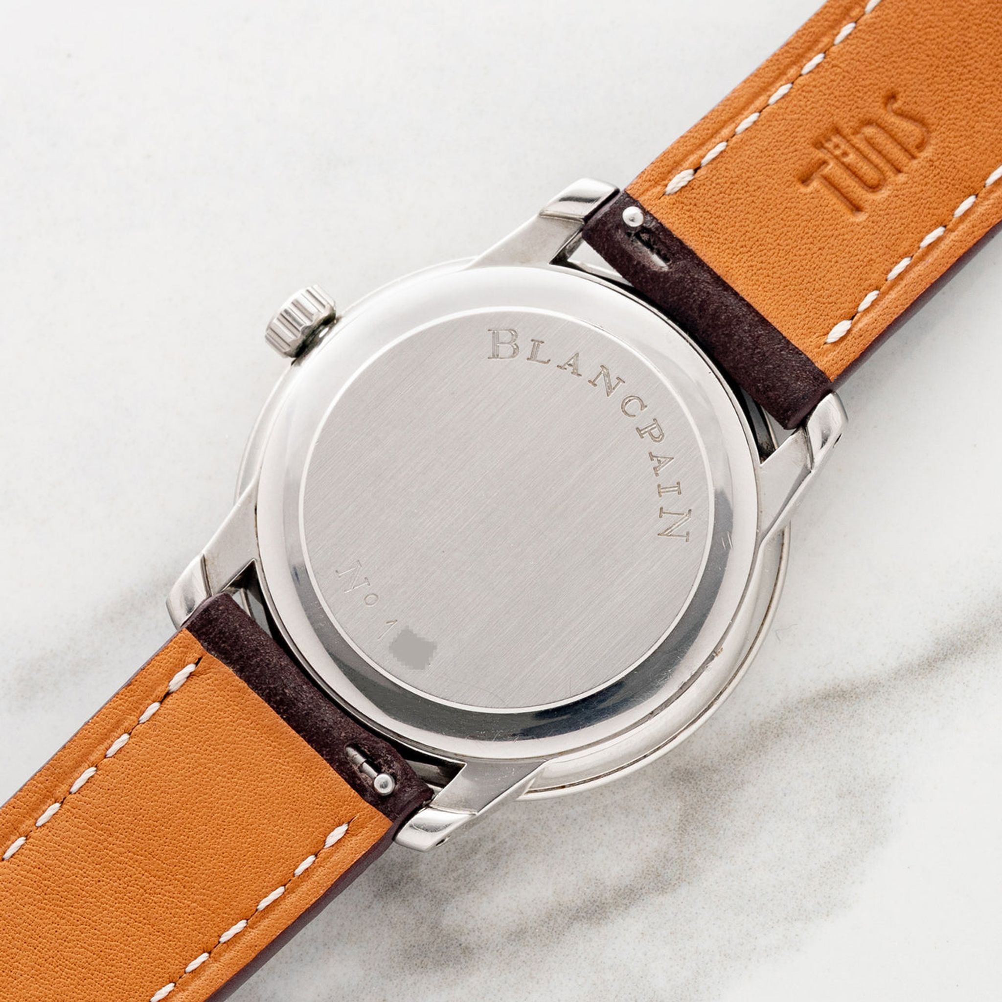 Bracelet: Two piece suede strap in brown and correct stainless Blancpain signed pin buckle in addition to the correct curved spring bars. Crystal: Clear.