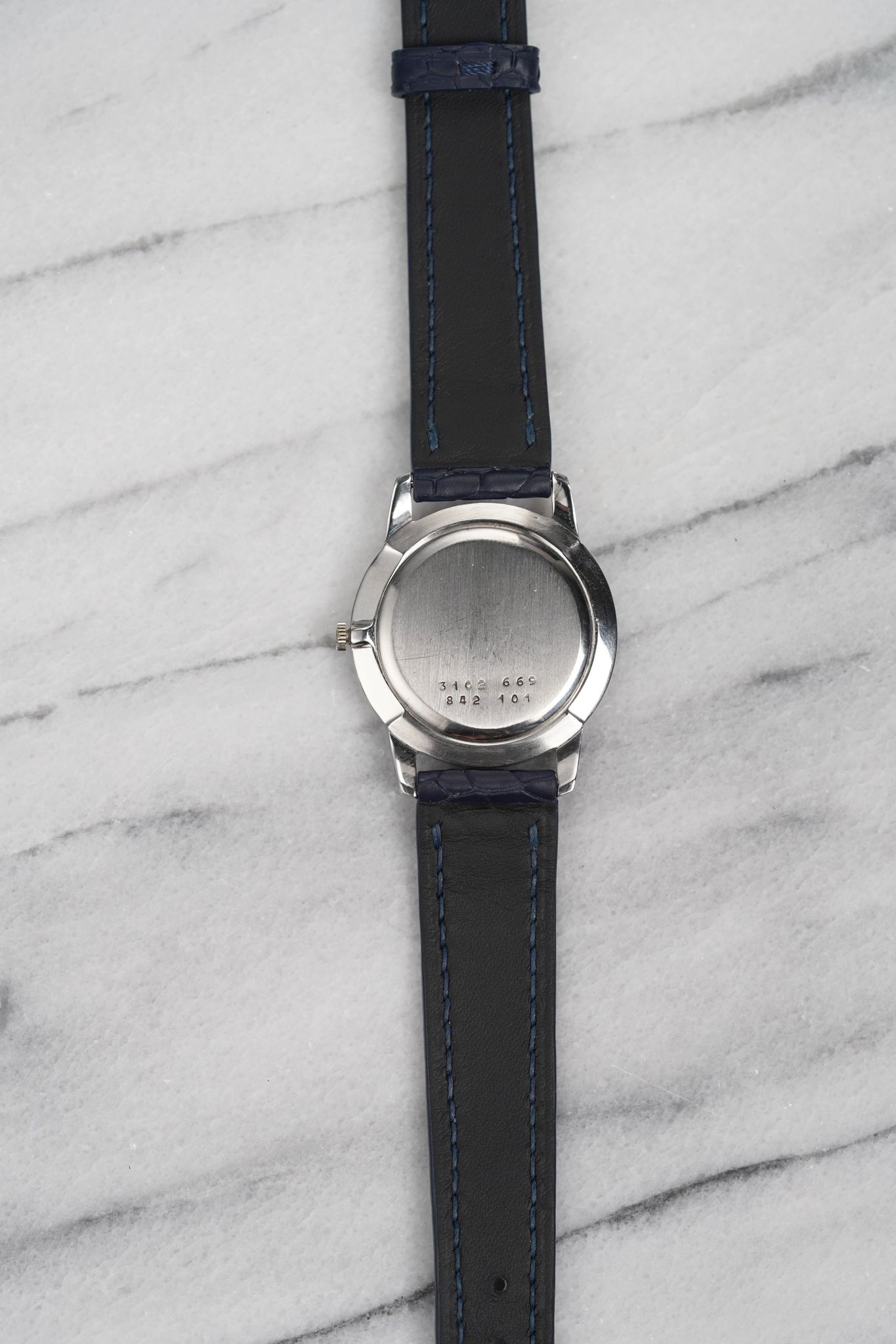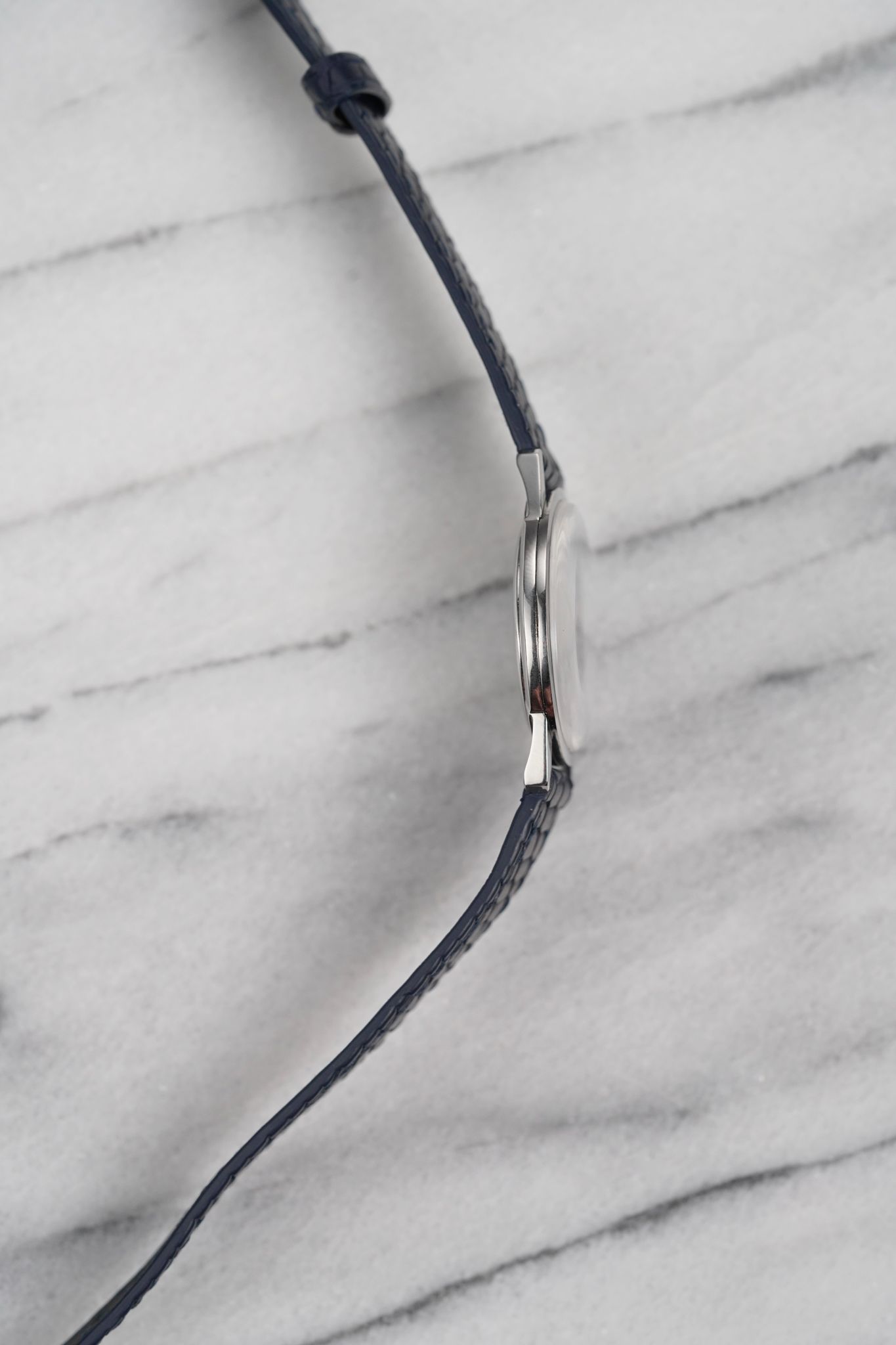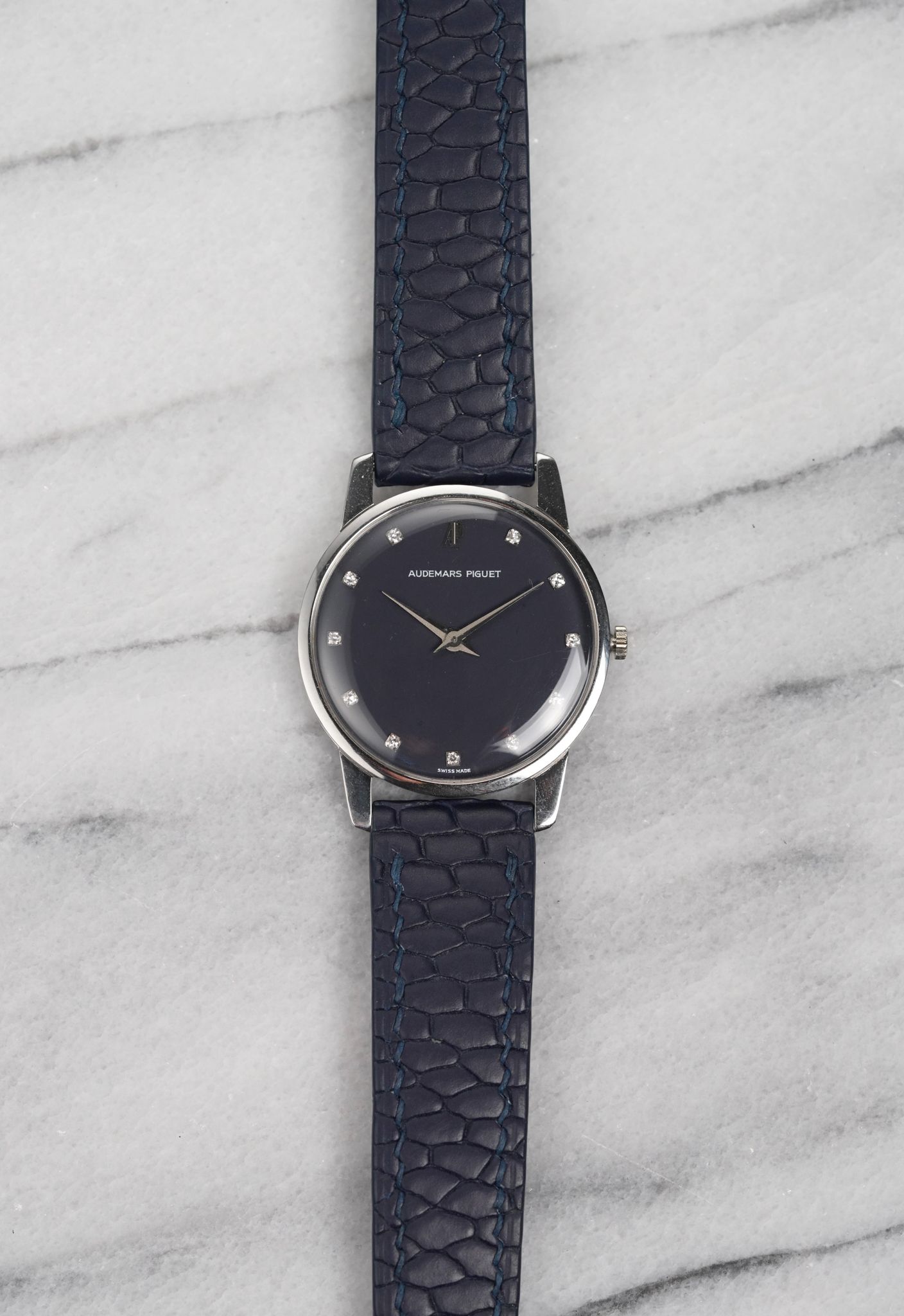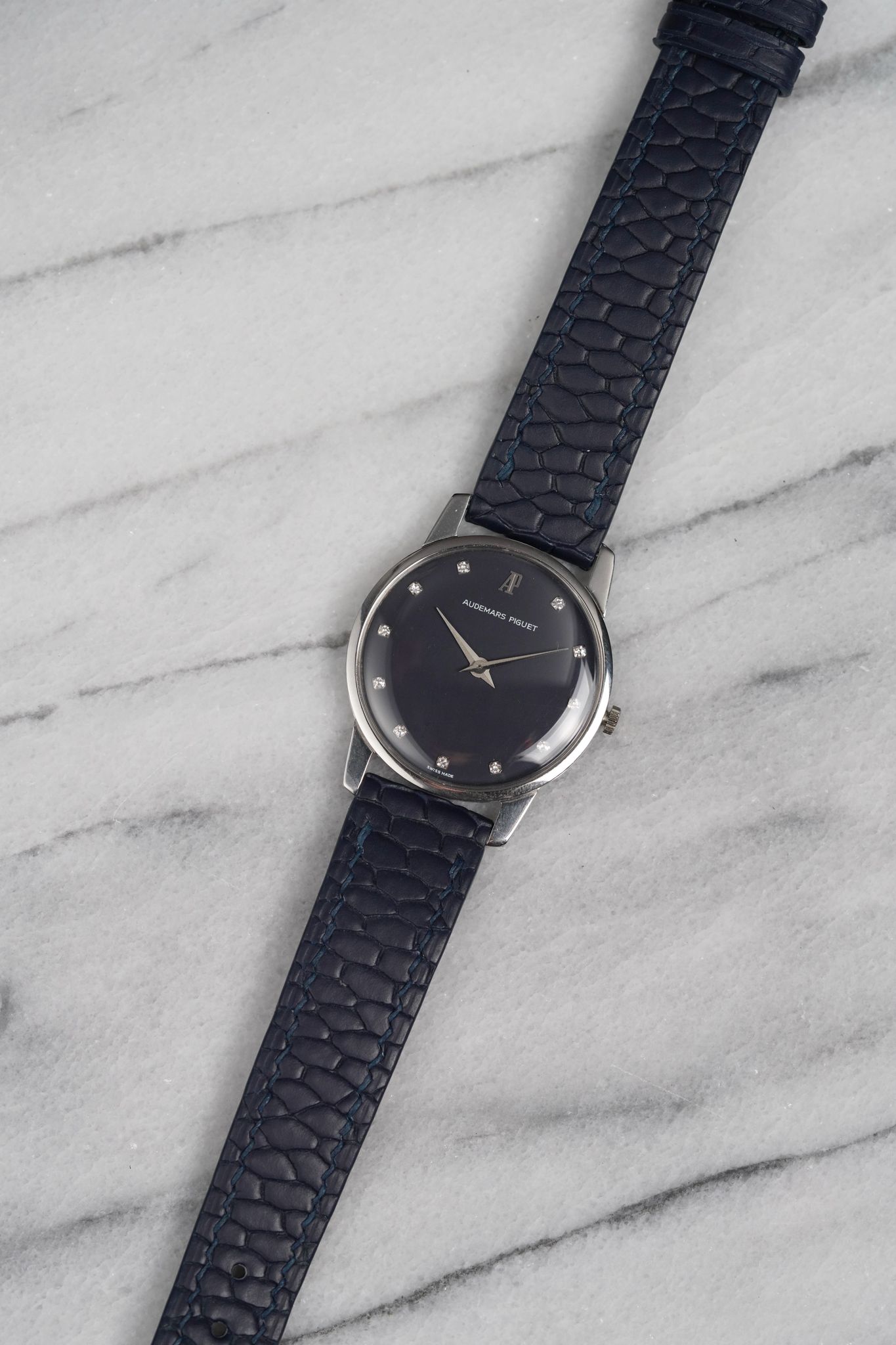 Here’s a Audemars Piguet manual wind with a matte blue diamond dial from the 1970s. Measurements include a 33mm case and 16mm lug width. Fitted on a handmade blue beaver leather strap. Dauphine hands. Factory diamond markers. The blue dial has diamond hour markers. Stainless steel case and caseback. All parts are original including the dial, case, and movement.