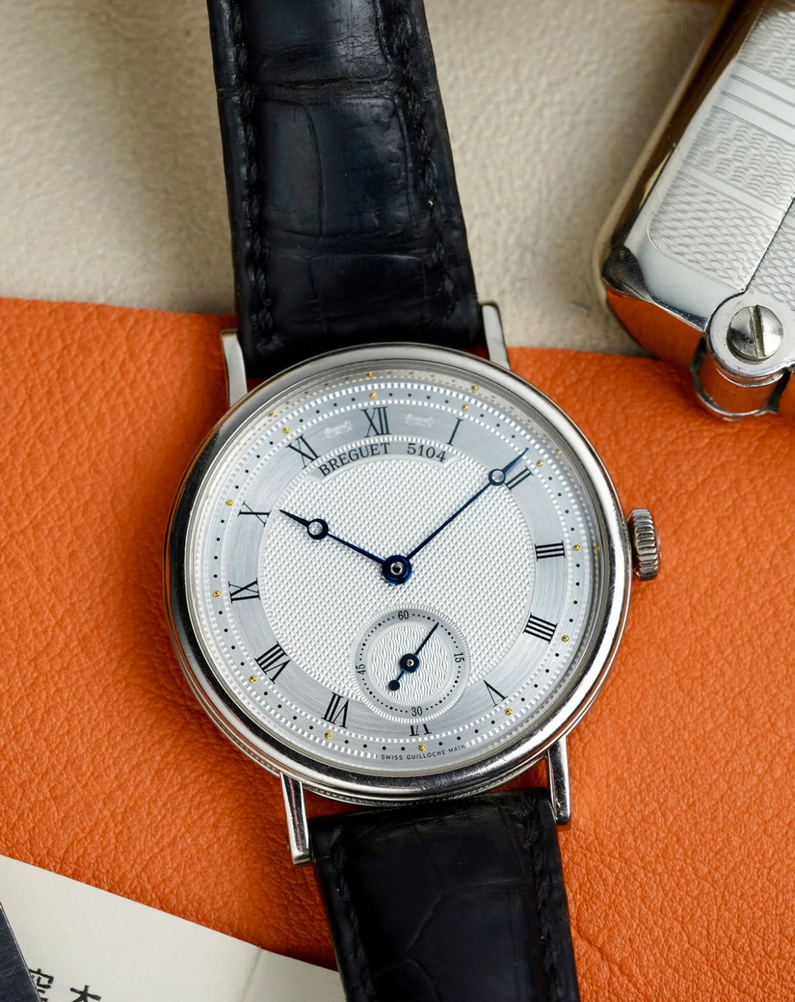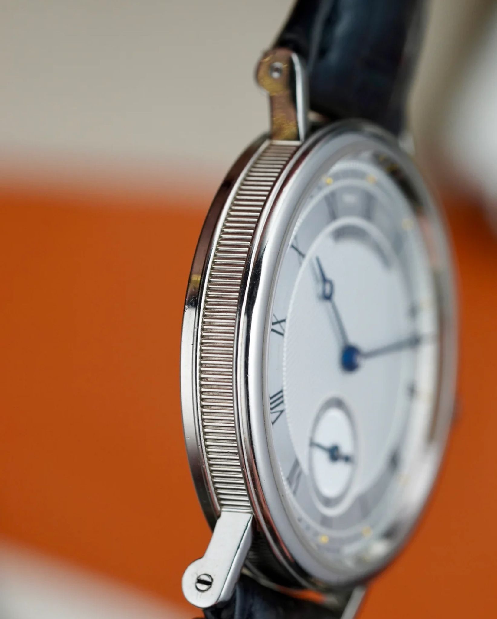 Here's a Classique neo vintage Breguet with a beautifully hand finished guilloche dial in perfect condition. This guilloche dial features Roman numerals and 3 different patterns. Starting in the center we have the hobnail diamond look, the subdial at 6 O’clock has a vertical wave like finish and the outer edge has a nice coin edge finish to match the sides of the case that Breguet is famously known for. The dial has 2 sets of blue hands. The entire case is made out of 18k white gold with a matching buckle and houses a manual wind movement from the early 2000s. The Strap is an original Breguet black Aligator strap. On the flip side we have an open caseback AKA skeleton. Everything is visible and looks amazing from the hand enravings of the Breguet script to the power reserve and balance wheel. Keeps great time and is fully functional. 18K white gold case, bracelet, and caseback 34mm case including the crown. All parts are original including dial, movement, and caseback. Both the dial and case are in great cosmetic, untouched condition.