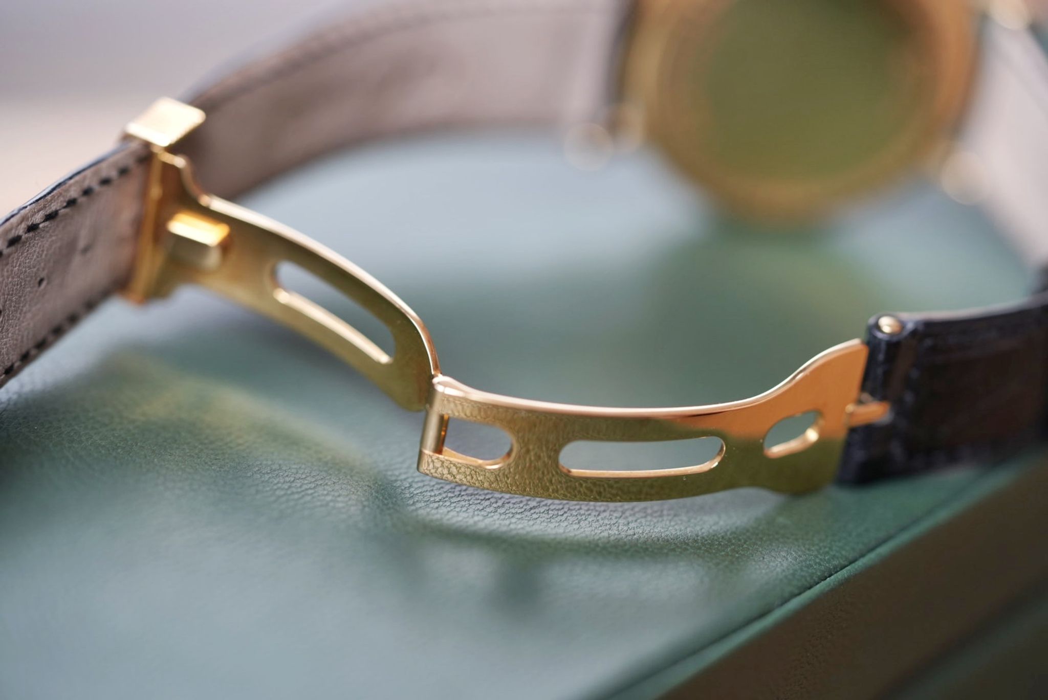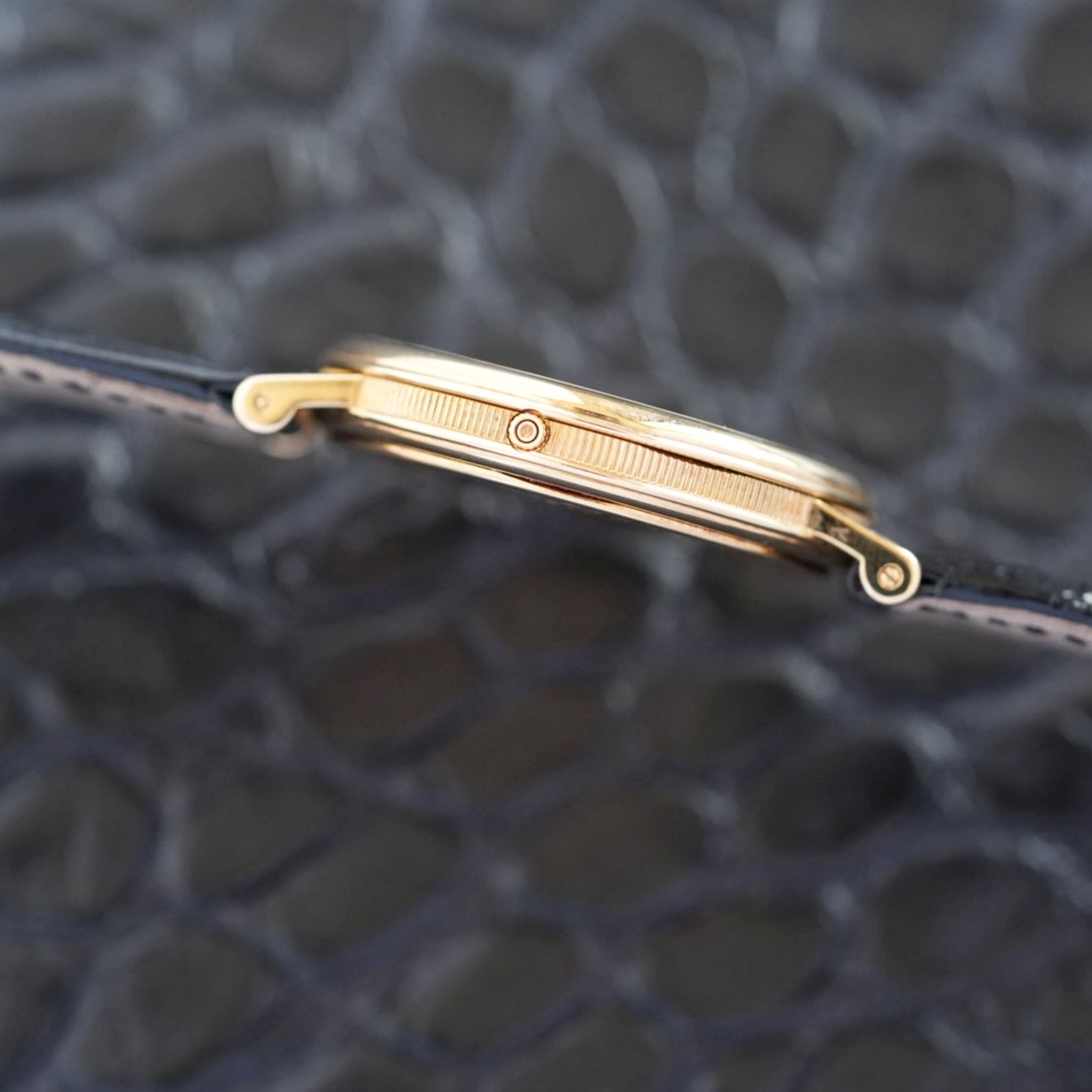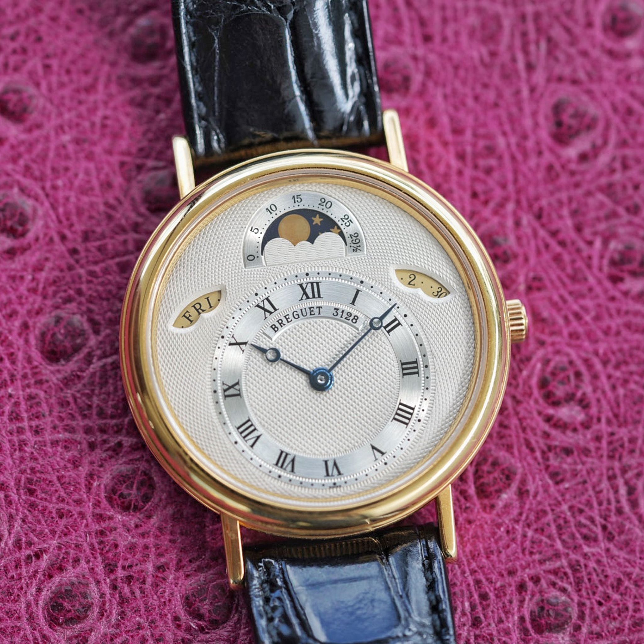 This reference 3330 with a closed caseback and reference number was an earlier production piece as evidenced by the “Swiss” on the dial at 6 o clock, made when Daniel Roth was brought on board to revive the brand. With cues clearly taken from early Breguet pocket watches, it remains a refined and relevant design today. Day, date and moon phase are all clearly displayed on a dial containing different forms of hand guilloche.