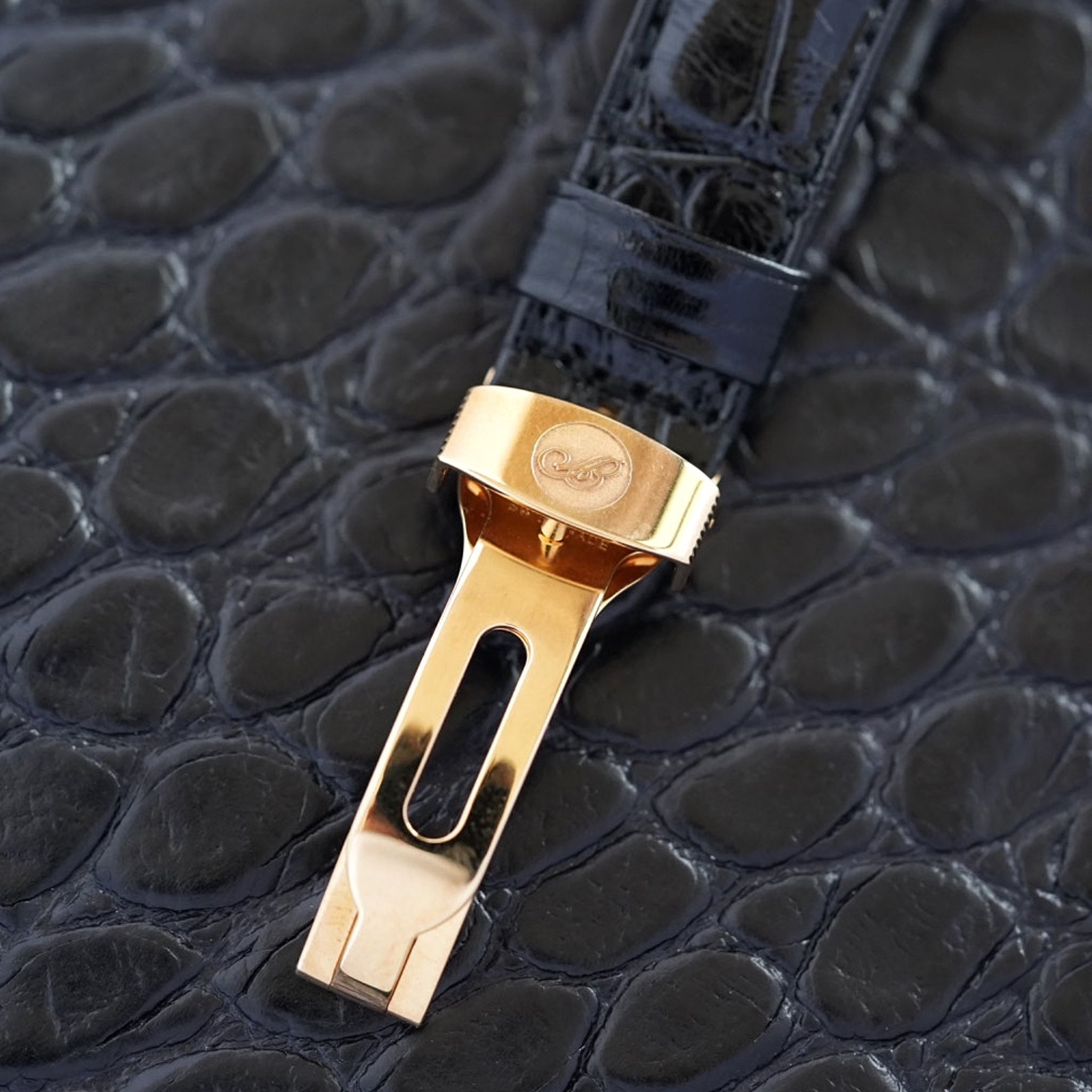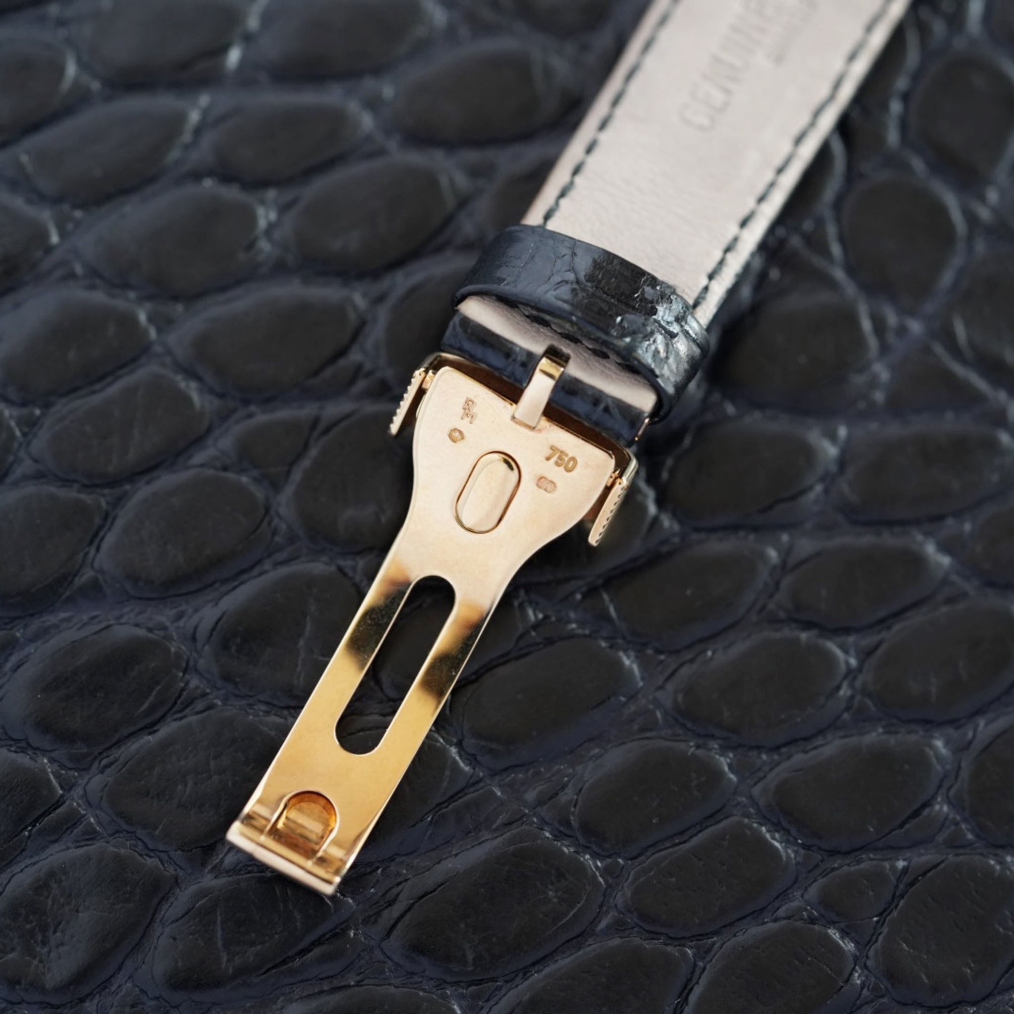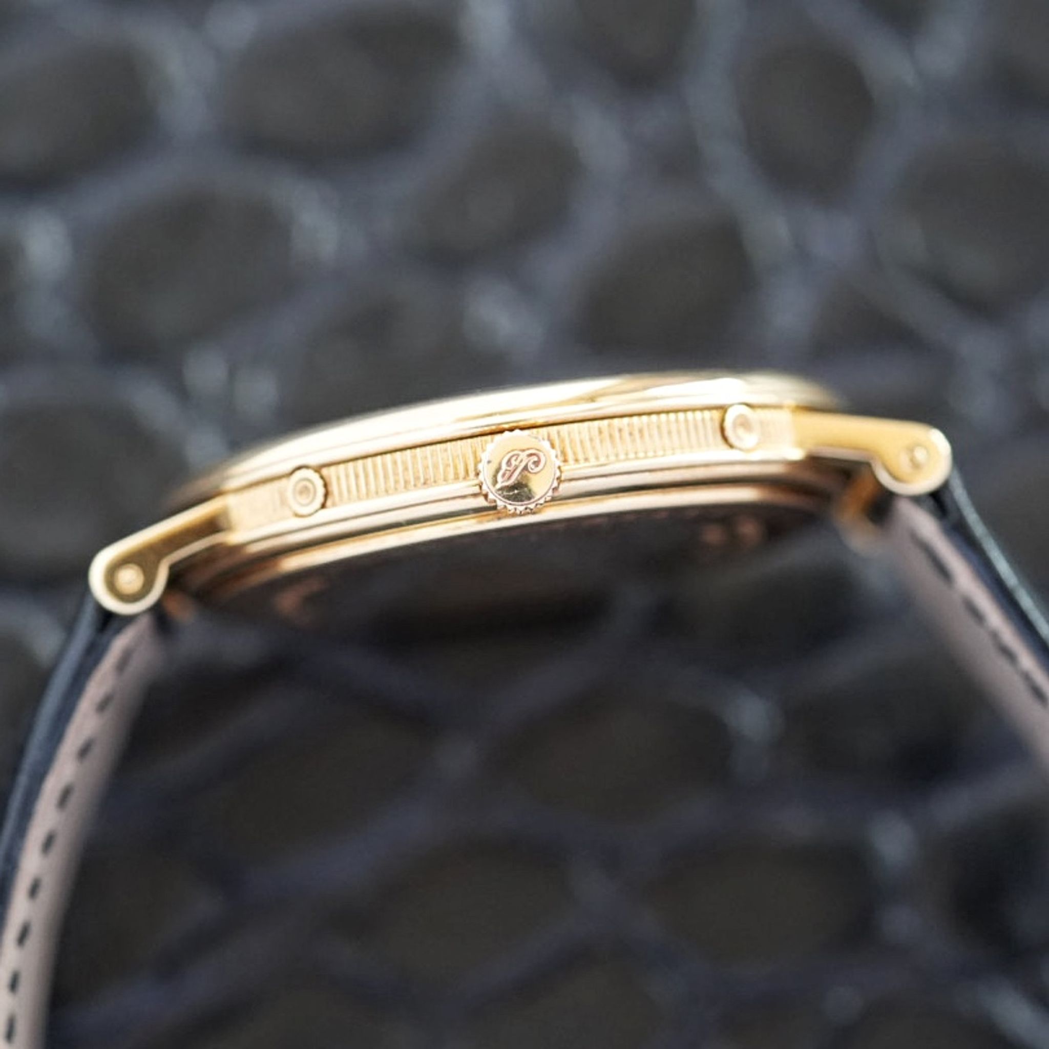 This reference 3330 with a closed caseback and reference number was an earlier production piece as evidenced by the “Swiss” on the dial at 6 o clock, made when Daniel Roth was brought on board to revive the brand. With cues clearly taken from early Breguet pocket watches, it remains a refined and relevant design today. Day, date and moon phase are all clearly displayed on a dial containing different forms of hand guilloche.