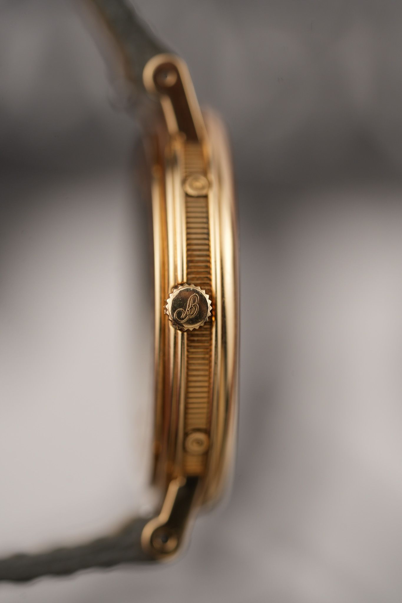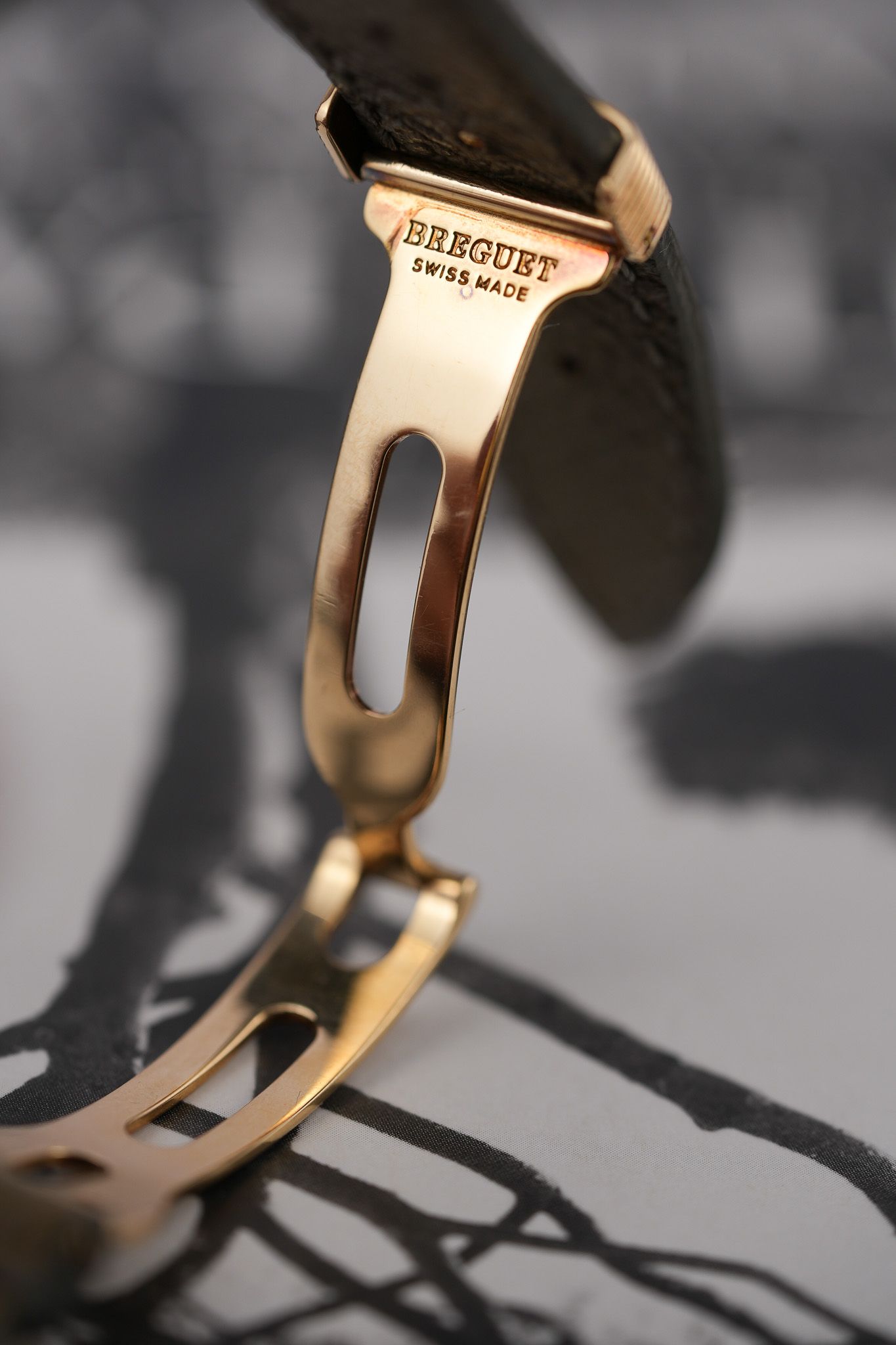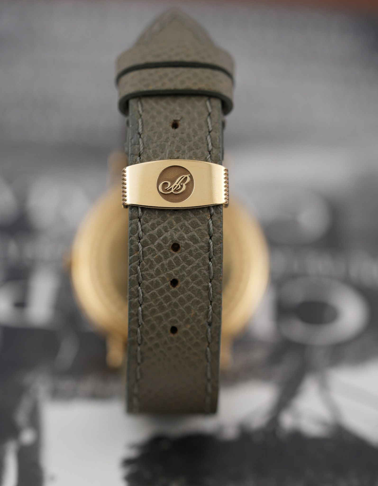 We’ve paired it with a textured grey leather strap to give it a modern edge without robbing it of its formal dignity. If you're more of a purist, the original black Breguet alligator strap comes with it. Your call—either way, the original solid gold deployant buckle with its discreet ‘B’ insignia tags along for the ride. Hidden when closed, adjustable, elegant. Just like the rest of the watch.