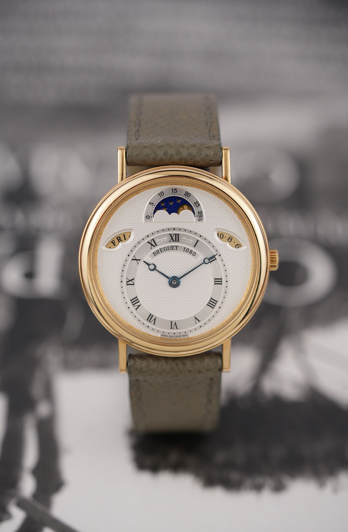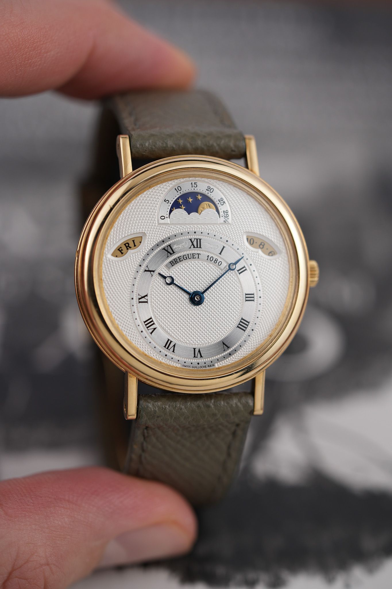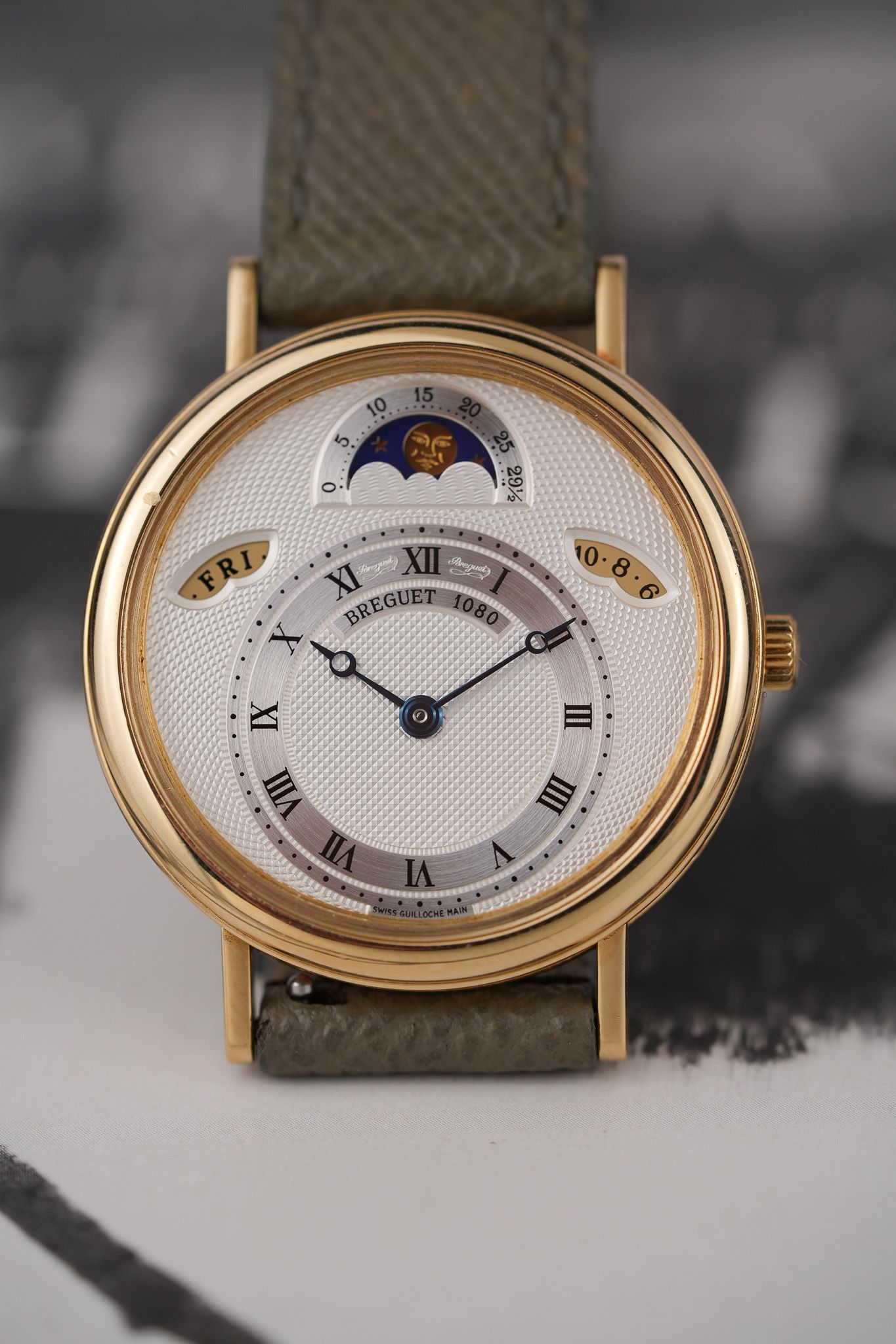 The case is 36mm of 18K yellow gold, wrapped in Breguet’s signature fluted coin-edge bezel. Each function—day, date, moonphase—is adjusted with tiny pushers subtly integrated into the side, keeping the case silhouette clean and perfectly balanced. There’s no crown clutter here. Just quiet sophistication.
