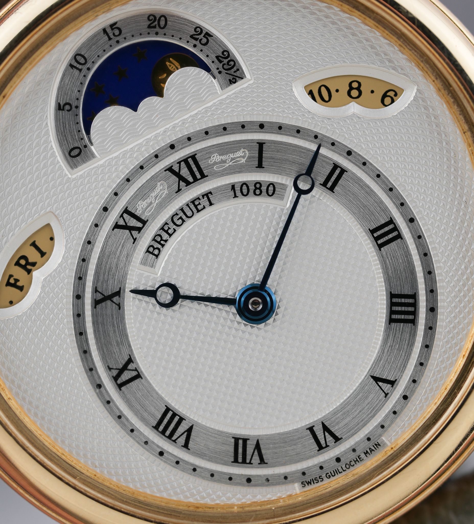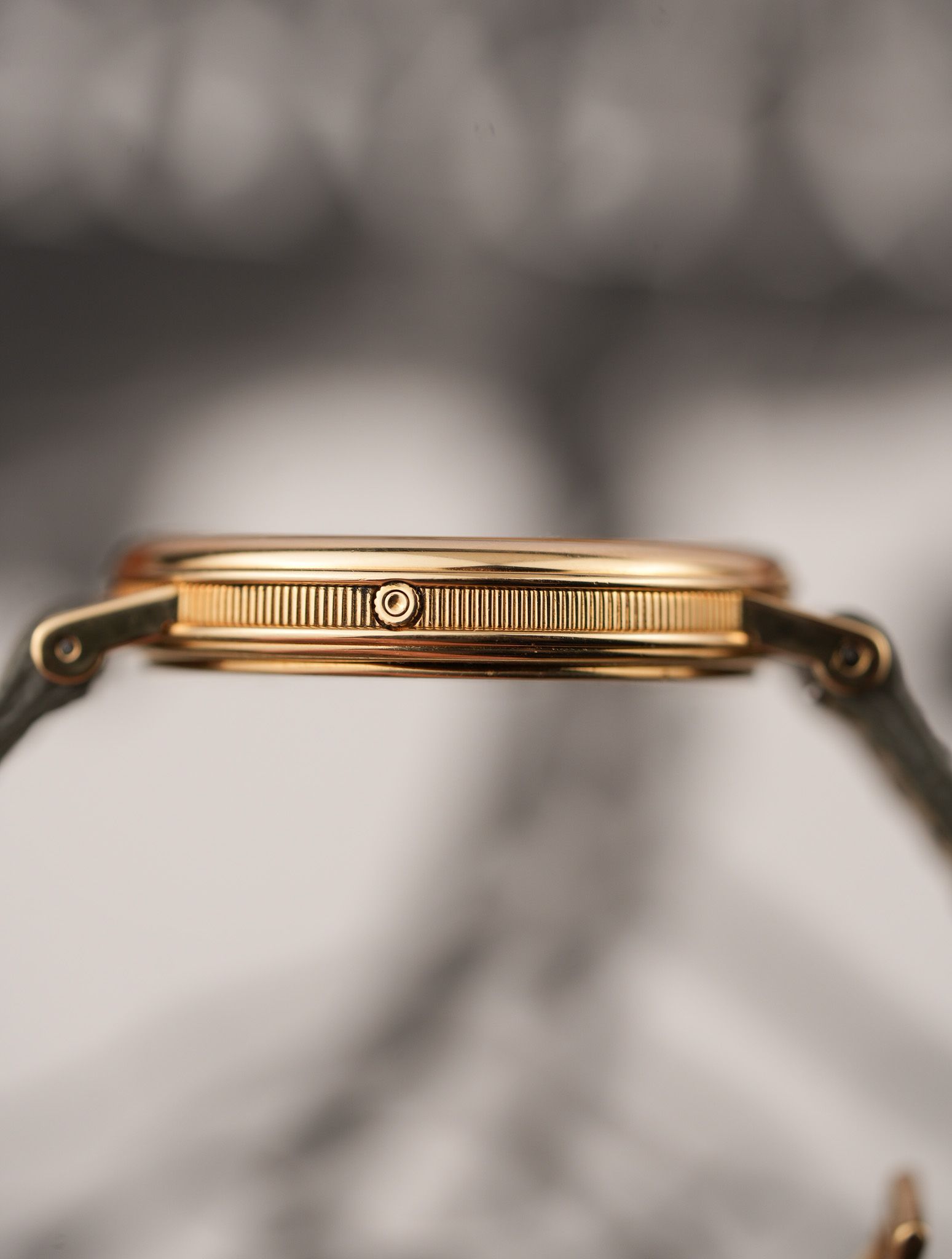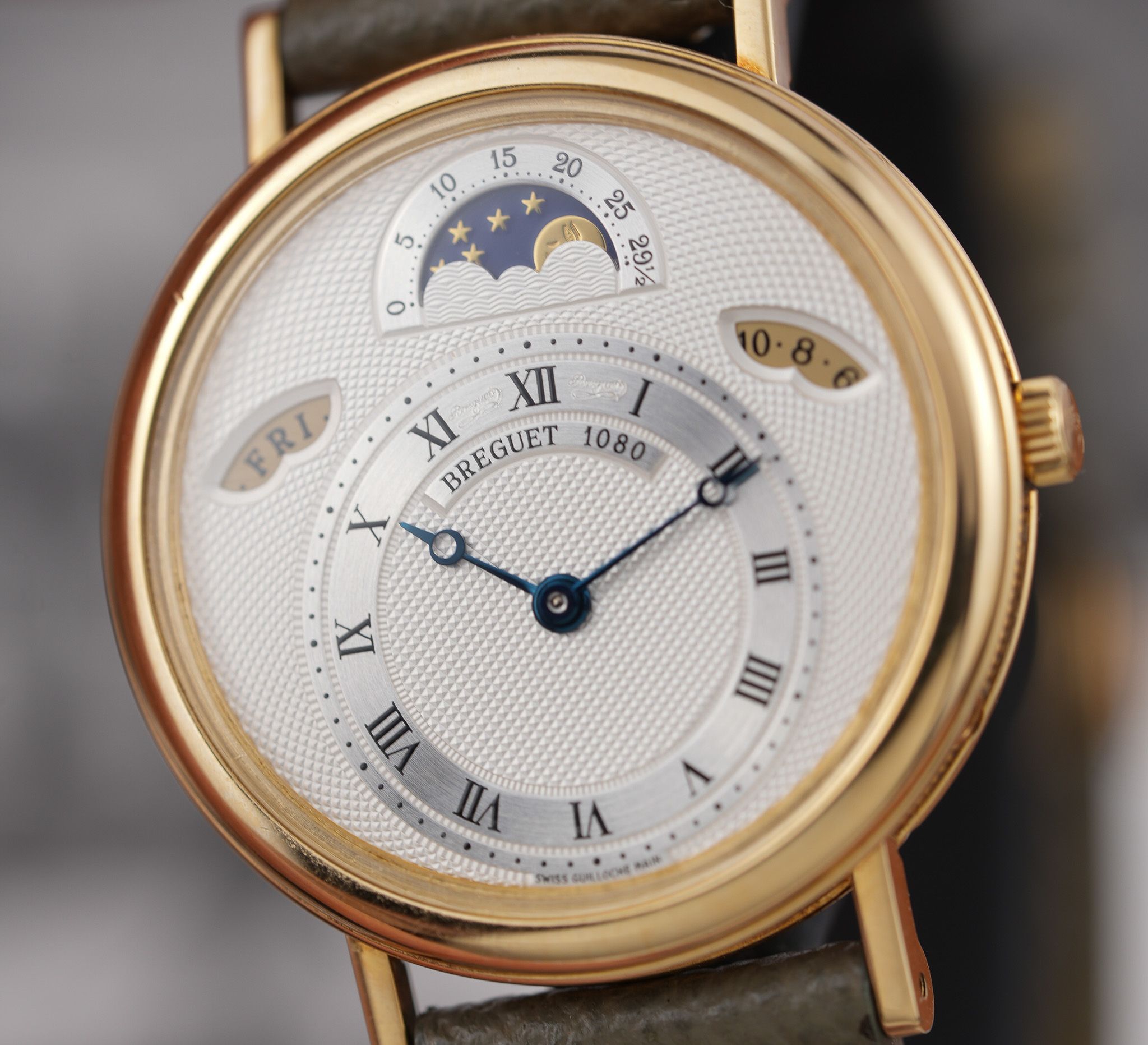 The case is 36mm of 18K yellow gold, wrapped in Breguet’s signature fluted coin-edge bezel. Each function—day, date, moonphase—is adjusted with tiny pushers subtly integrated into the side, keeping the case silhouette clean and perfectly balanced. There’s no crown clutter here. Just quiet sophistication.