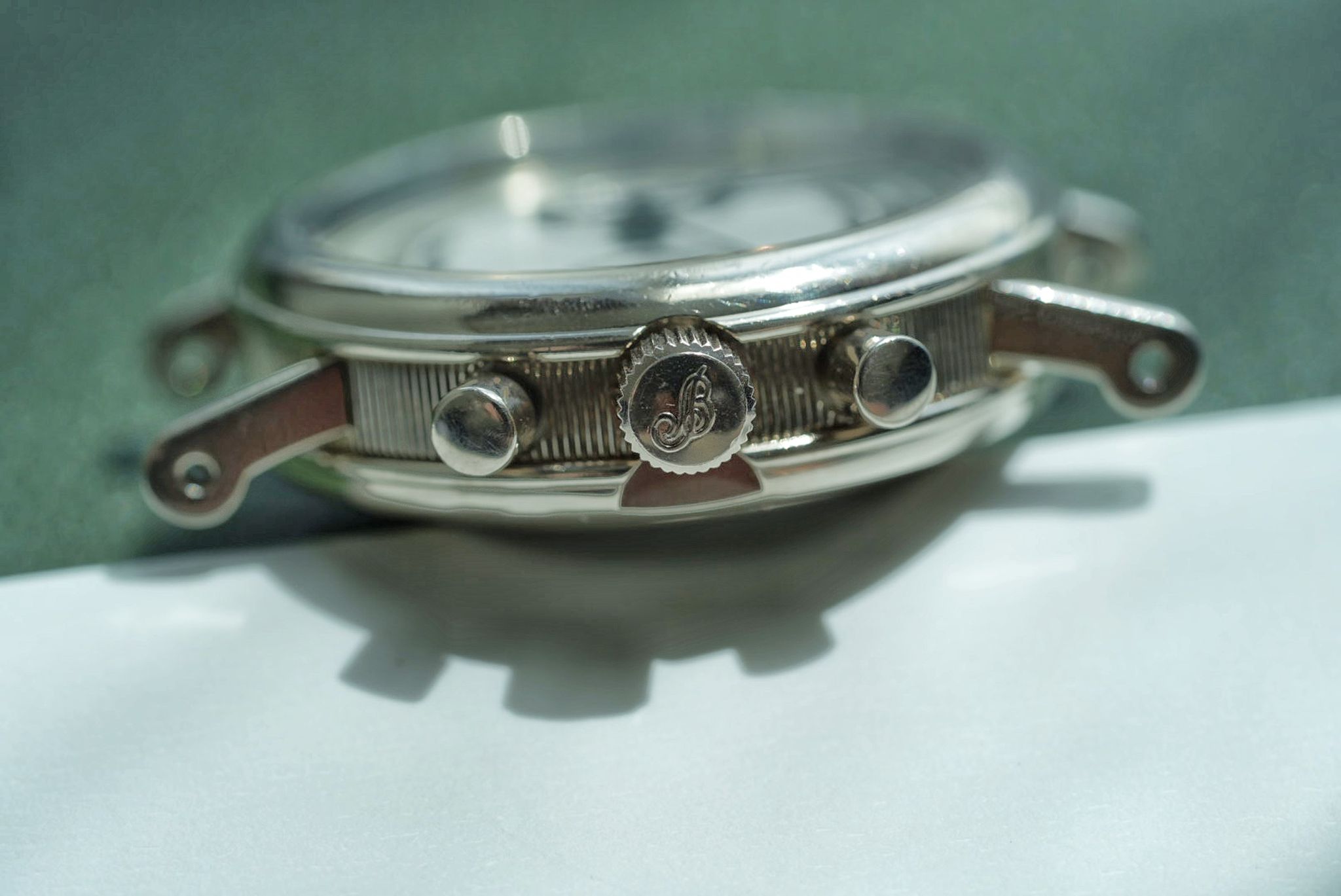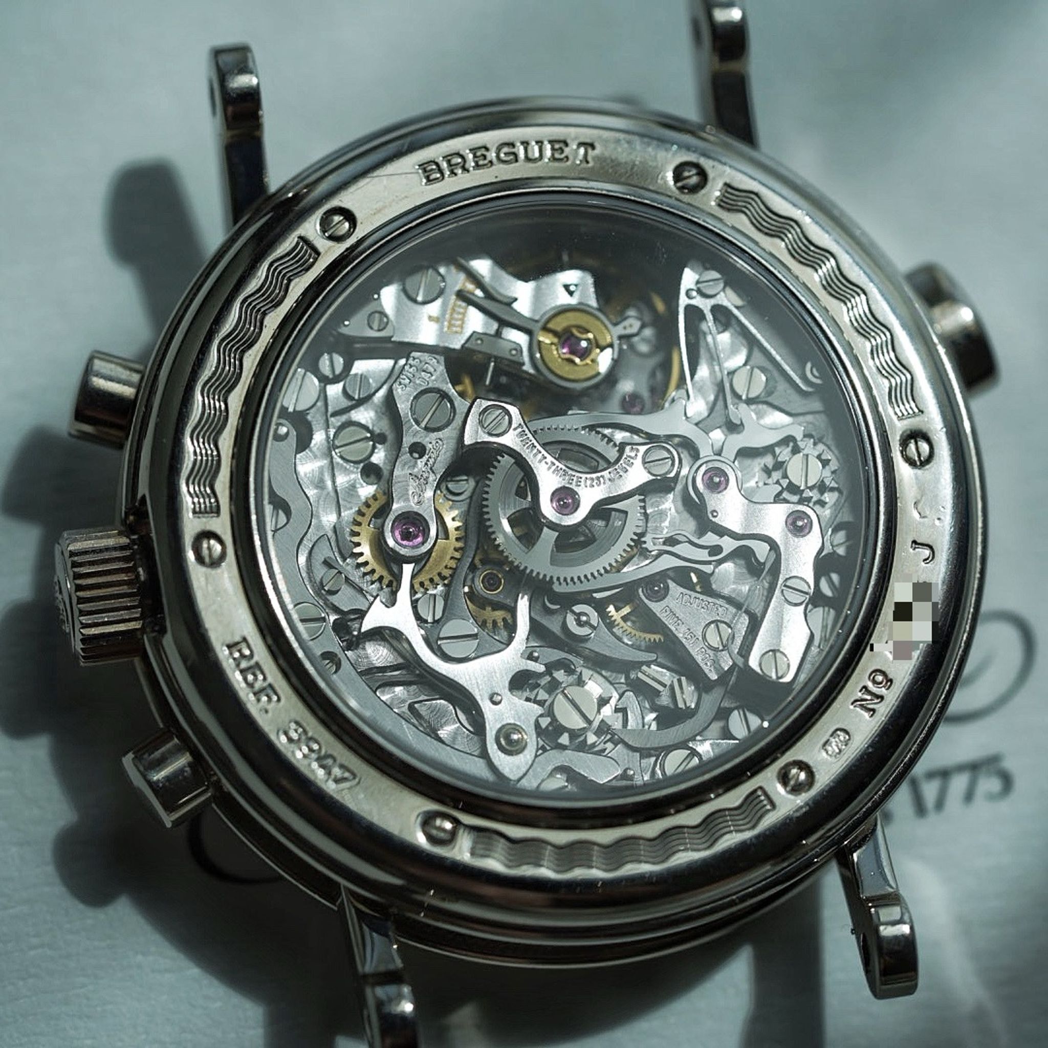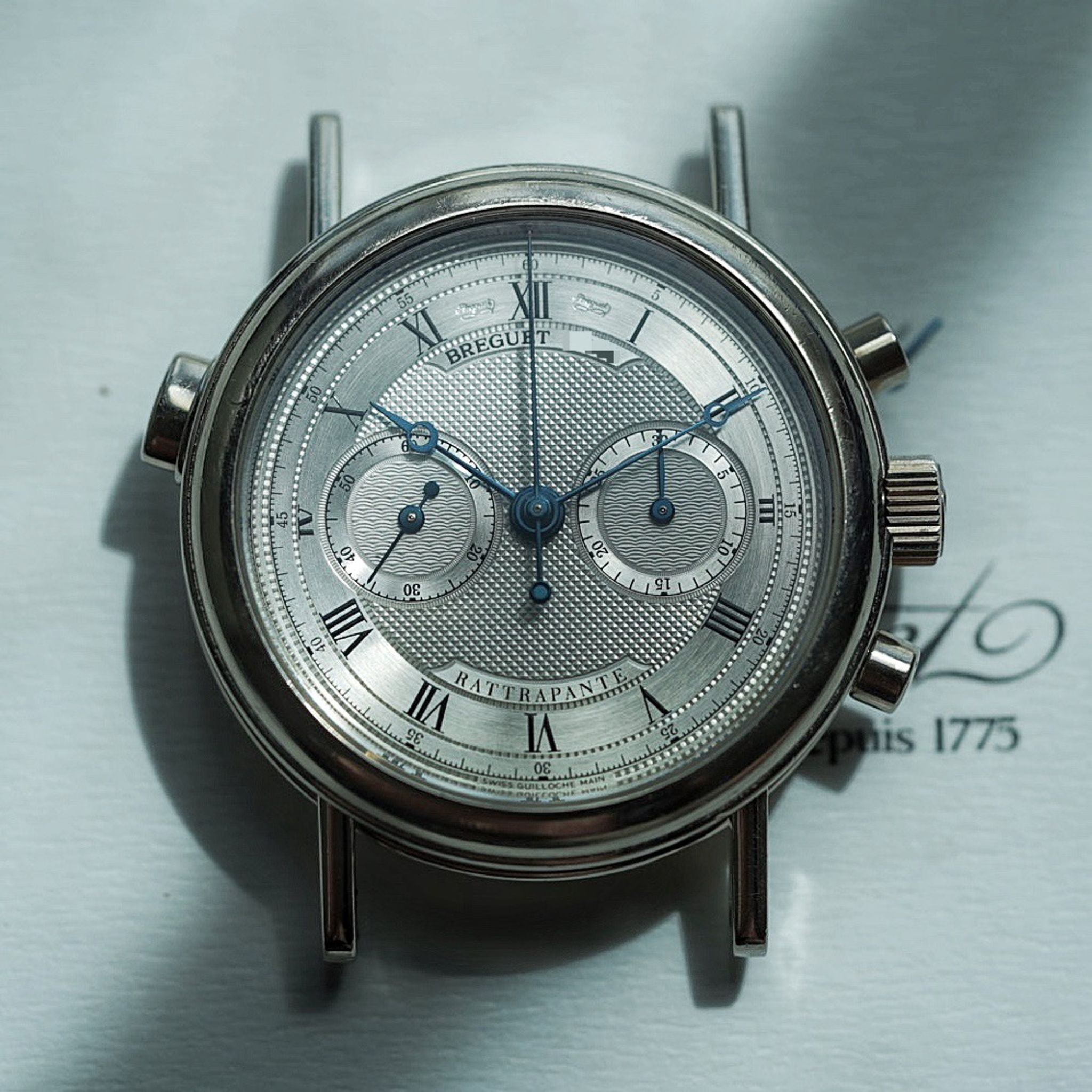 Its silvered solid-gold dial is entirely hand-guilloché, combining clous-de-Paris, circular graining, and contrasting textures within the subdials for depth and elegance. Heat-blued Breguet hands, Roman numerals, and the discreet “Rattrapante” script at six complete this harmonious composition. Produced in limited numbers before discontinuation, the 3947 represents one of Breguet’s most sophisticated neo-vintage chronographs, blending movement pedigree with timeless design.