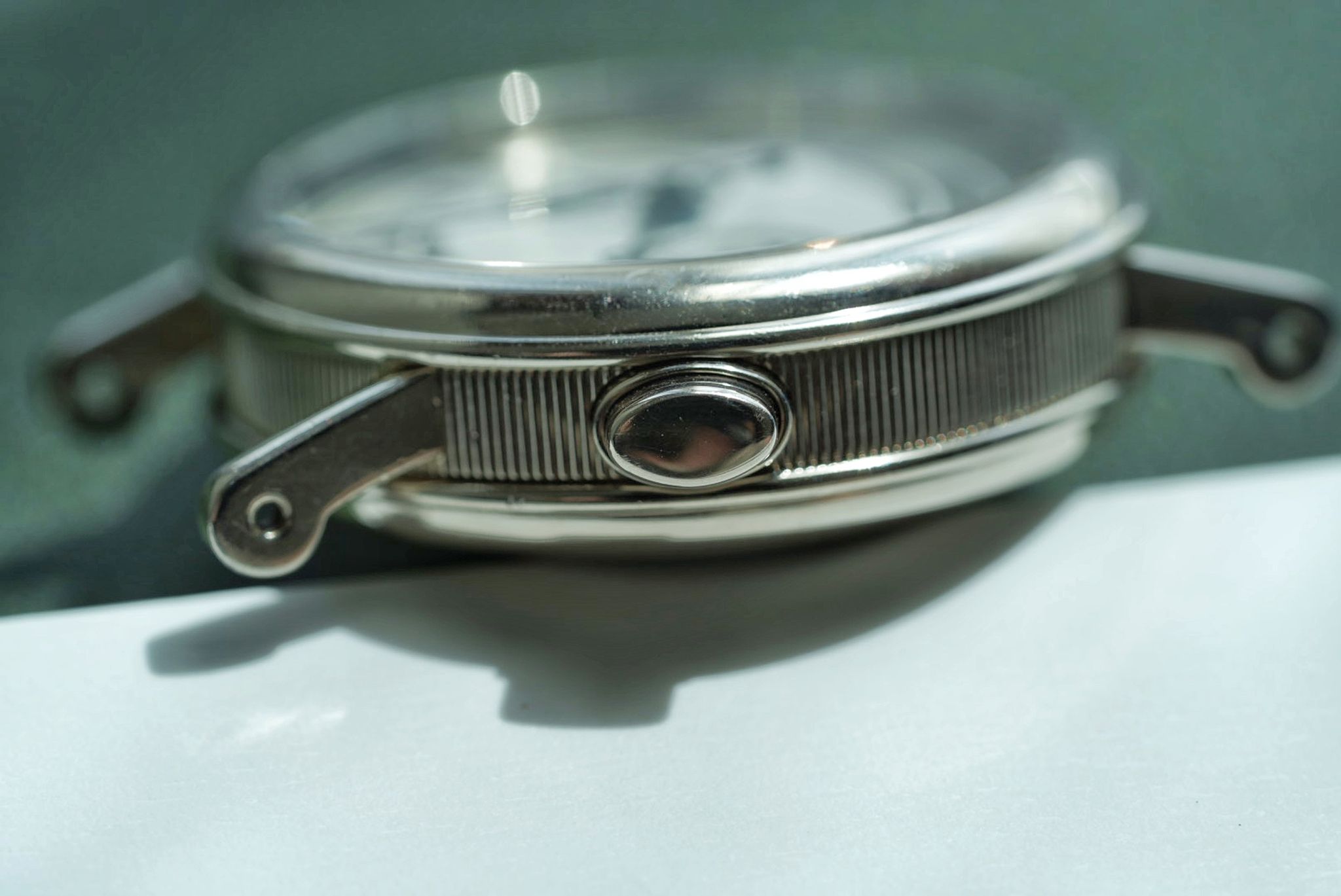 This elegant split-seconds chronograph from the late 1990s–early 2000s embodies Breguet’s classical codes: a 38mm fluted white gold case, straight lugs, and a sapphire display back showcasing the finely finished manual-wind rattrapante movement based on the revered Lemania 2320. The additional pusher at 10 o’clock controls the split-seconds hand, a complication celebrated for its technical refinement and rarity at this level.