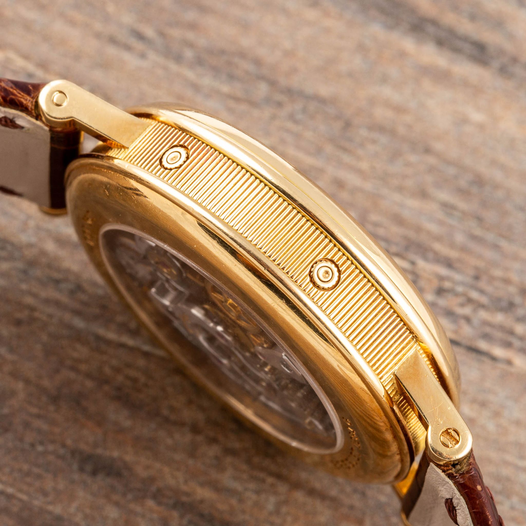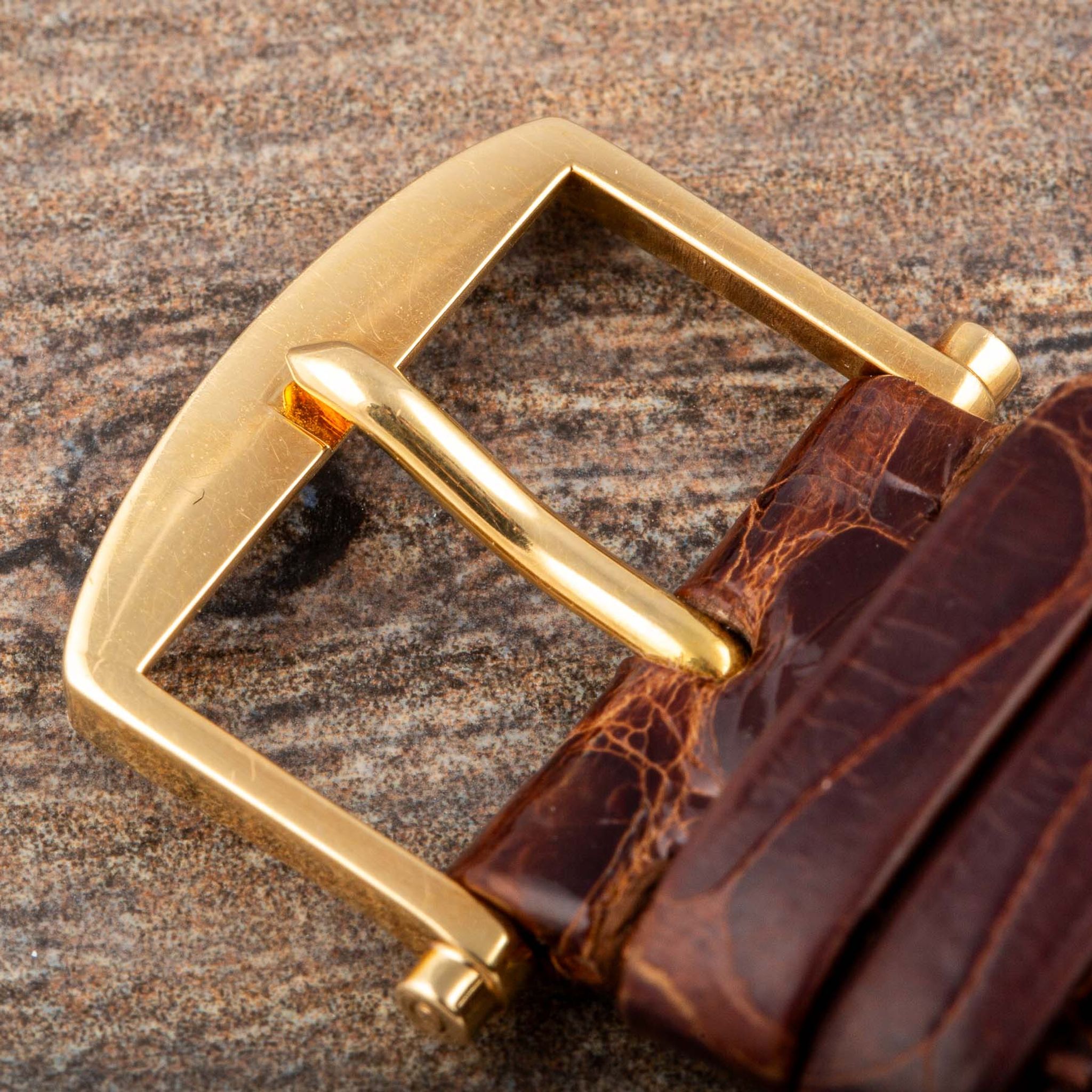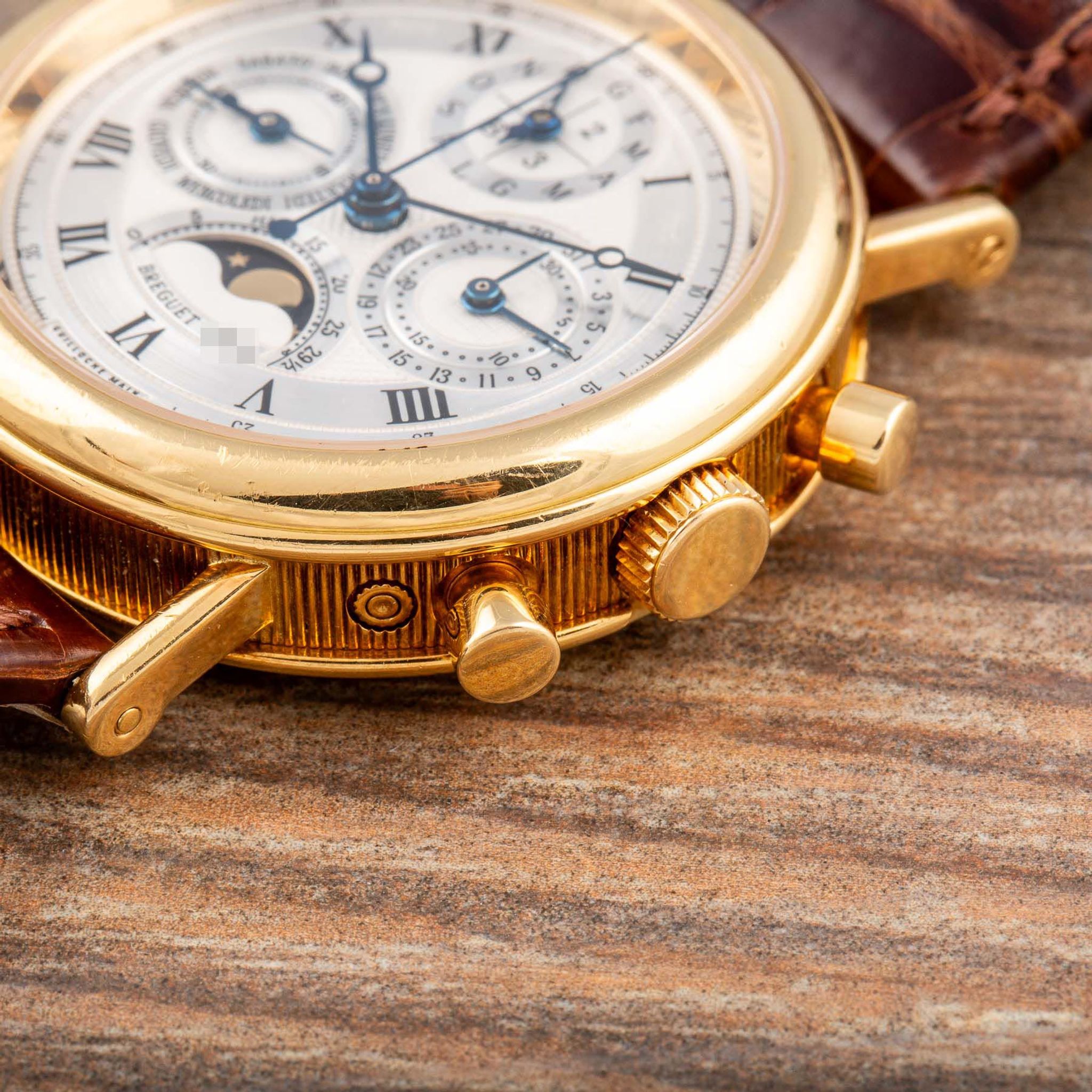 The present watch is an exceptional Breguet wristwatch manufactured in the early 90’s. It bears the reference 3617 and features an exquisite Lemania based movement with a perpetual calendar and chronograph complication. Reference 3617 predates the well-known Breguet Perpetual Calendar Chronograph 5617, originating in the early 2000s. The two watches share almost identical features, with the primary distinction being the screw-back case on the 5617. Collectors highly value the earlier 3617 model, as it was produced in fewer numbers compared to the more recent 5617, making it a sought-after piece in the watch-collecting community. The overall condition is truly exceptional, likely unpolished with factory finishes still intact. The dial has no spots or scratches, and the fine movement is in perfect working order.