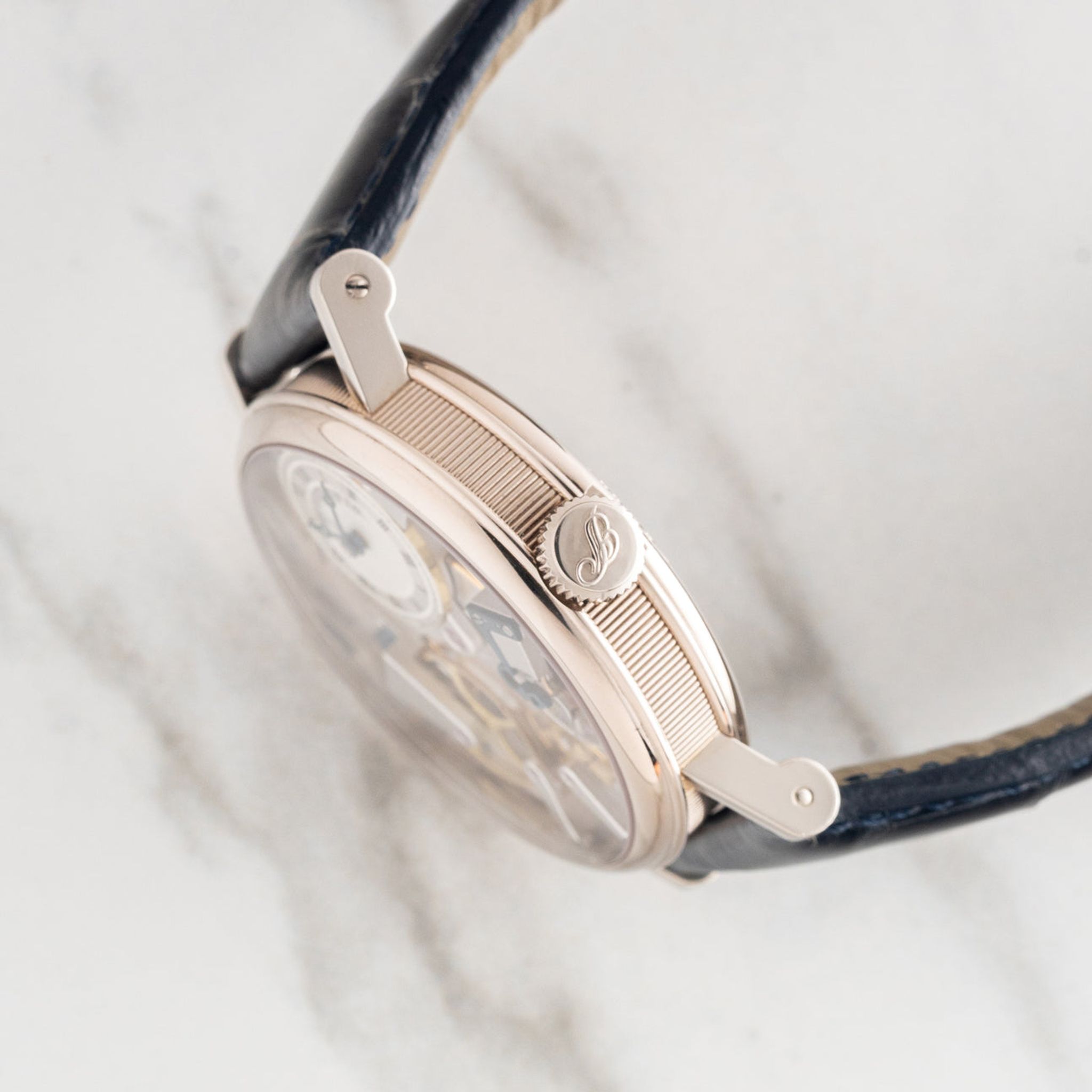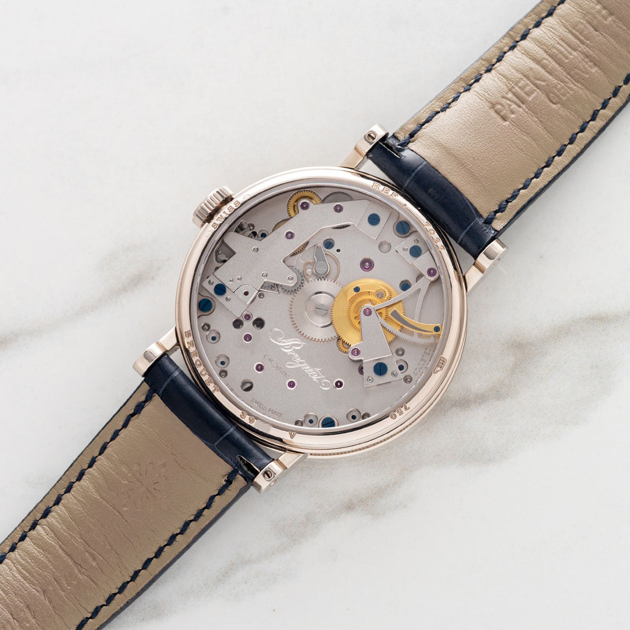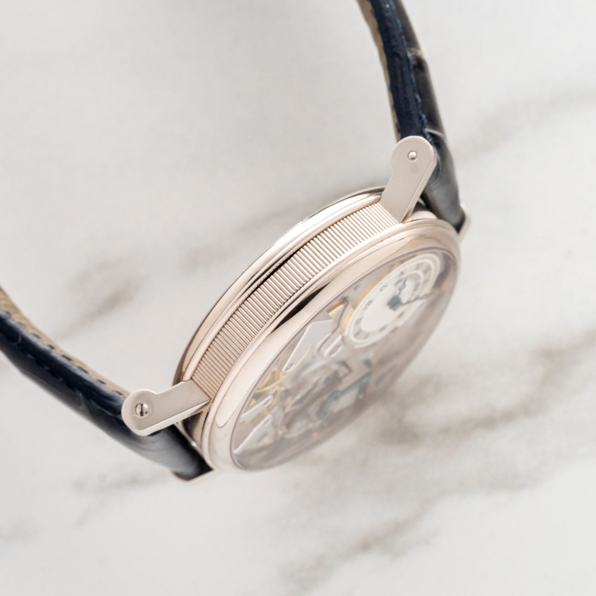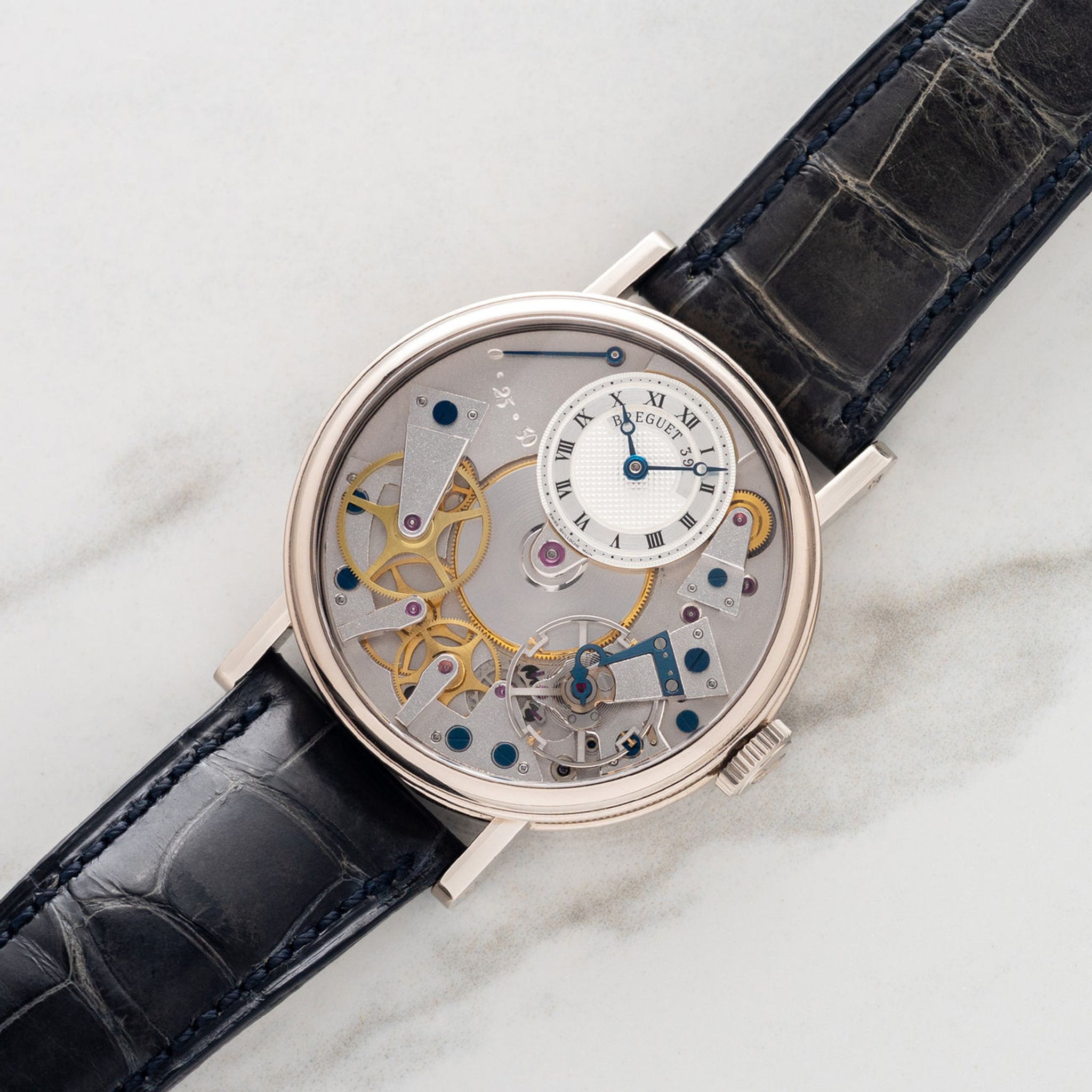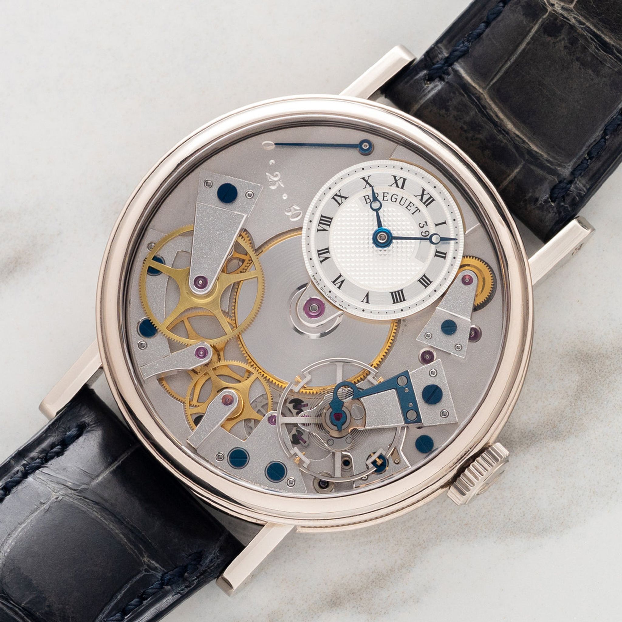 First introduced in '05, the La Tradition collection pays tribute to the brands legacy in haute horlogerie. True to its name, the ref. 7027BB boldly displays its mechanical movement on the dial side, with a small off-centered time display adding to its distinctive aesthetic. It features a monochromatic rhodium-treated movement paired with a silver engine-turned dial, housed in an elegant 18k white gold case. Signature Breguet details such as heat-blued screws, exposed brass wheels, and a coin-edge caseband emphasize the brand’s dedication to traditional craftsmanship. The 37mm case—featuring straight lugs and a domed bezel—strikes a perfect balance between classical elegance and modern design philosophy. For the discerning collector, this full set example has remained in fantastic condition with an unpolished case.