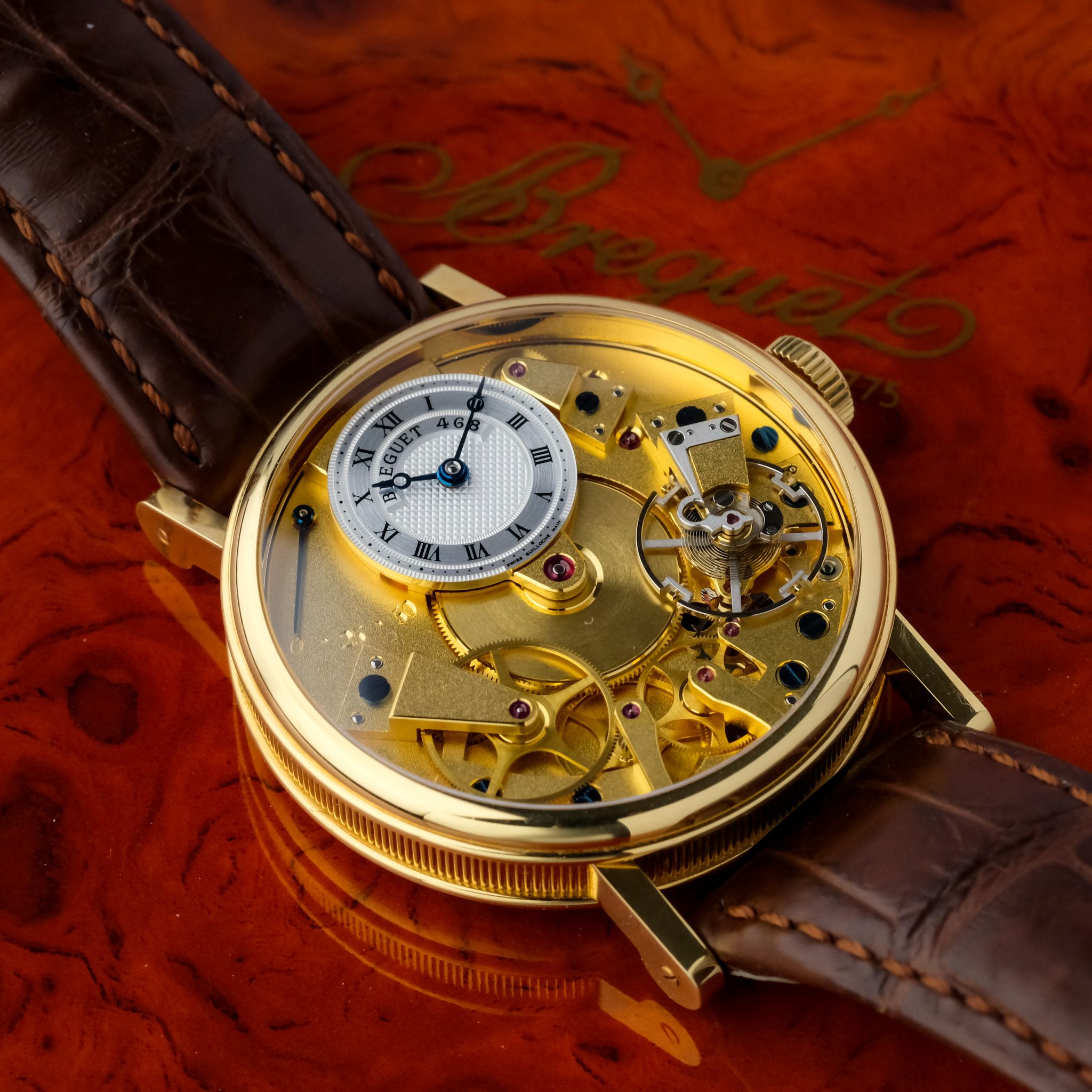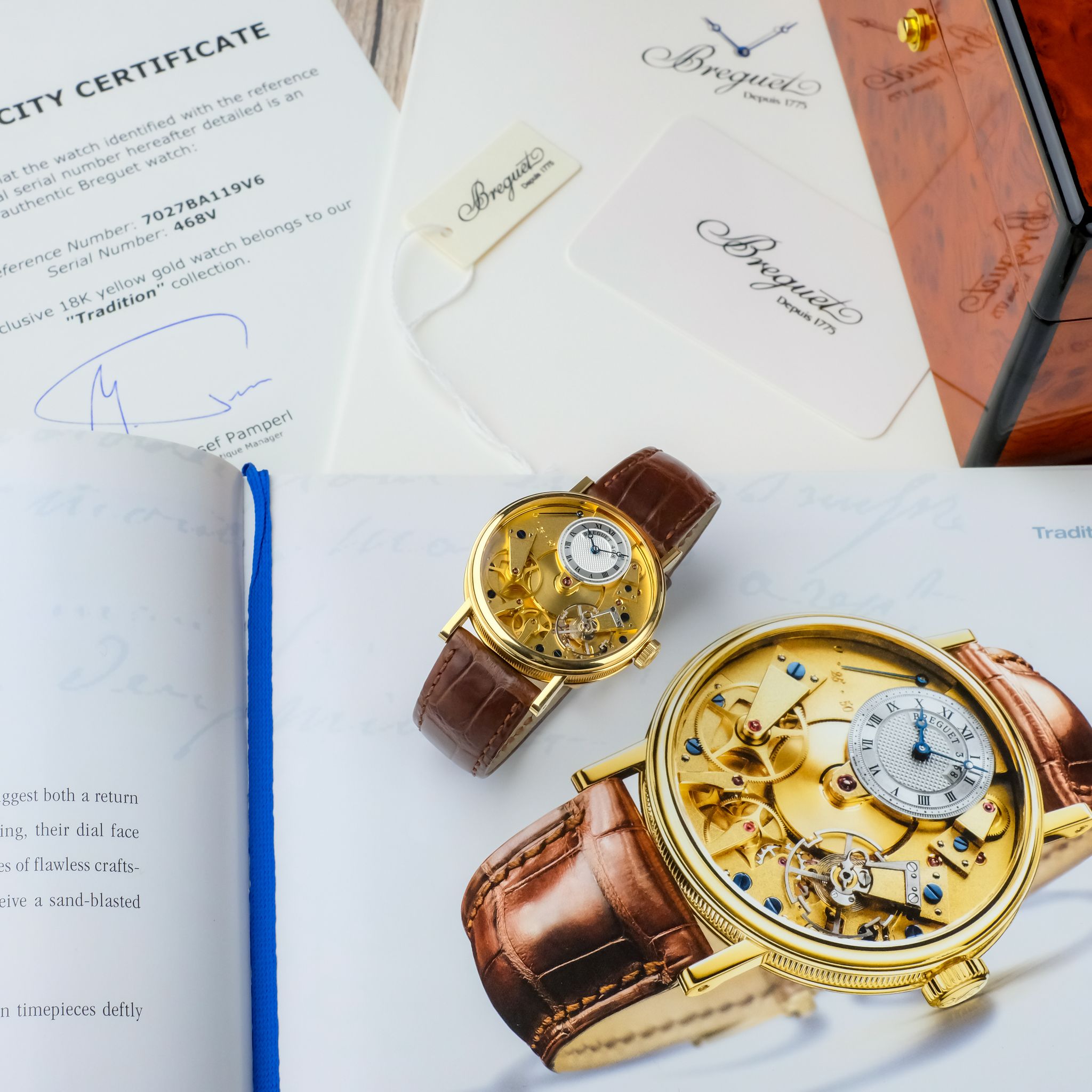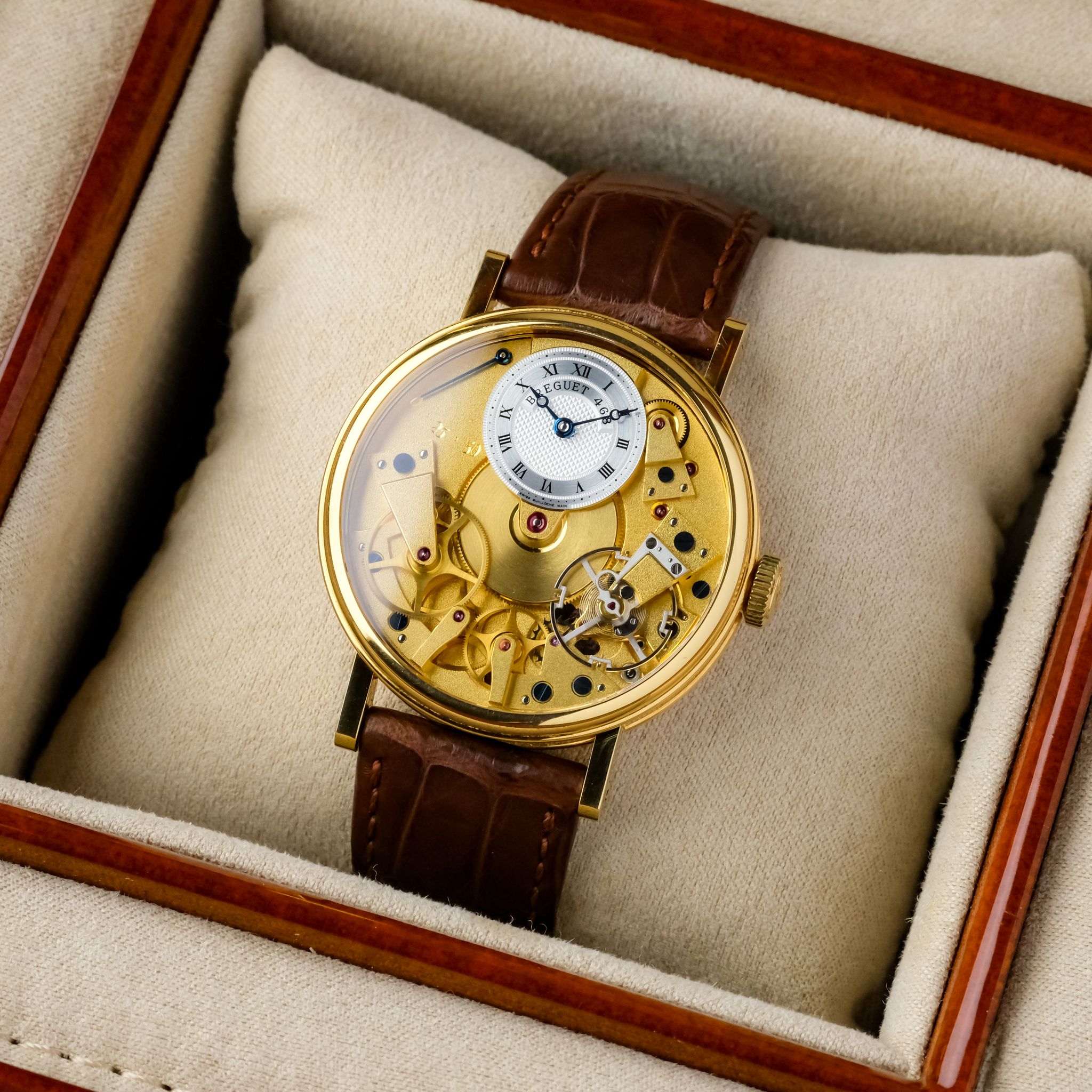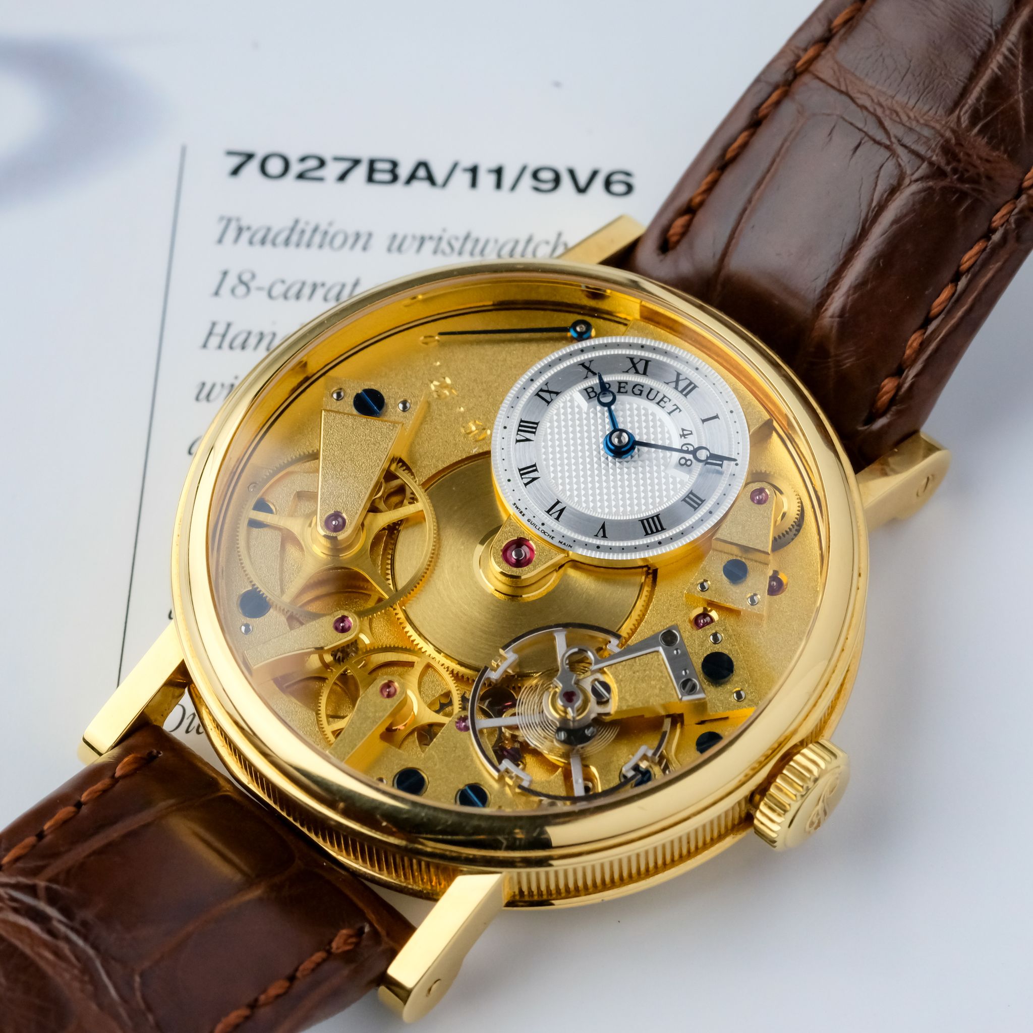 super cool neo-vintage Breguet Tradition ref. 7027 in 18k yellow gold in superb condition accompanied by the fullest. This piece appears to be rarely worn and has only very light scratches, the movement is very clean and tidy and the bevels are still sharp. It still has the original strap as well as buckle and the box and booklets, though the papers got lost so the original owner had a certificate for it done by Breguet.