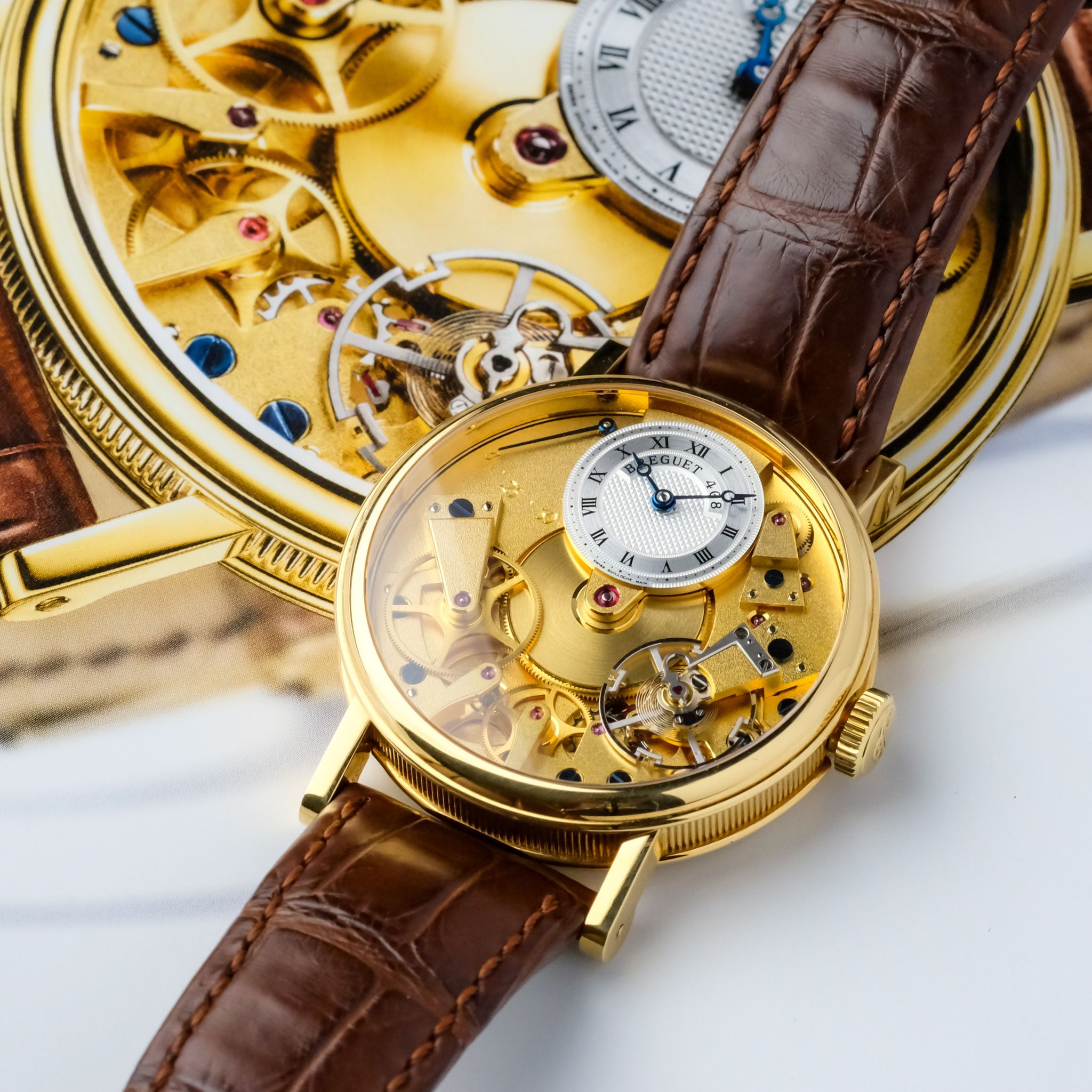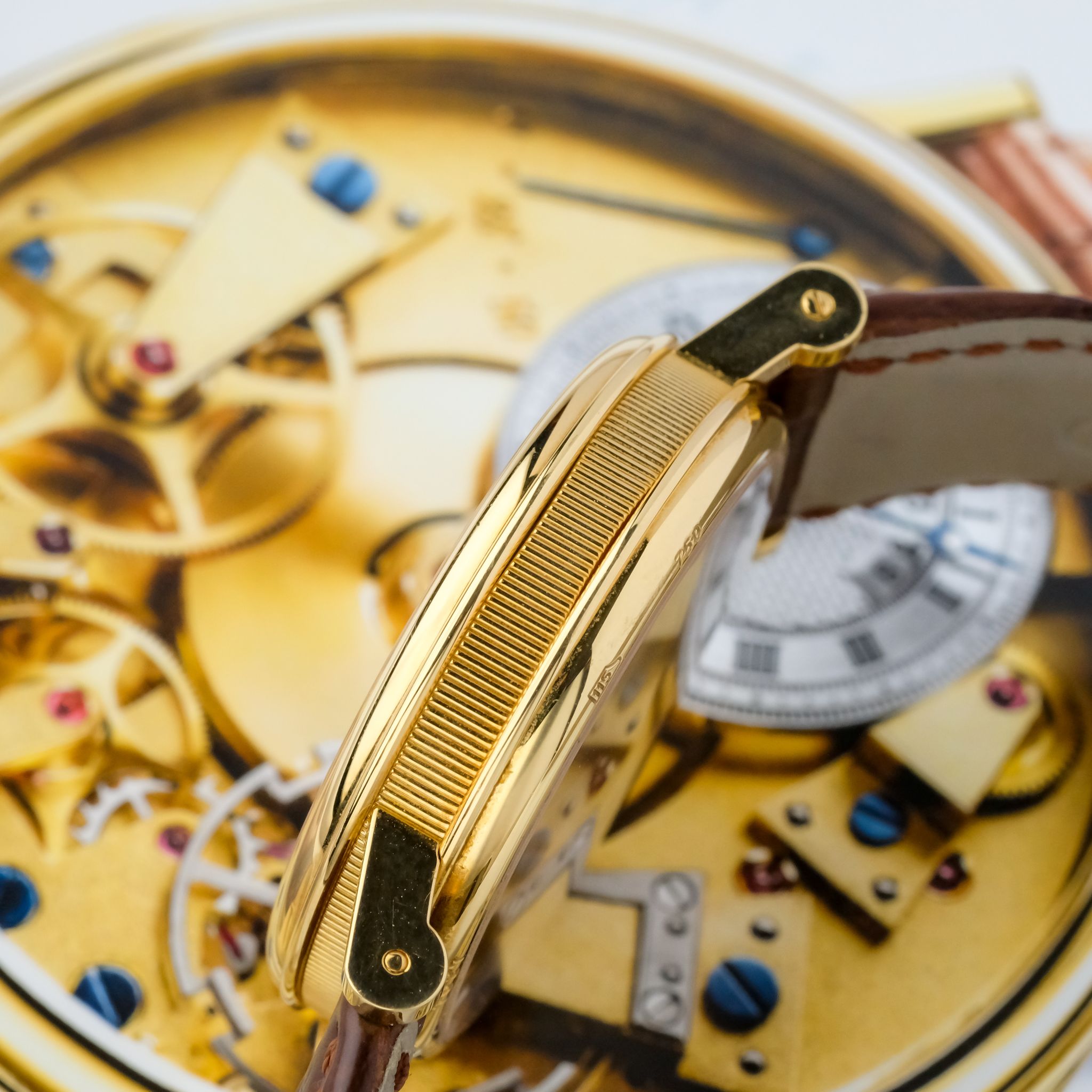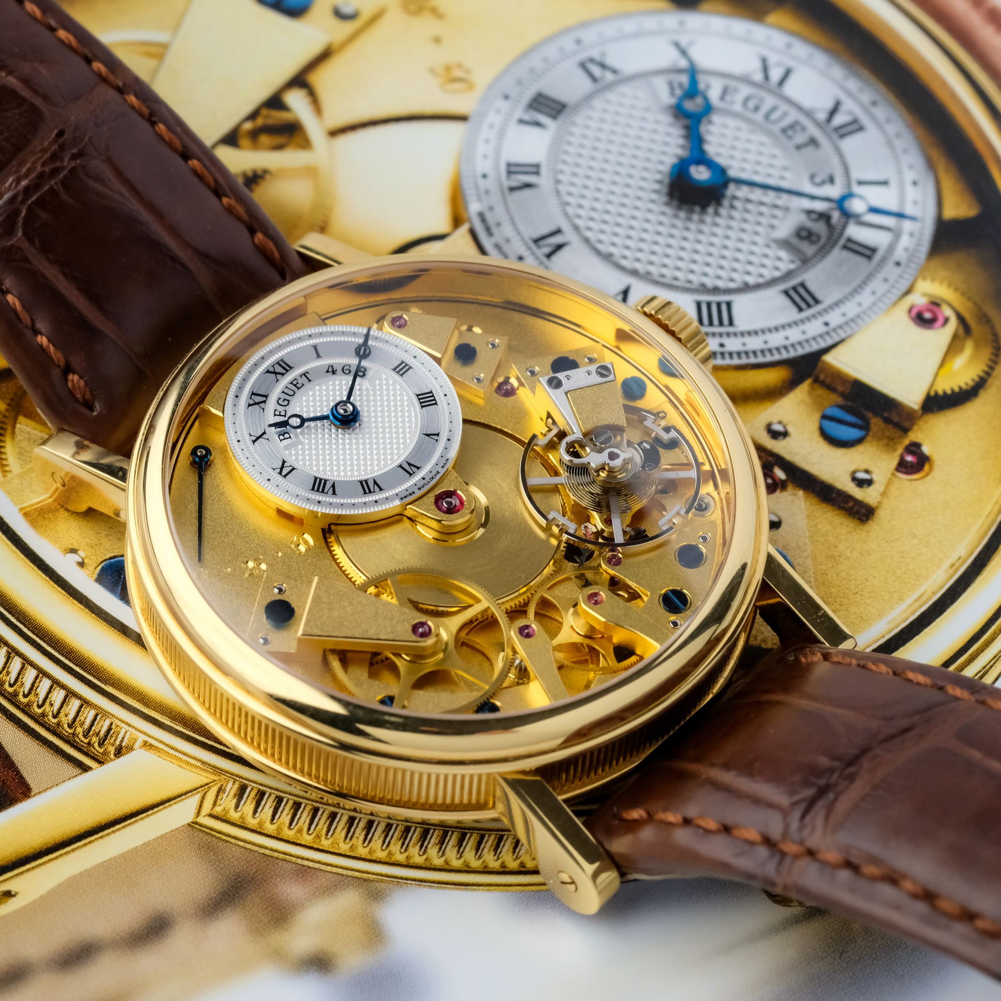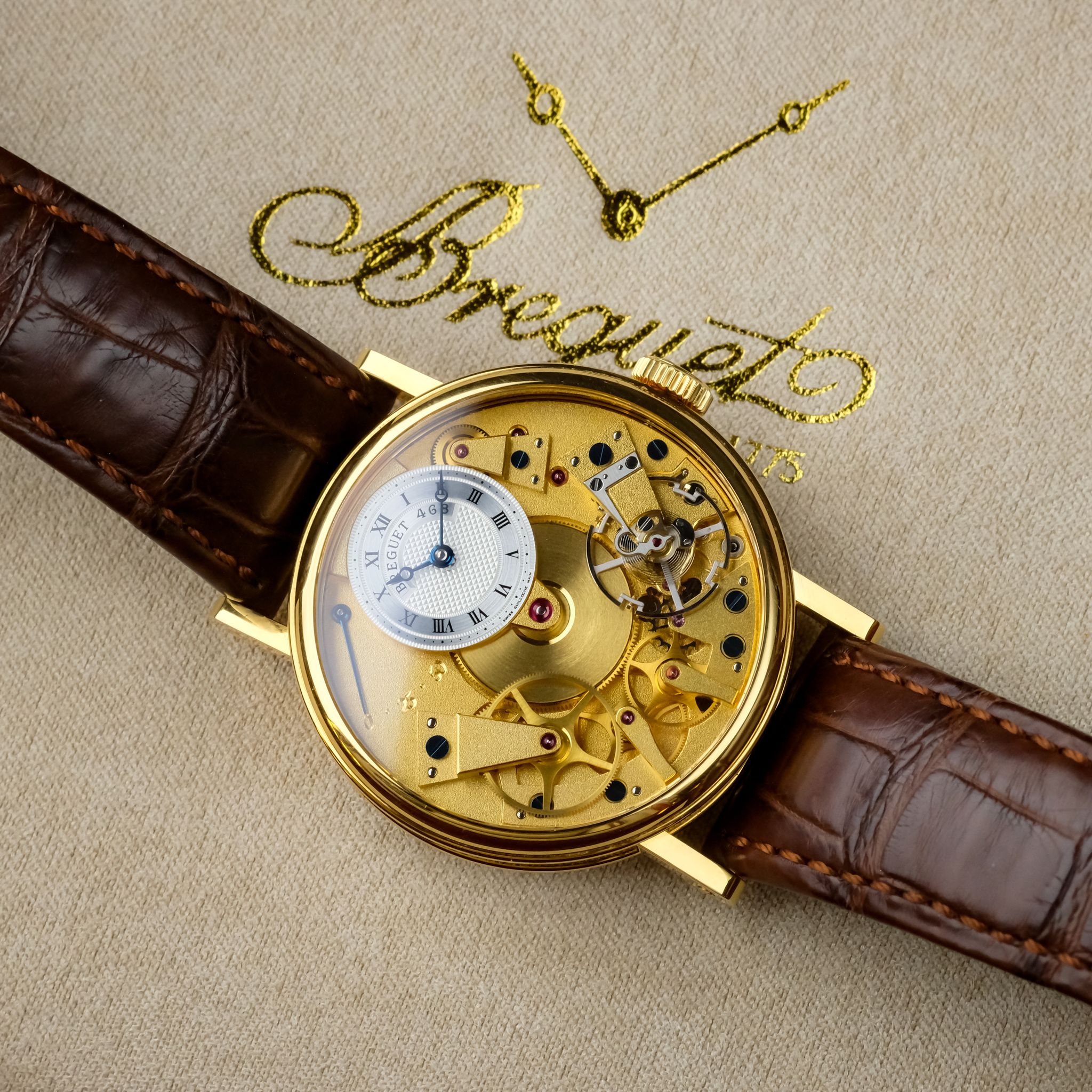 super cool neo-vintage Breguet Tradition ref. 7027 in 18k yellow gold in superb condition accompanied by the fullest. This piece appears to be rarely worn and has only very light scratches, the movement is very clean and tidy and the bevels are still sharp. It still has the original strap as well as buckle and the box and booklets, though the papers got lost so the original owner had a certificate for it done by Breguet.