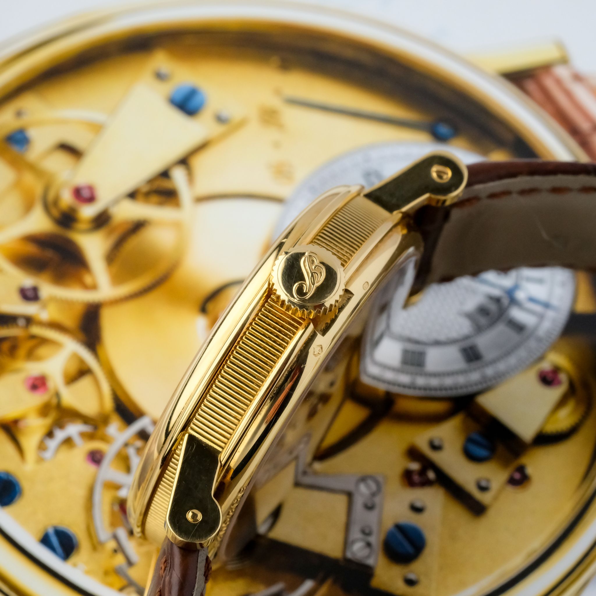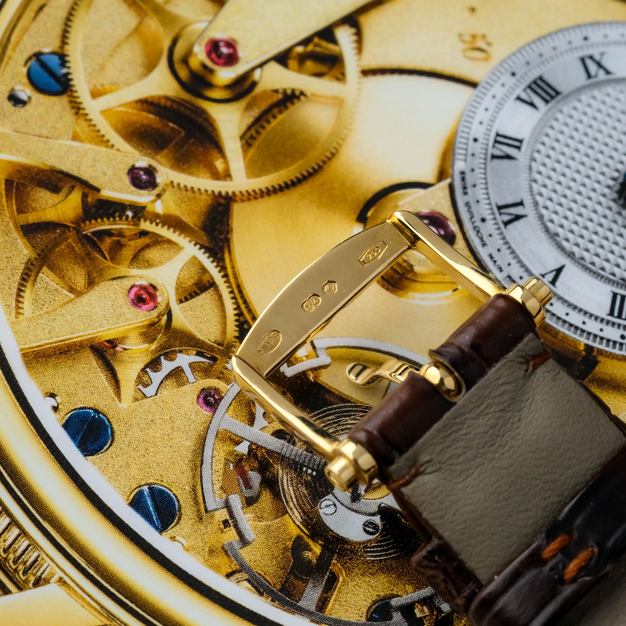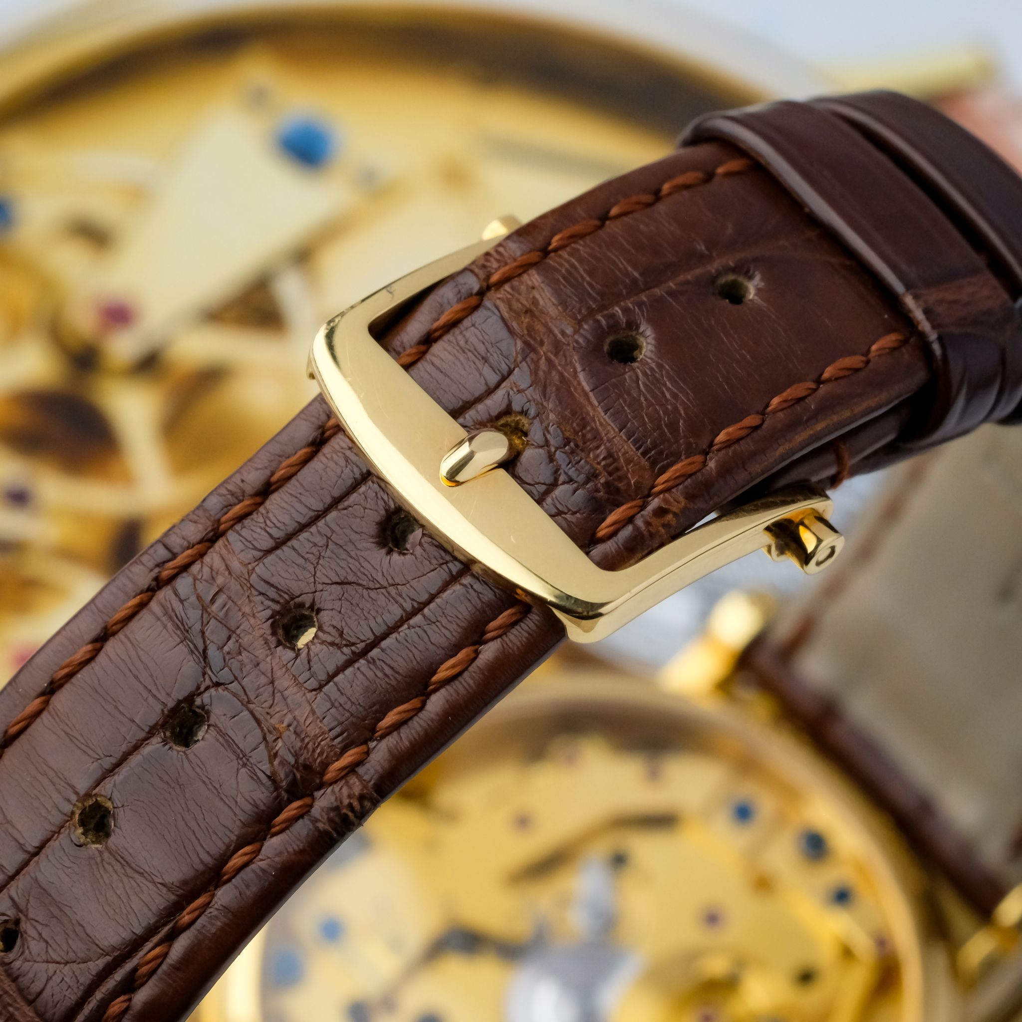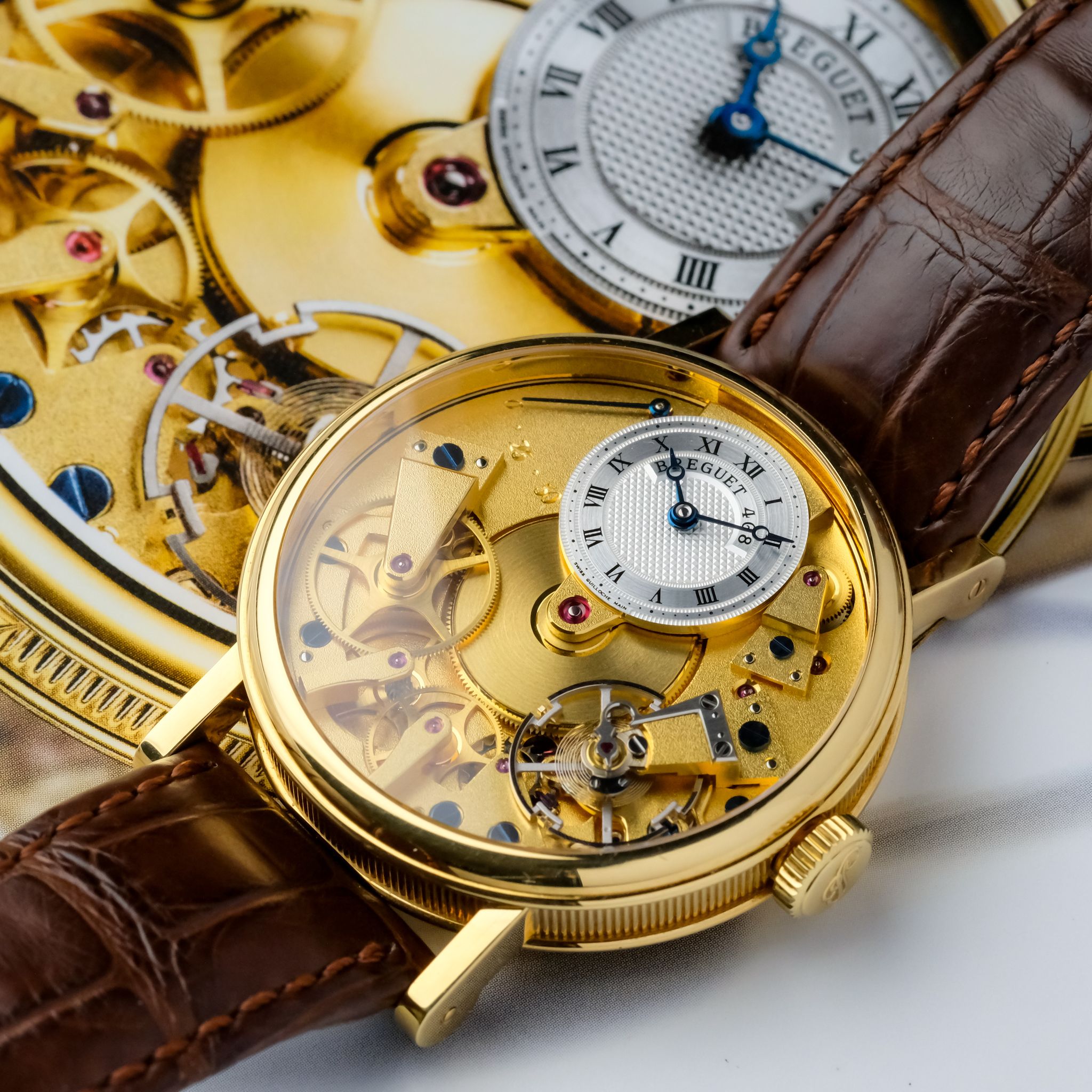 super cool neo-vintage Breguet Tradition ref. 7027 in 18k yellow gold in superb condition accompanied by the fullest. This piece appears to be rarely worn and has only very light scratches, the movement is very clean and tidy and the bevels are still sharp. It still has the original strap as well as buckle and the box and booklets, though the papers got lost so the original owner had a certificate for it done by Breguet.