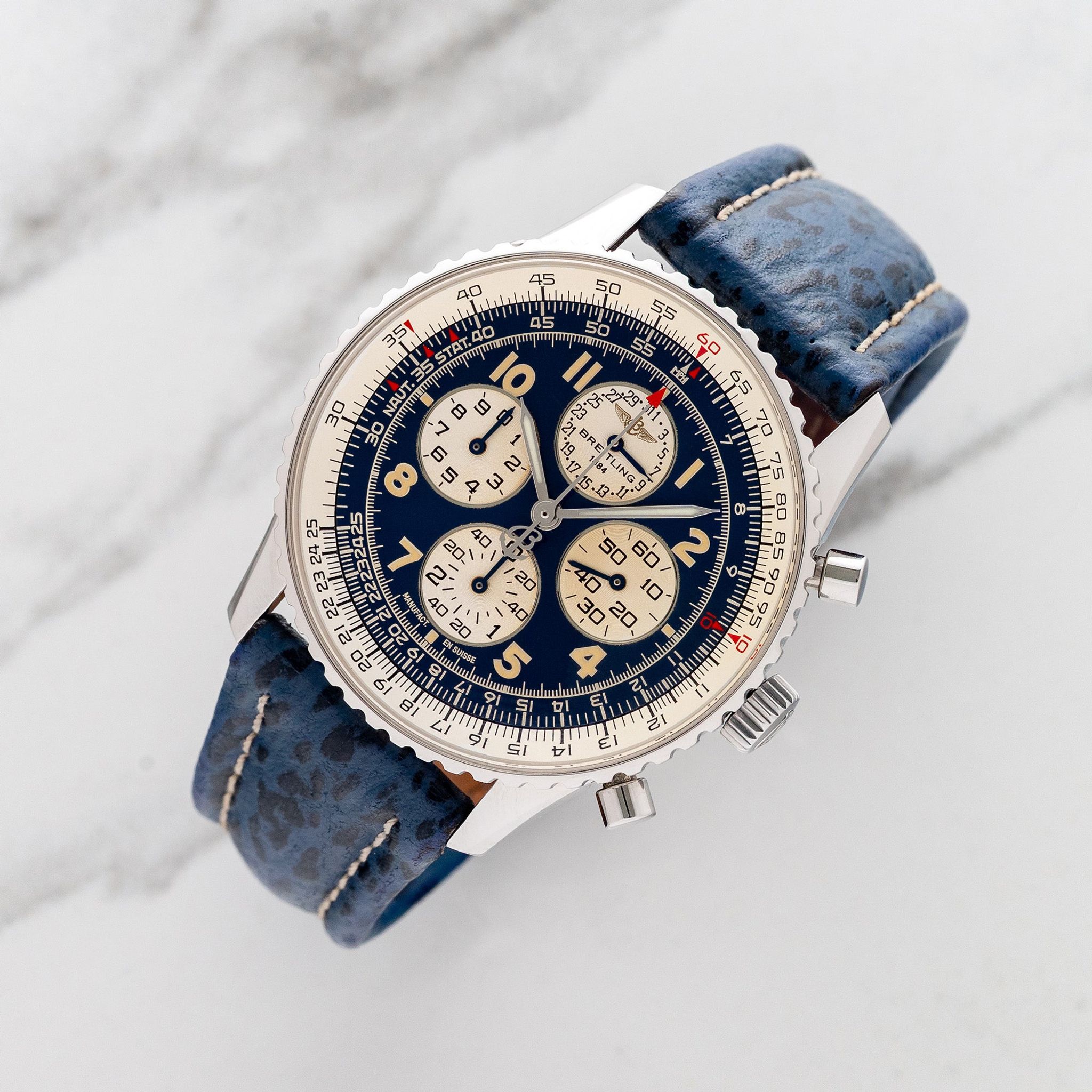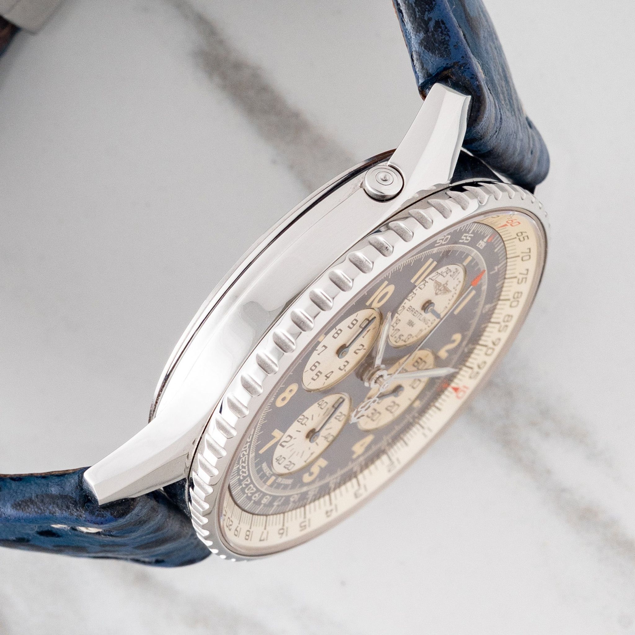This particular Airborne model was produced for a short period from '95-'97. It is a popular model for collectors due to its well proportioned case at 38mm. This example has remained in great neo-vintage condition with a well-preserved dial that stands out from the pack display clean tritium Arabic numerals. The hour and minute hands appear to be luminova service replacements and the case shows light signs of use and remains evenly proportioned. For anyone looking for a more elegant or ergonomic wearing Navitimer, this piece makes for a fantastic daily driver.