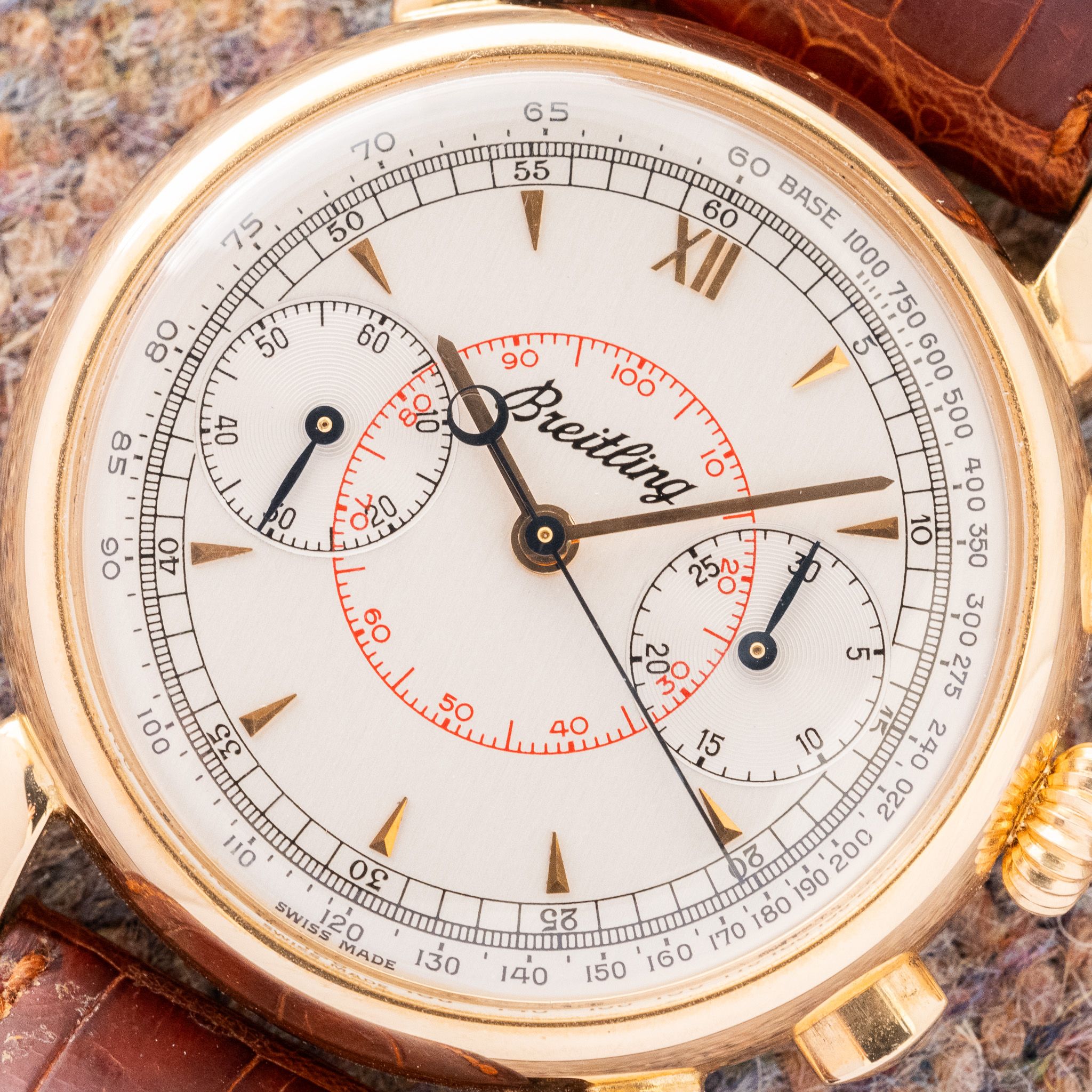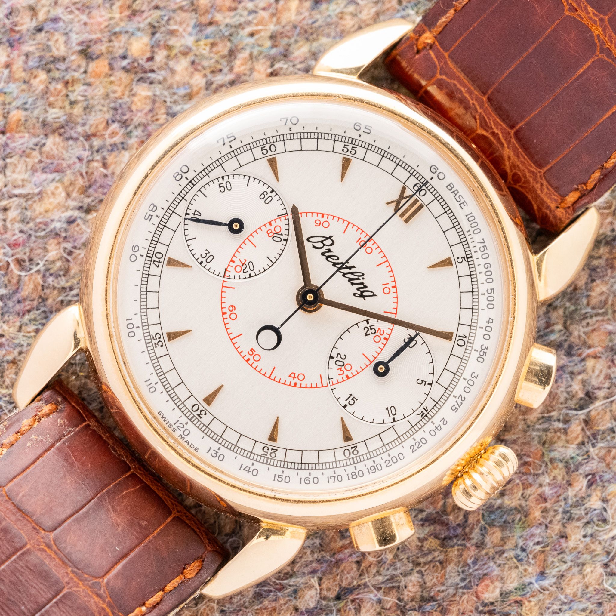 Dial: A silver brushed dial with a layout similar to Breightling Chronographs from the 40s and 50s.