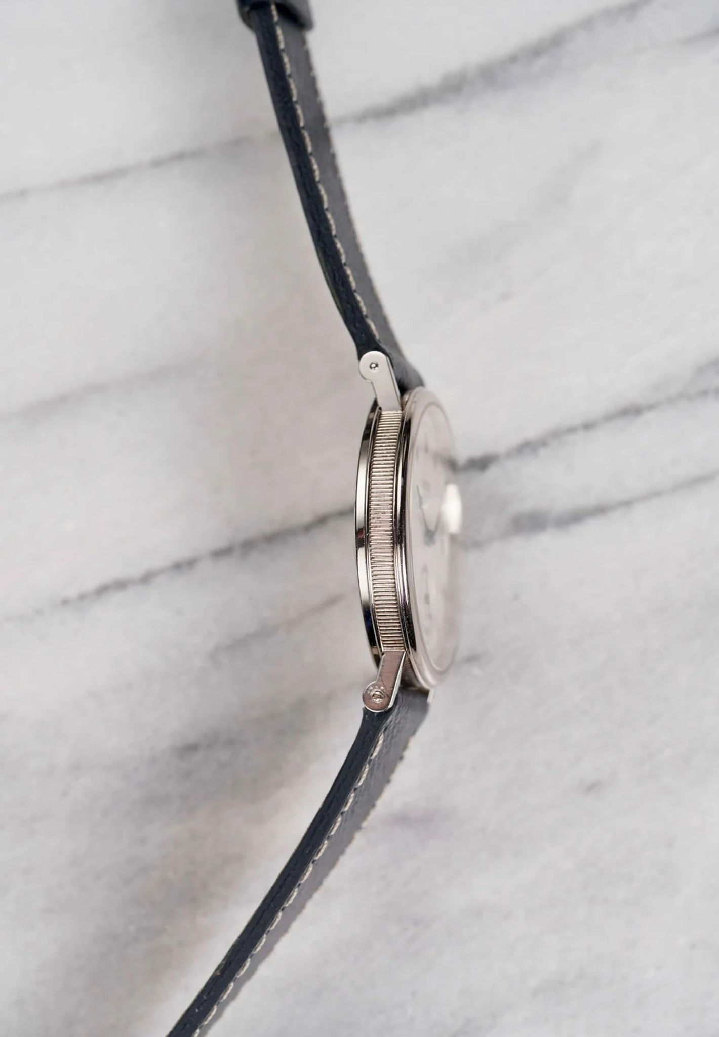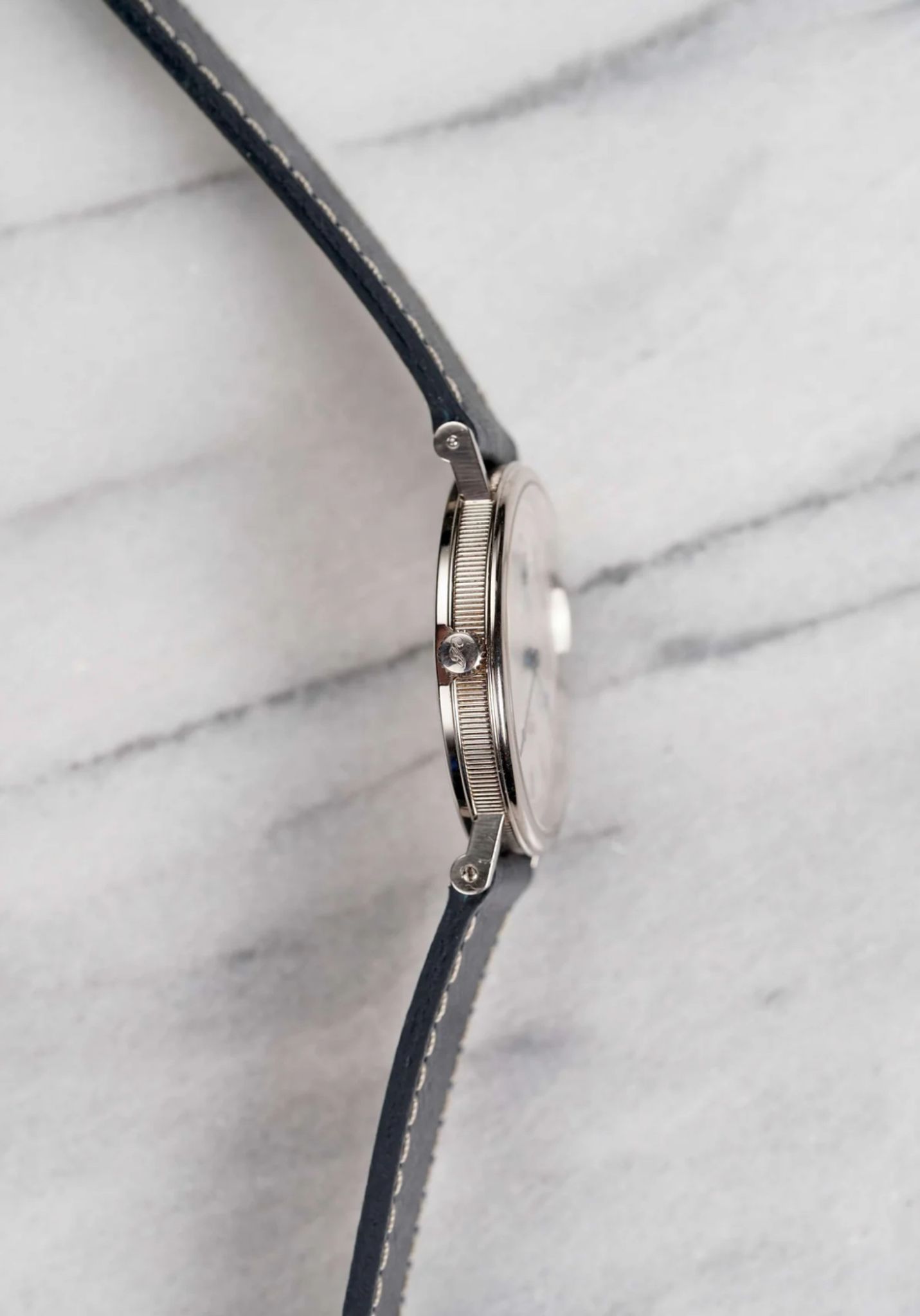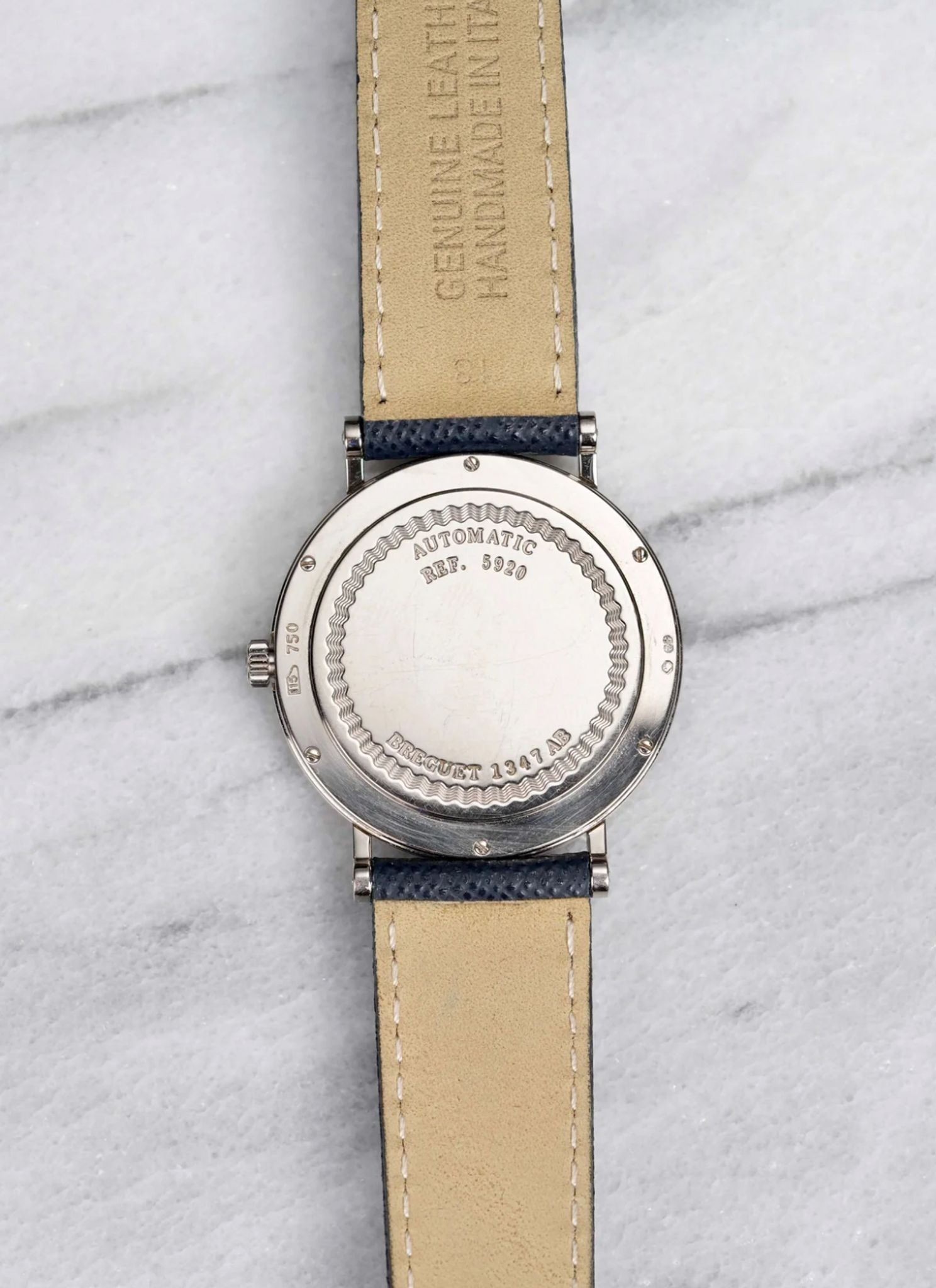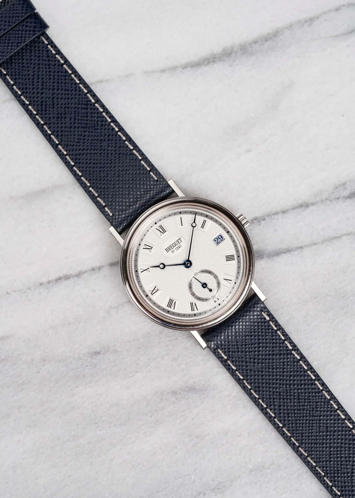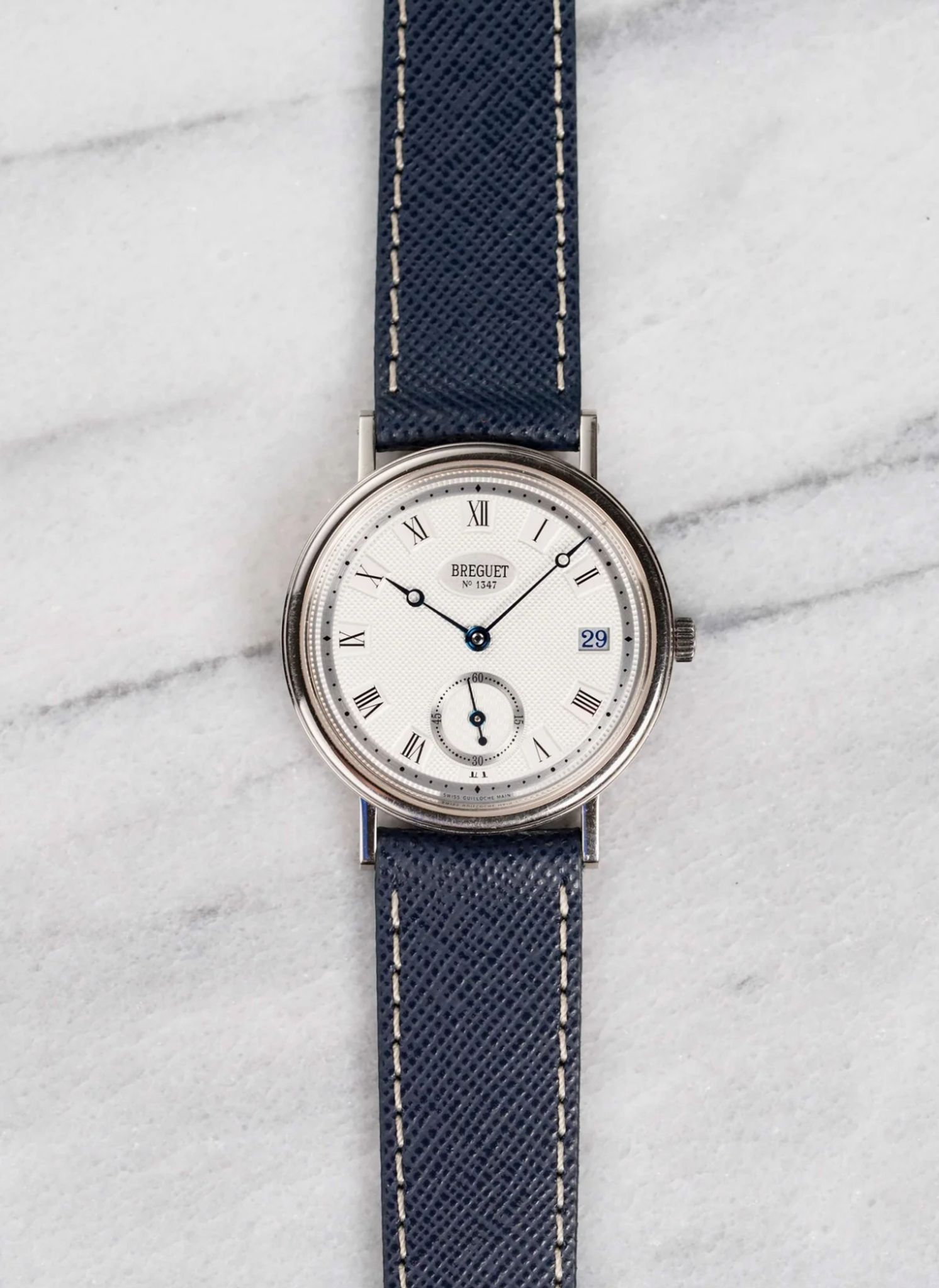 Here's a Classique neo-vintage Breguet reference 5920 with a beautifully hand finished silver guilloche roman numeral dial from the 1990s. Keeps great time and is fully functional. Measurments include a 34mm case and 18mm lug width. On an aftermarket blue pebble textured leather strap (Made in Italy). It comes with its original white gold buckle separately. Quickset date function at 3 a clock. Blued hands. Sub seconds at 6 a clock. Different guiolloche finishings on the dial and sub seconds. 18K white gold case and caseback. All parts are original including dial, movement, and caseback. Both the dial and case are in great cosmetic, untouched condition.