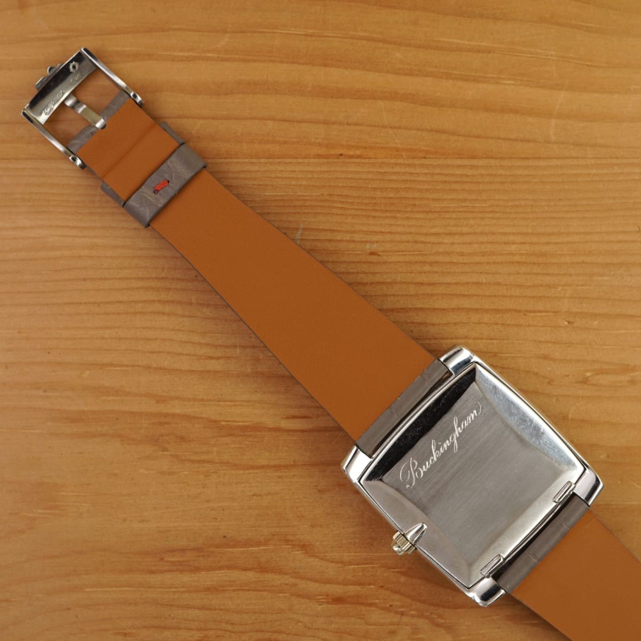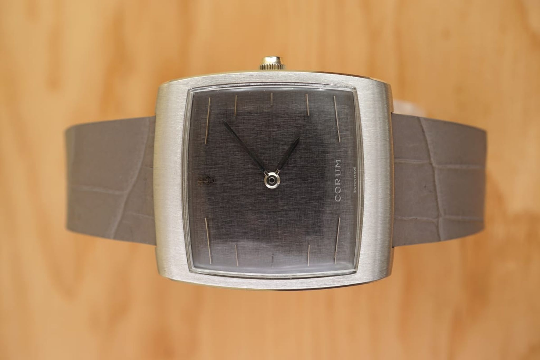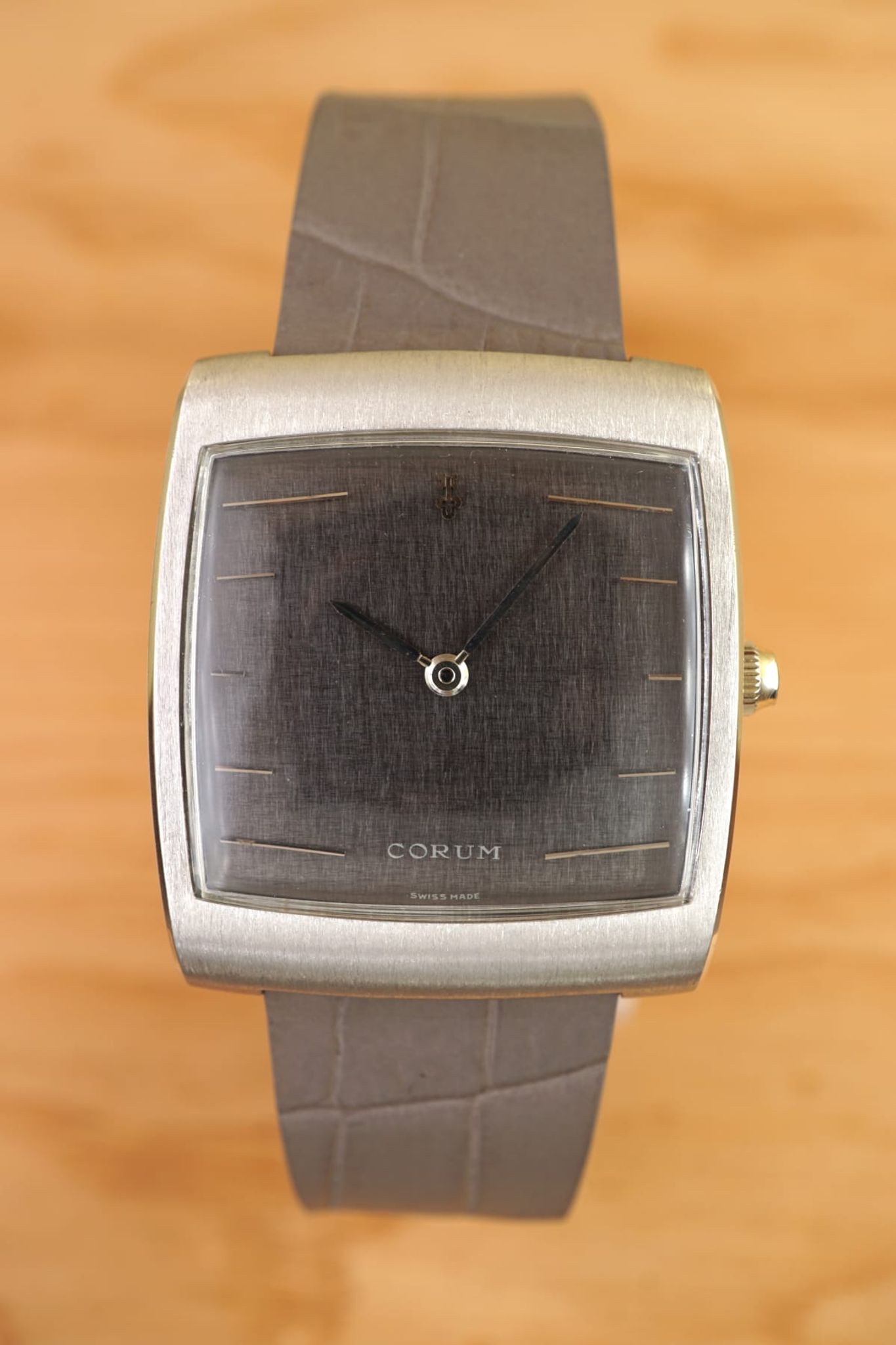 Amazing wrist presence of this bold and great finished watch! The Buckingham is clearly a 70s-child and in 18K-whitegold a rare icon. monochrome strap was custom-made for this model and is the perfect fit to connect the immaculate condition and probably unpolished bold case to the original Corum buckle.