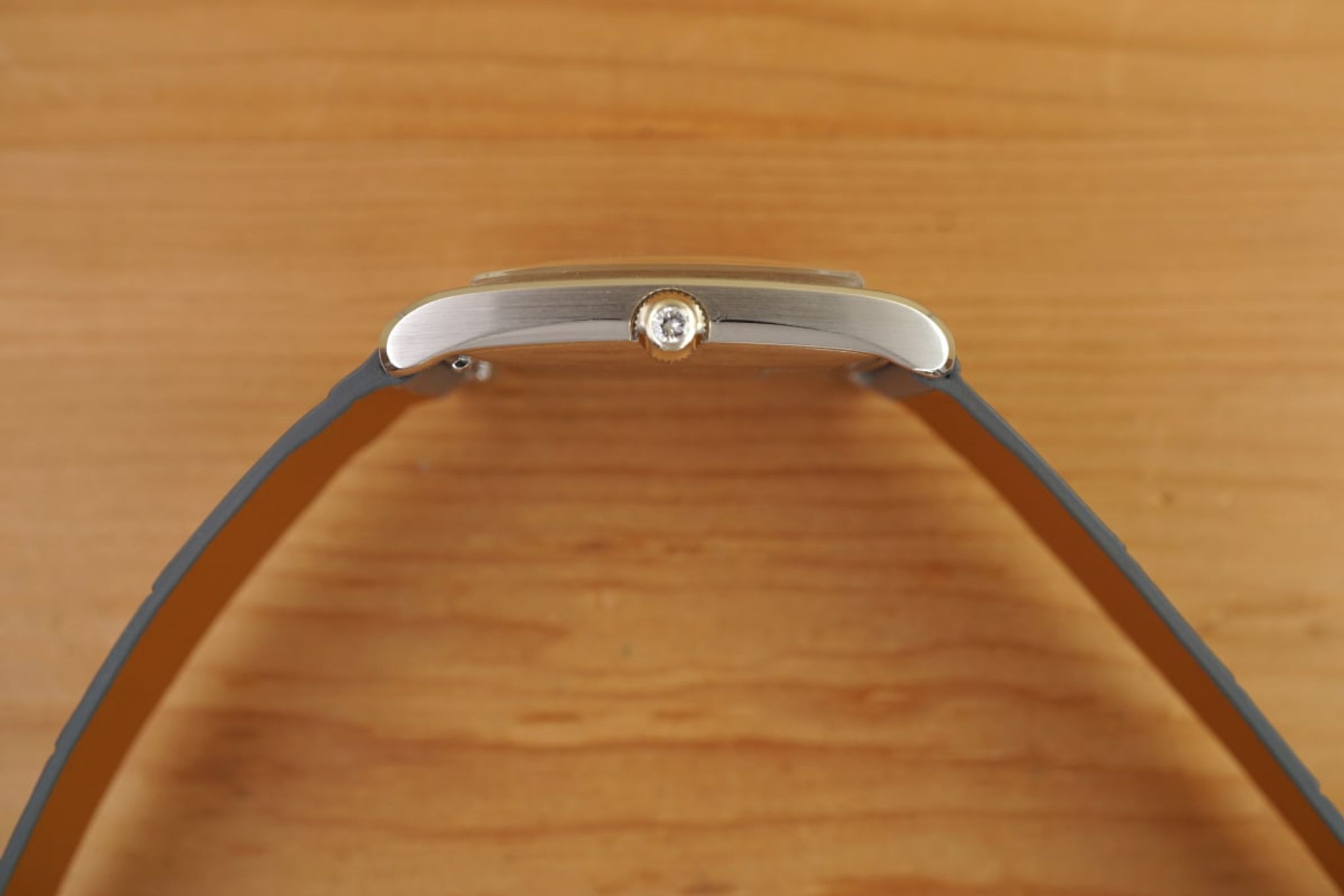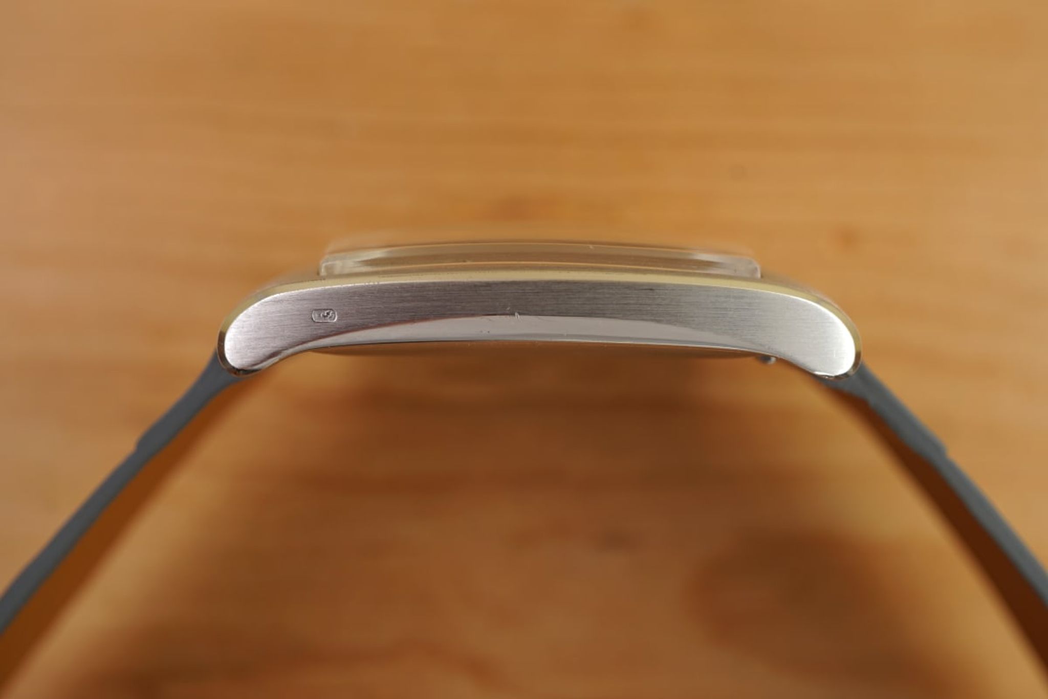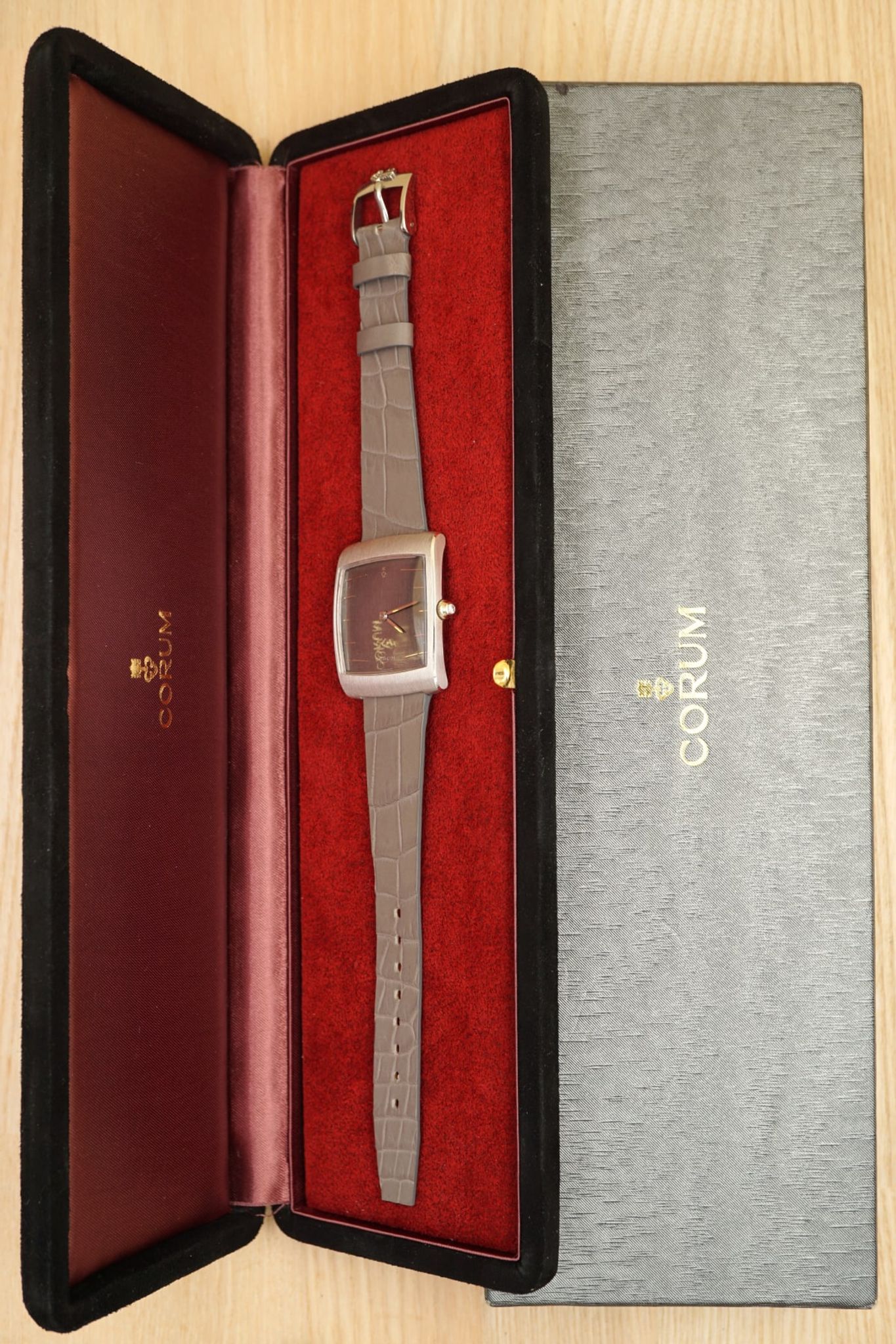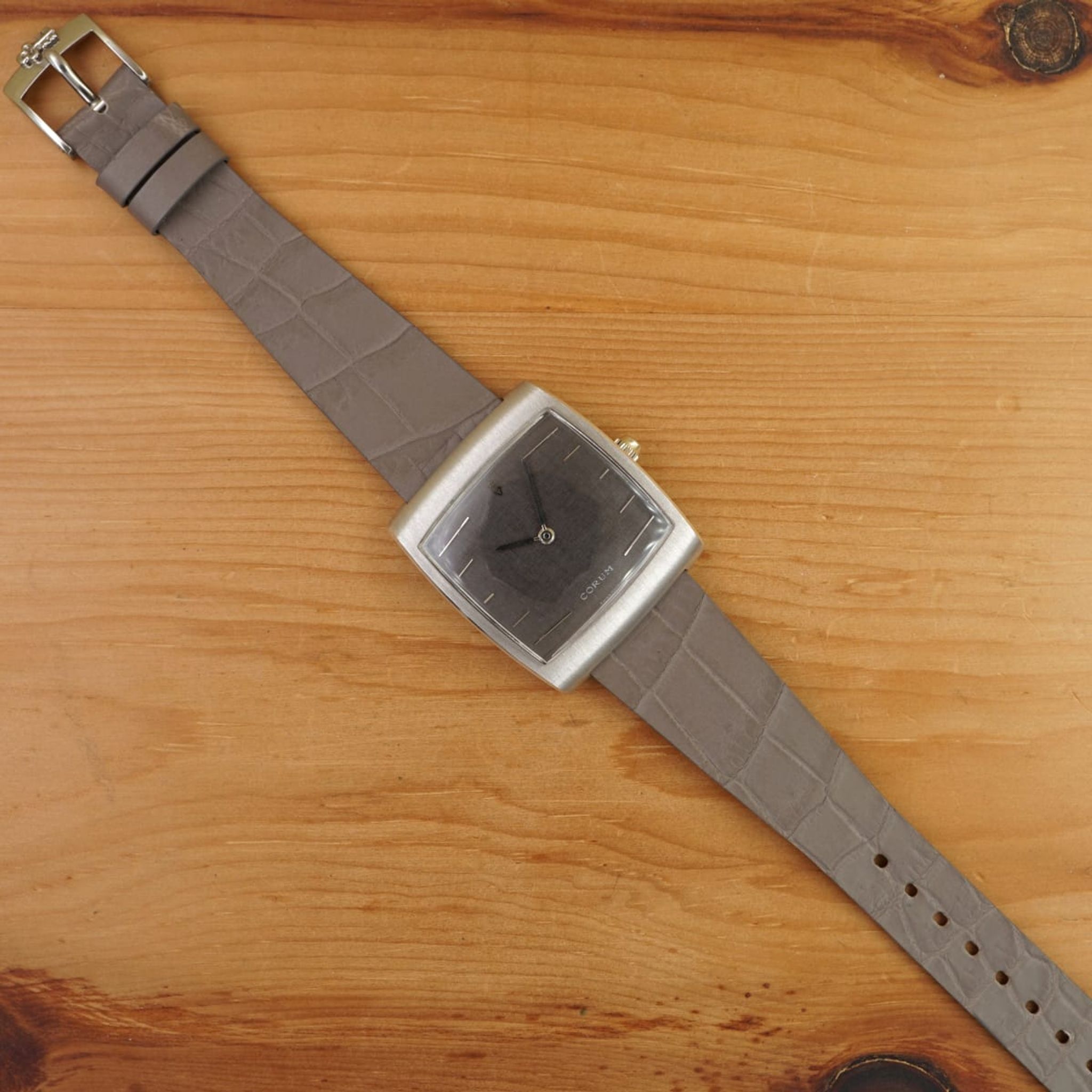 Amazing wrist presence of this bold and great finished watch! The Buckingham is clearly a 70s-child and in 18K-whitegold a rare icon. monochrome strap was custom-made for this model and is the perfect fit to connect the immaculate condition and probably unpolished bold case to the original Corum buckle.