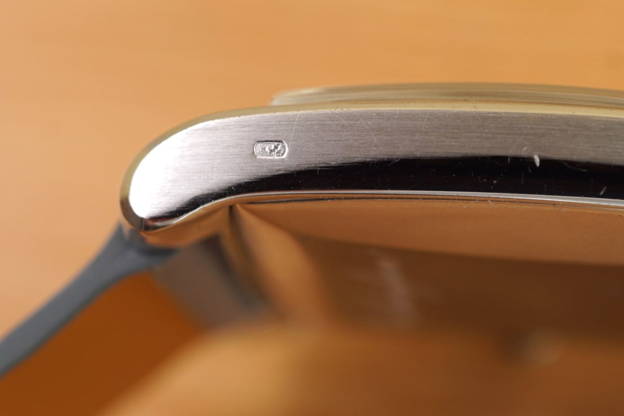 The gold-hallmark of Geneva is clearly visible at the 9o'clock flank and on the opposite side the winding crown is topped with a diamond: monochrome but sparkling.