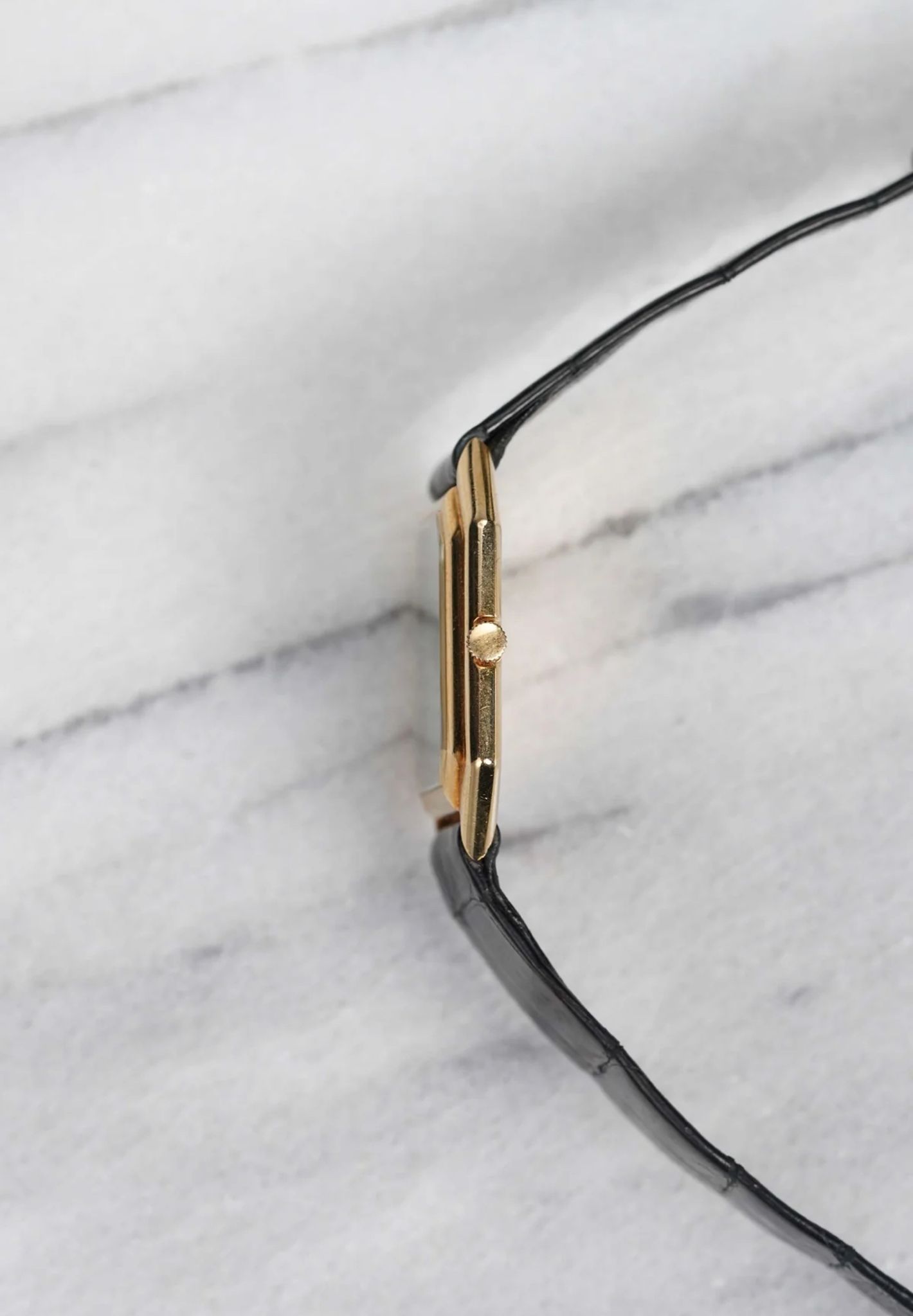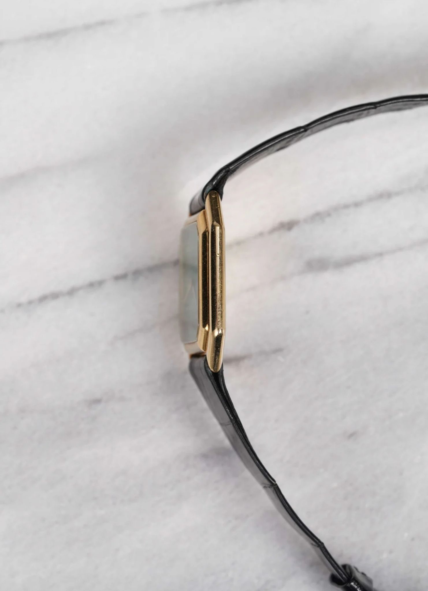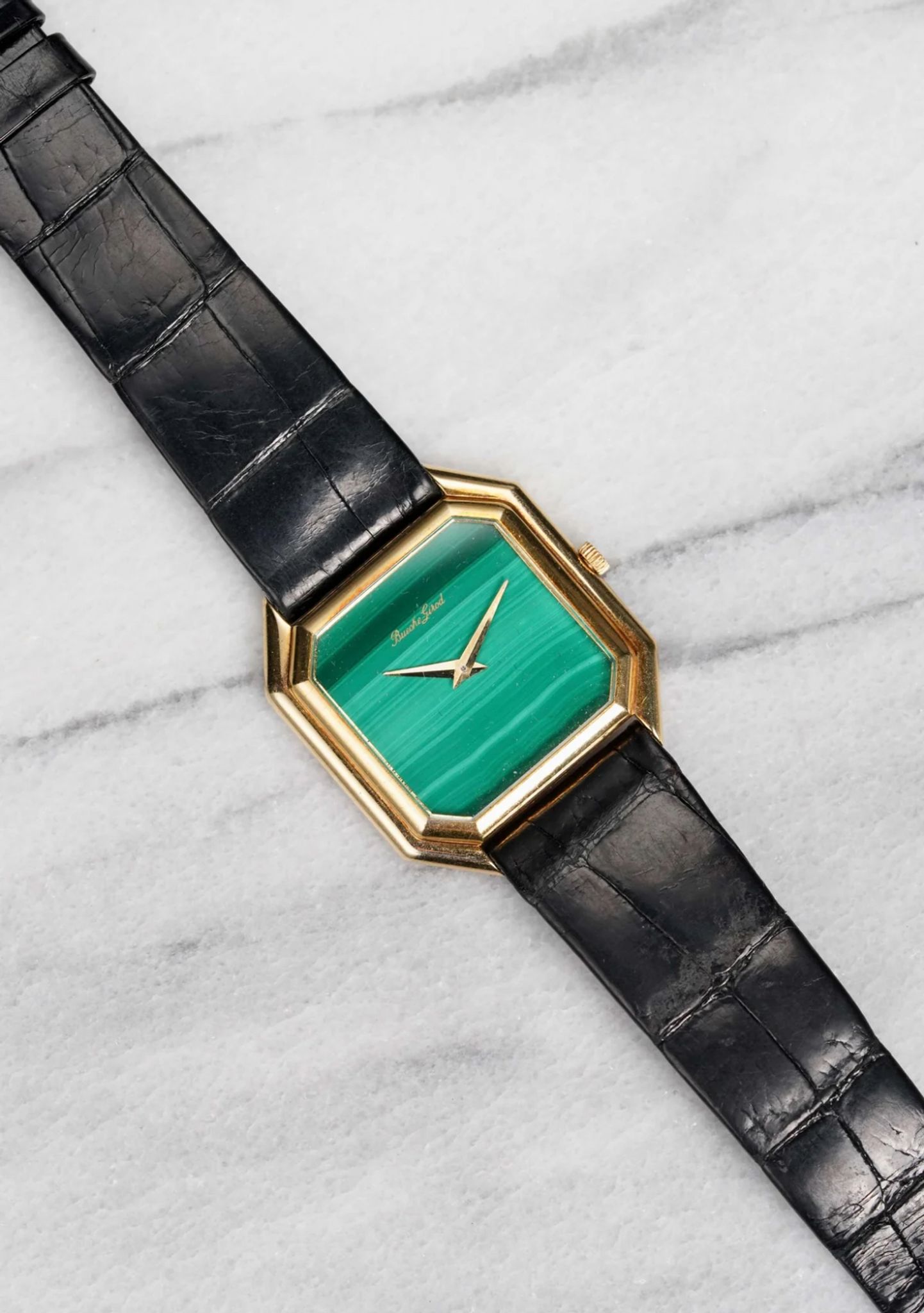 Here's a vintage Bueche Girod manual wind reference 9828 in 18K yellow gold with a green malachite stone dial from the 1970s. Keeps great time and is fully functional. Measurements include a 28x32mm mm case size and an 18mm integrated bracelet. It's a square shape. On its original black leather strap and signed gold buckle. Gold dauphine hands. Similar to a Cartier Centurion case. The piece is unisex , it can be worn by both men and women. The dial has some cracks on the dial as seen in photos. All parts are original including the dial, case, and movement. the dial and case are in great cosmetic, untouched condition.