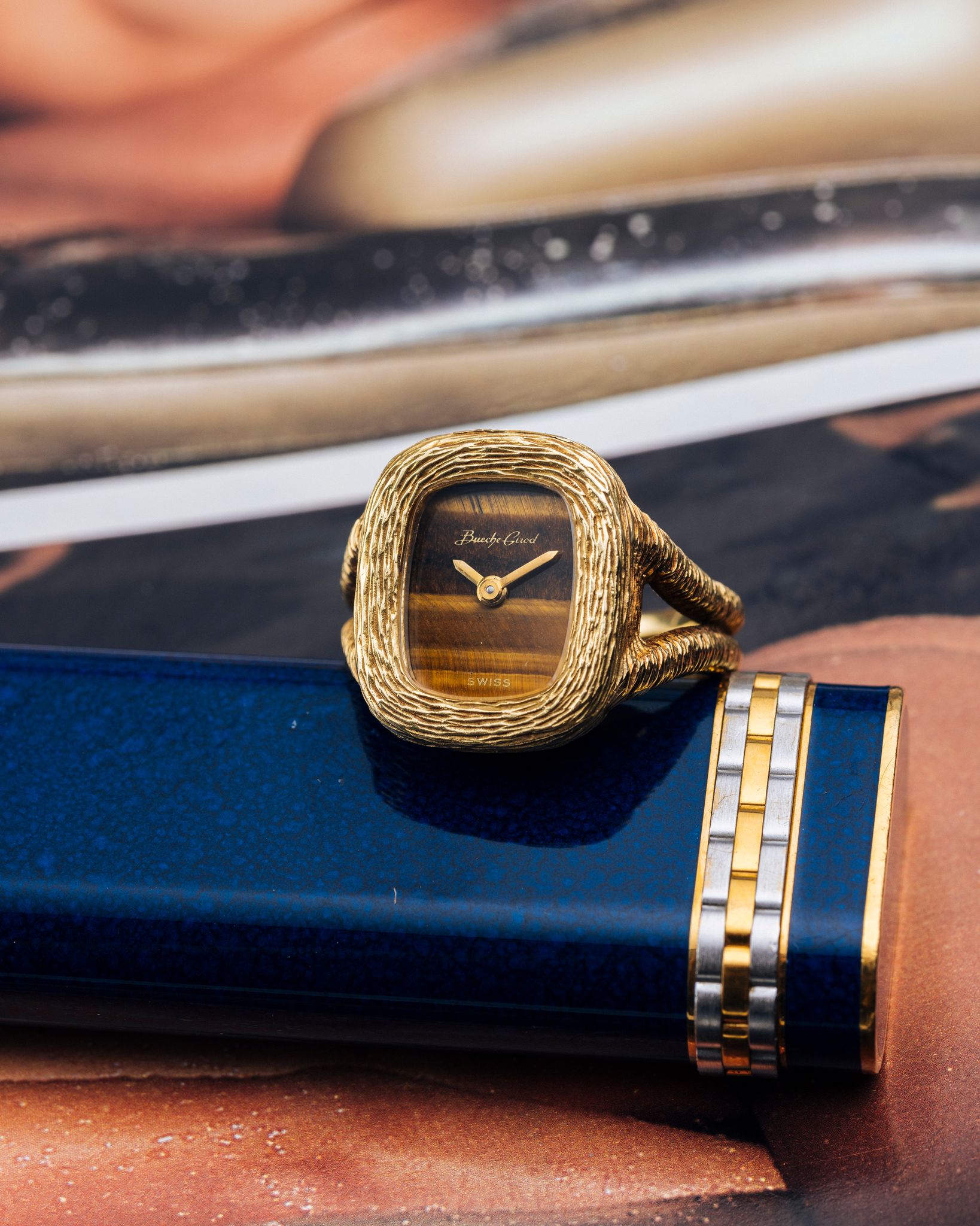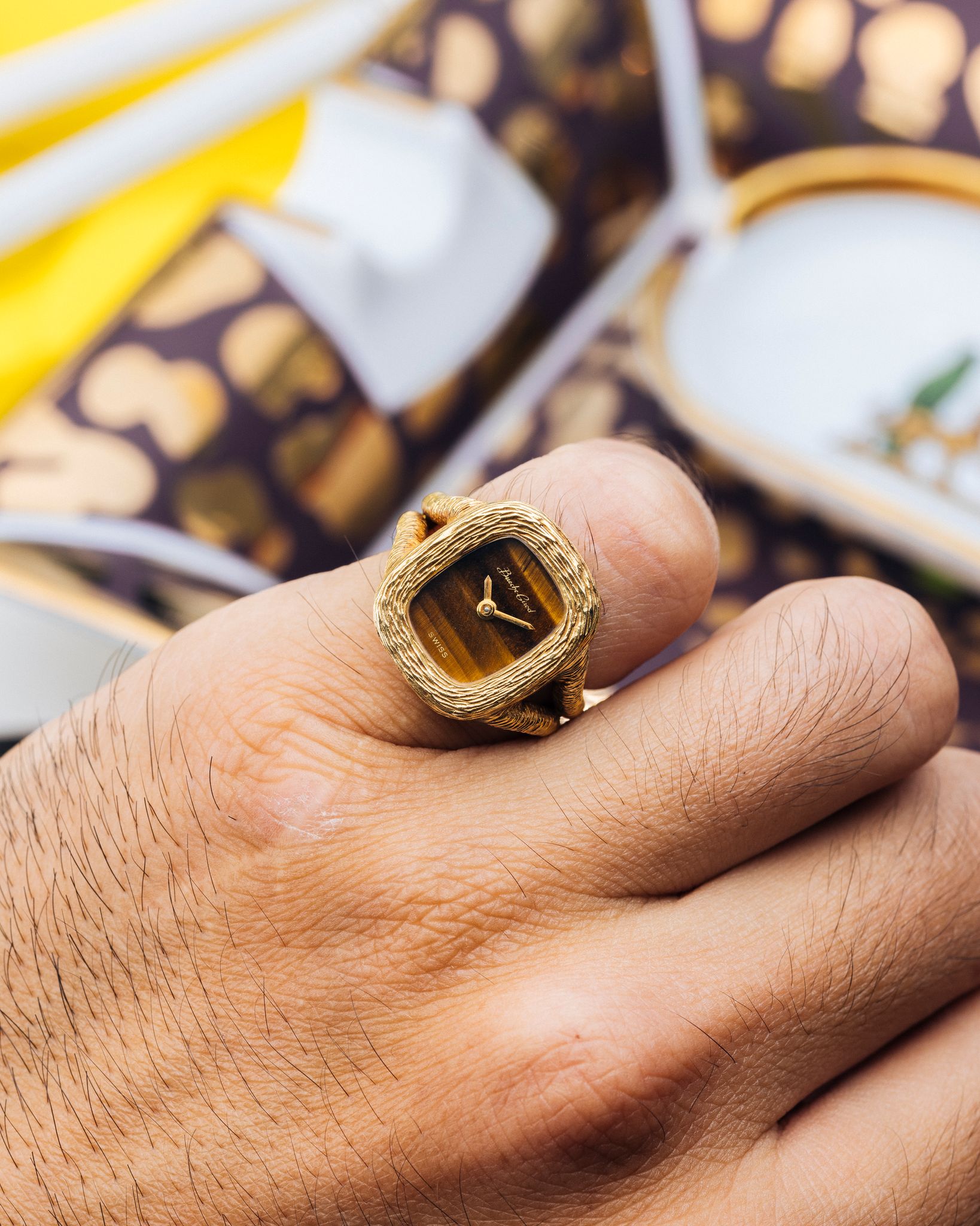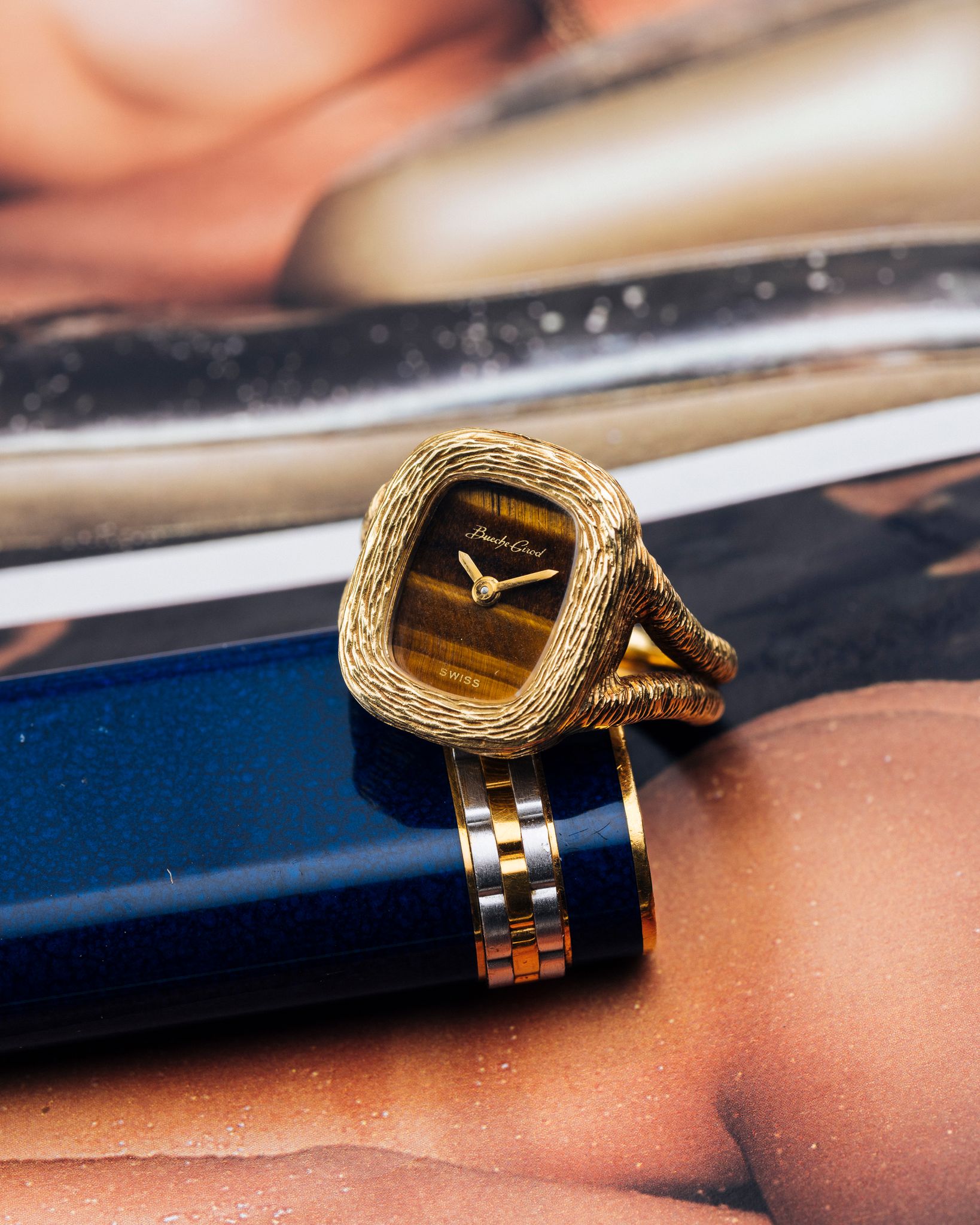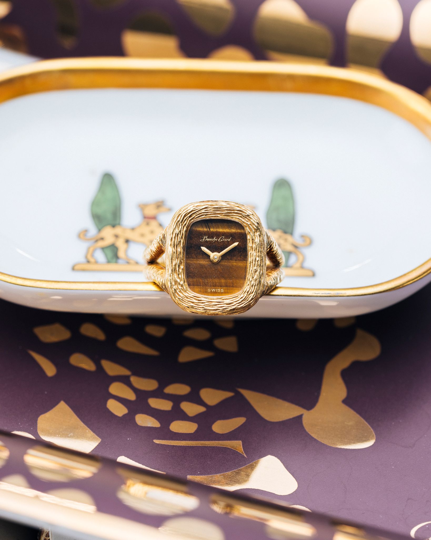Well, we got you covered with this beautiful 18kt yellow gold Bueche & Girod ring watch designed by Roy King himself. Featuring a beautiful Tiger Eye dial, this is the absolute statement piece.