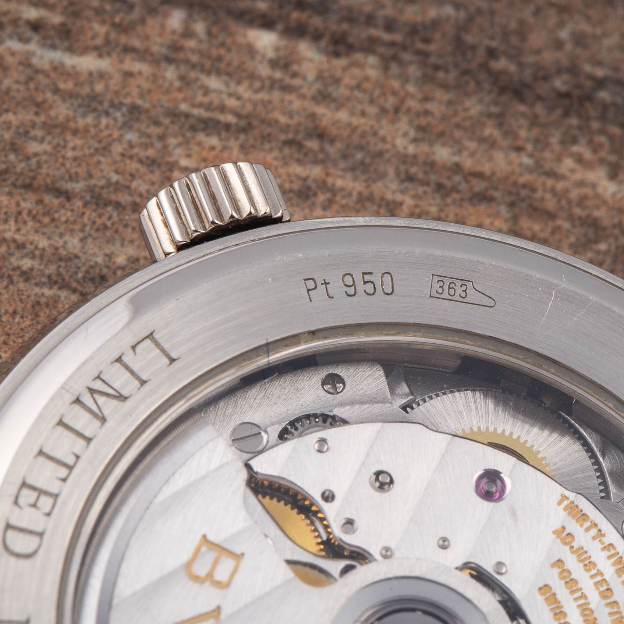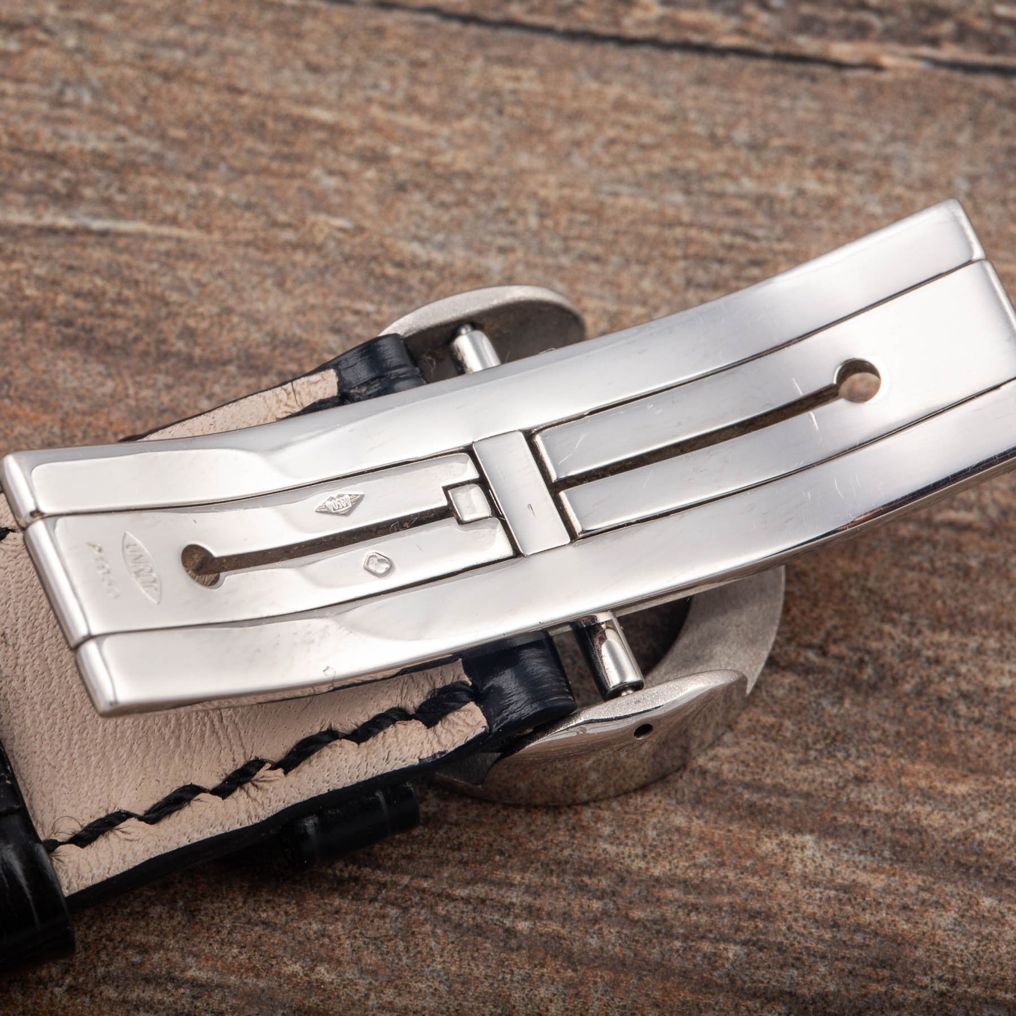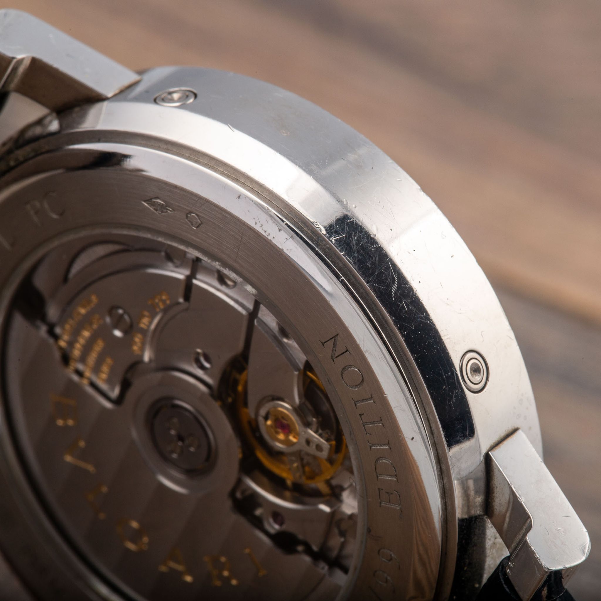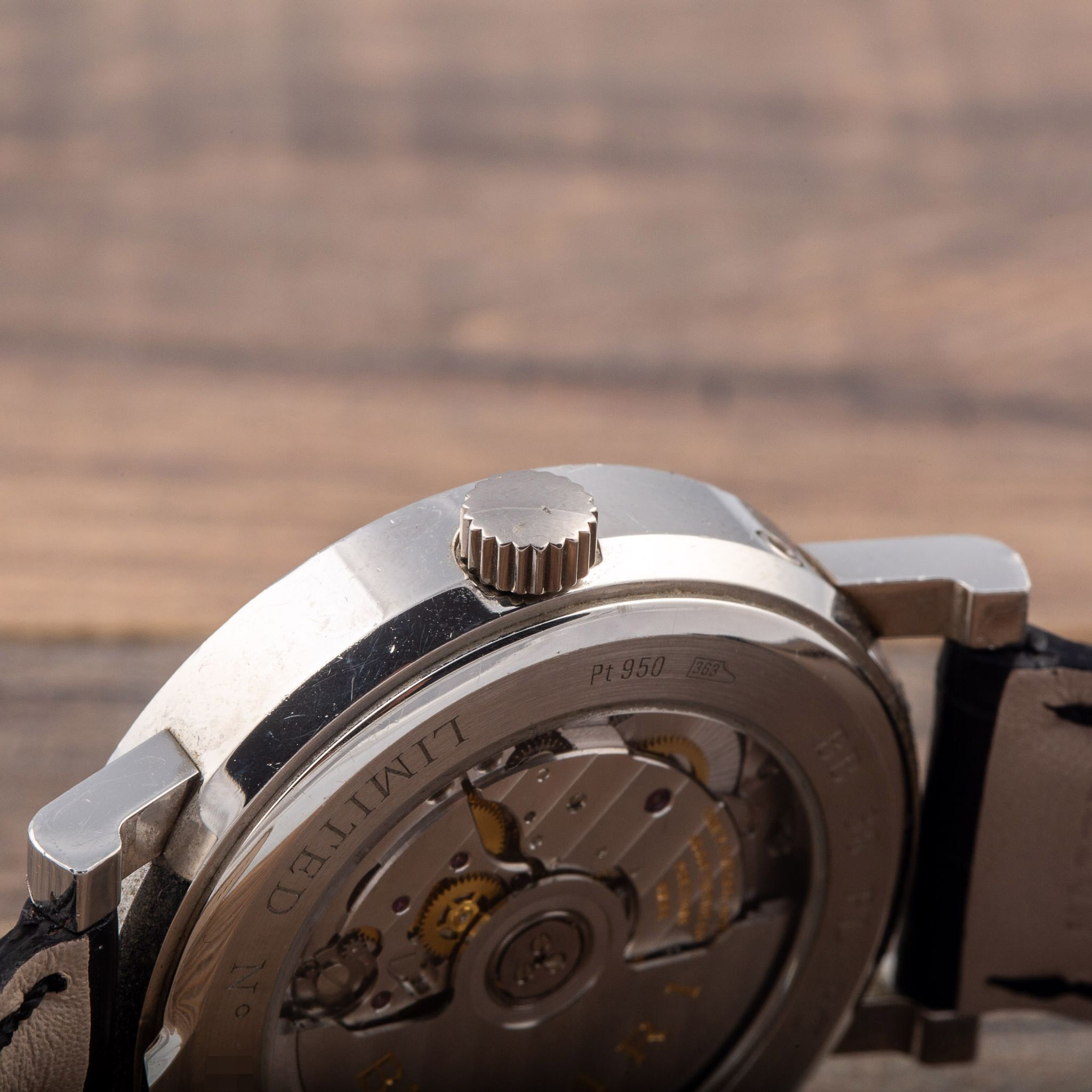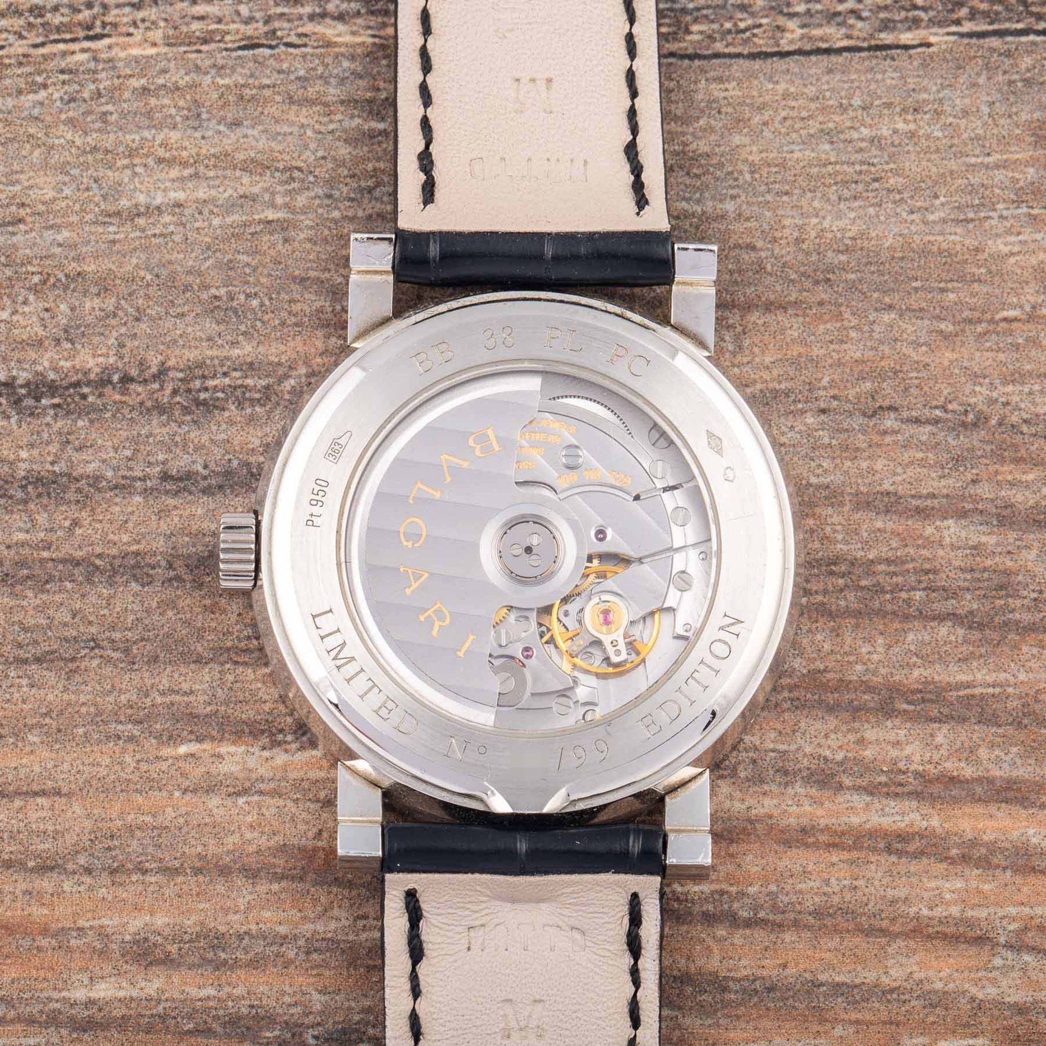 The present Bulgari Bulgari timepiece is an extraordinary blend of art and horological innovation. Produced in the 1990s as a limited edition of only 99 pieces, the watch features a stunning platinum round case with a bezel engraved with the iconic “Bulgari Bulgari” motif. A particularly striking feature is the warm salmon-colored dial, which adds a unique charm to its design. Most remarkable is its movement a perpetual calendar with retrograde jumping seconds. The dial includes a fan-shaped sector for retrograde seconds and three subsidiary dials for day, date, and month, complete with a leap year indicator. Due to its rarity, this watch is virtually unknown, with very few examples appearing in international auctions over the years. The overall condition is exceptional, featuring a mint dial, a perfectly functioning caliber, and an unpolished case.