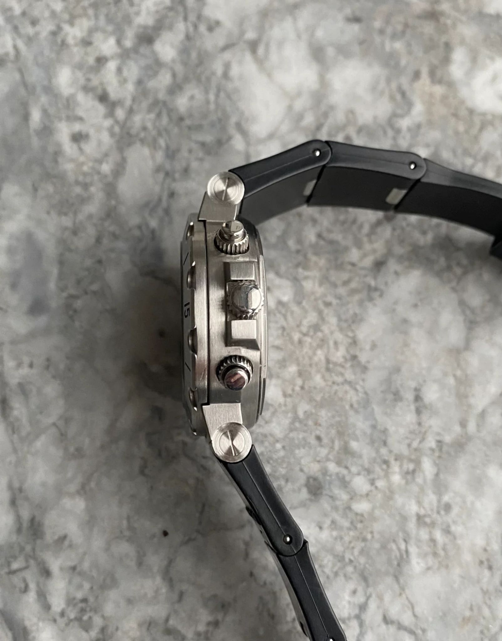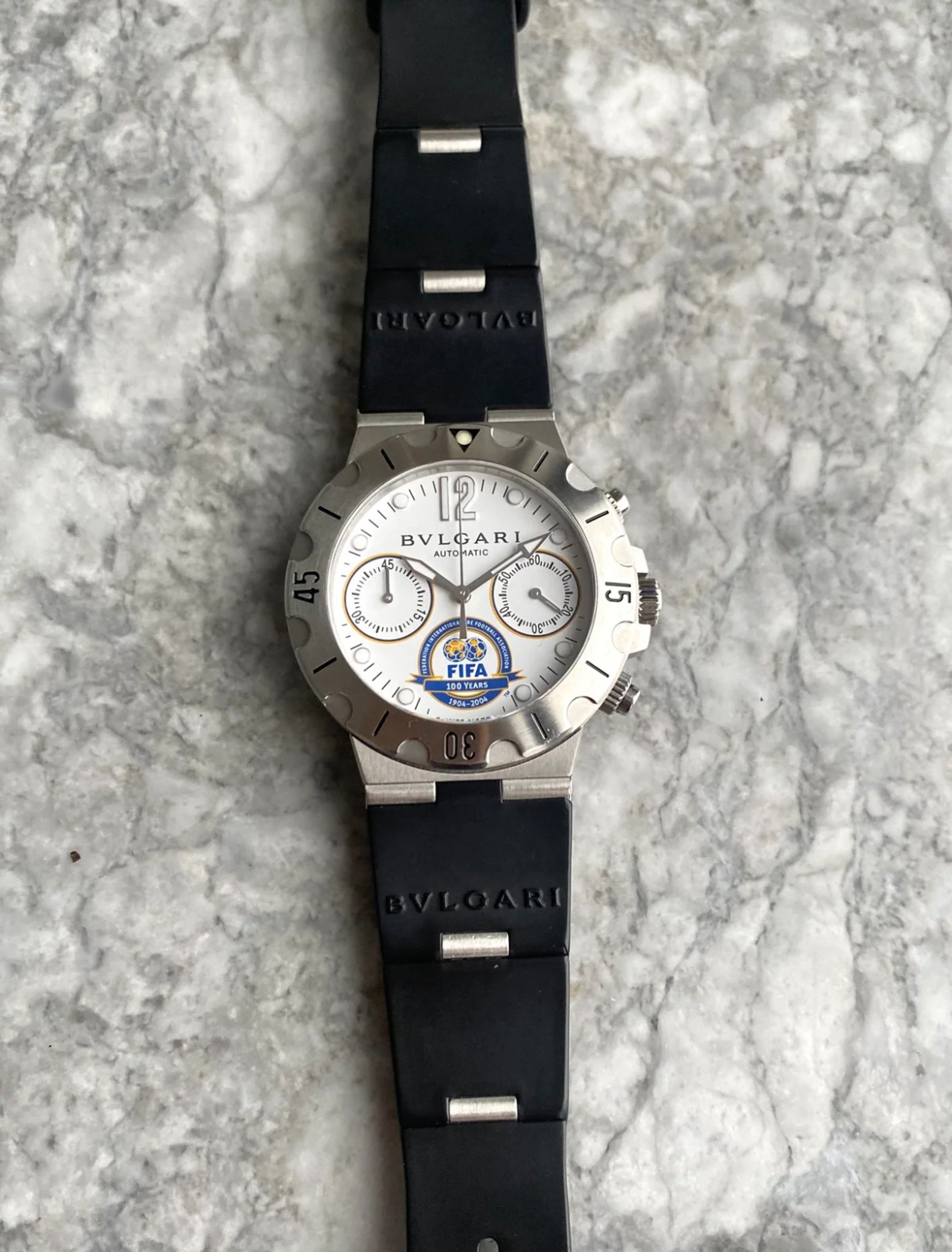 Here's a Bvlgari chronograph automatic white Fifa anniversary dial from 2004 (celebrating 100 years from 1904-2004). Keeps great time and is fully functional. Measurements include a 38mm case. It's on its original rubber strap that fits 7.5 inch wrist. Yellow and blue instramentation. Clean white dial. Matching white hands and hour markers. Matching crisp Lume in both hands and hour markers. Drilled lug holes. Limited edition 882/999. Bi-directional steel rotating bezel. Stainless steel case and caseback. All parts are original including the signed Bvlgari crown, dial, movement, and caseback. Both the dial and case are in great cosmetic, untouched condition.