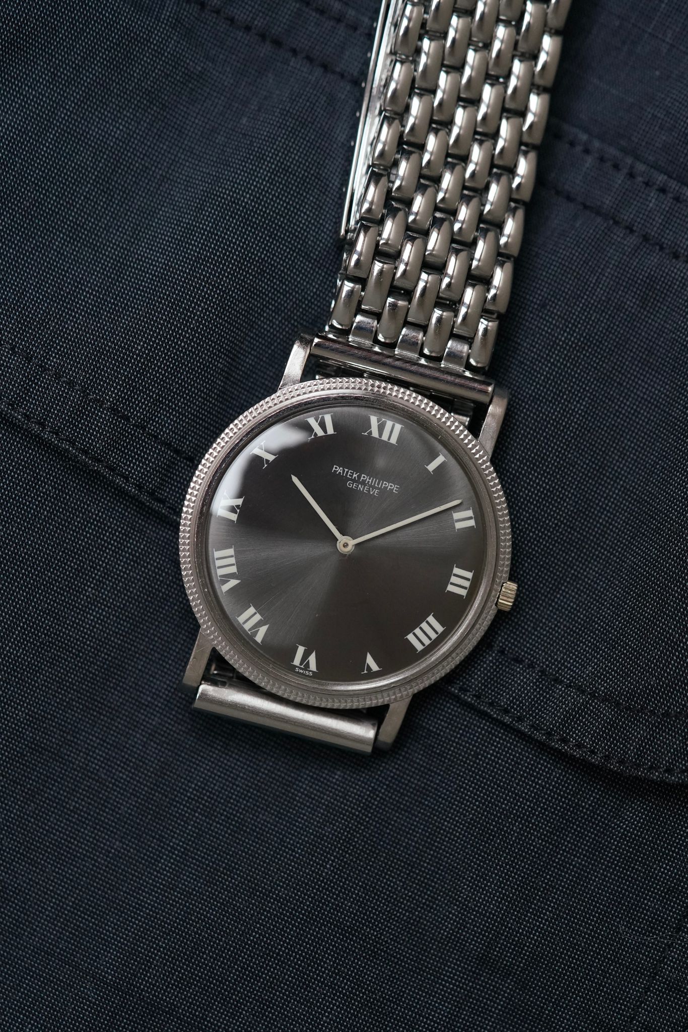 An 18k white gold Patek Philippe ref. 3520 — an elegant Calatrava form, here with an exceptionally rare grey sunburst dial and white Roman numerals. At 32mm and powered by the hand-wound calibre 177, it’s paired with a refined Japanese steel bracelet that complements its quiet sophistication.