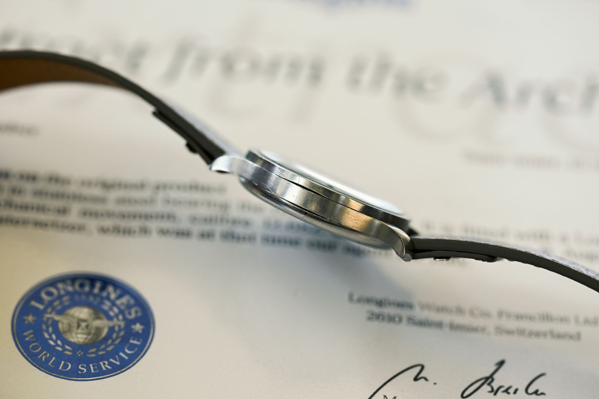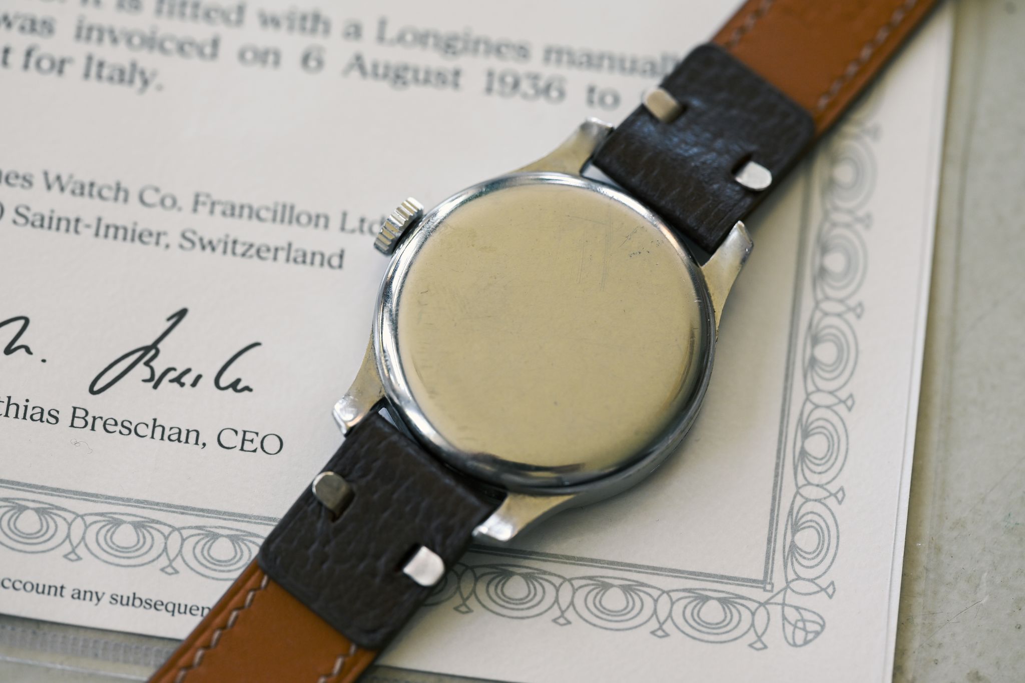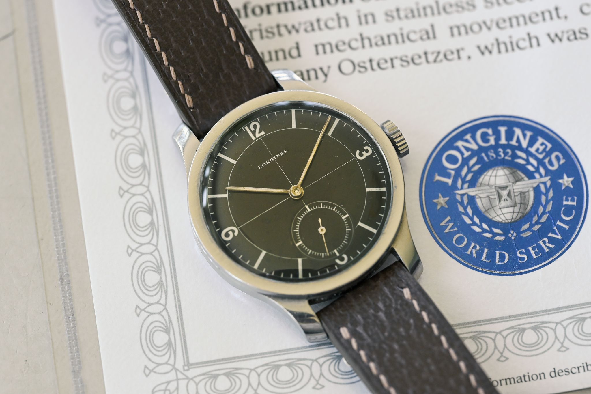 An early Longines ‘Calatrava’ ref. 2326 with rare black sector dial dating to 1936. This watch is all original and features a 33mm stainless steel case and manually wound Longines caliber 12.68z. This watch has just undergone a full service by my master watchmaker and is accompanied by its Extract from Archives.