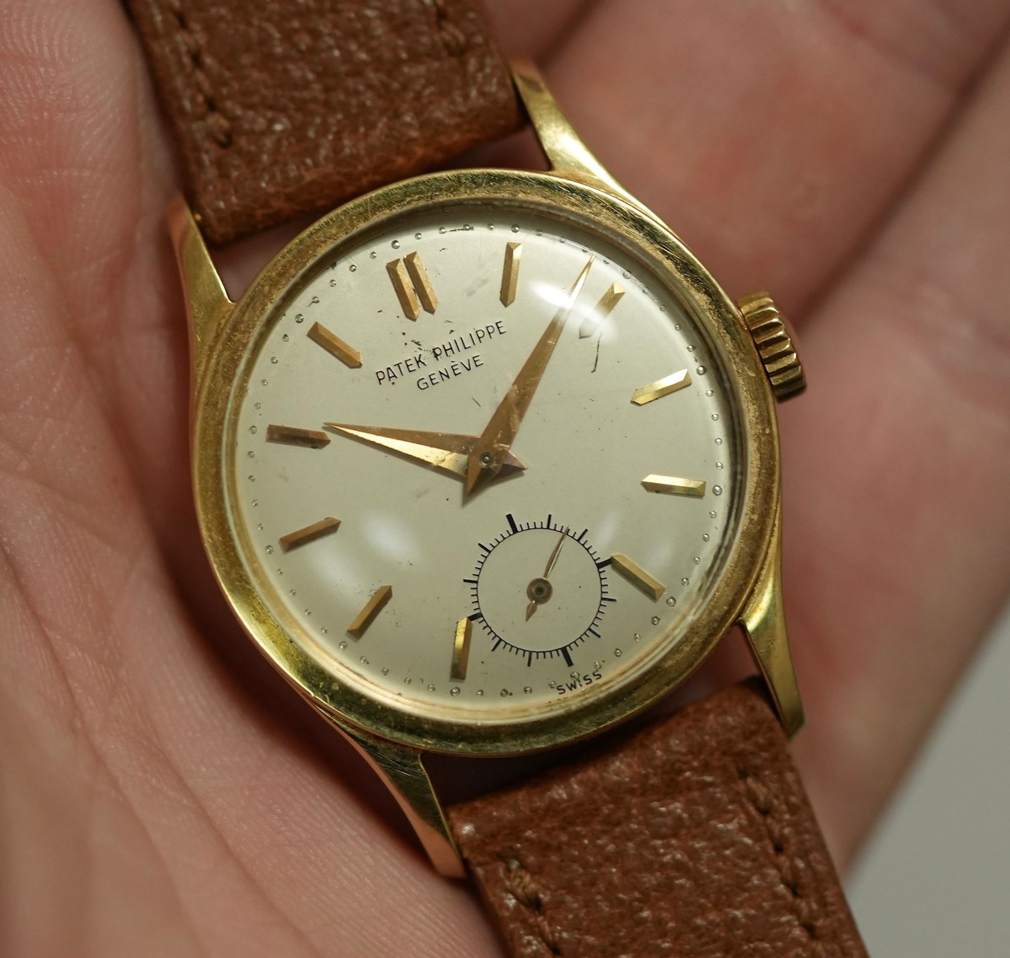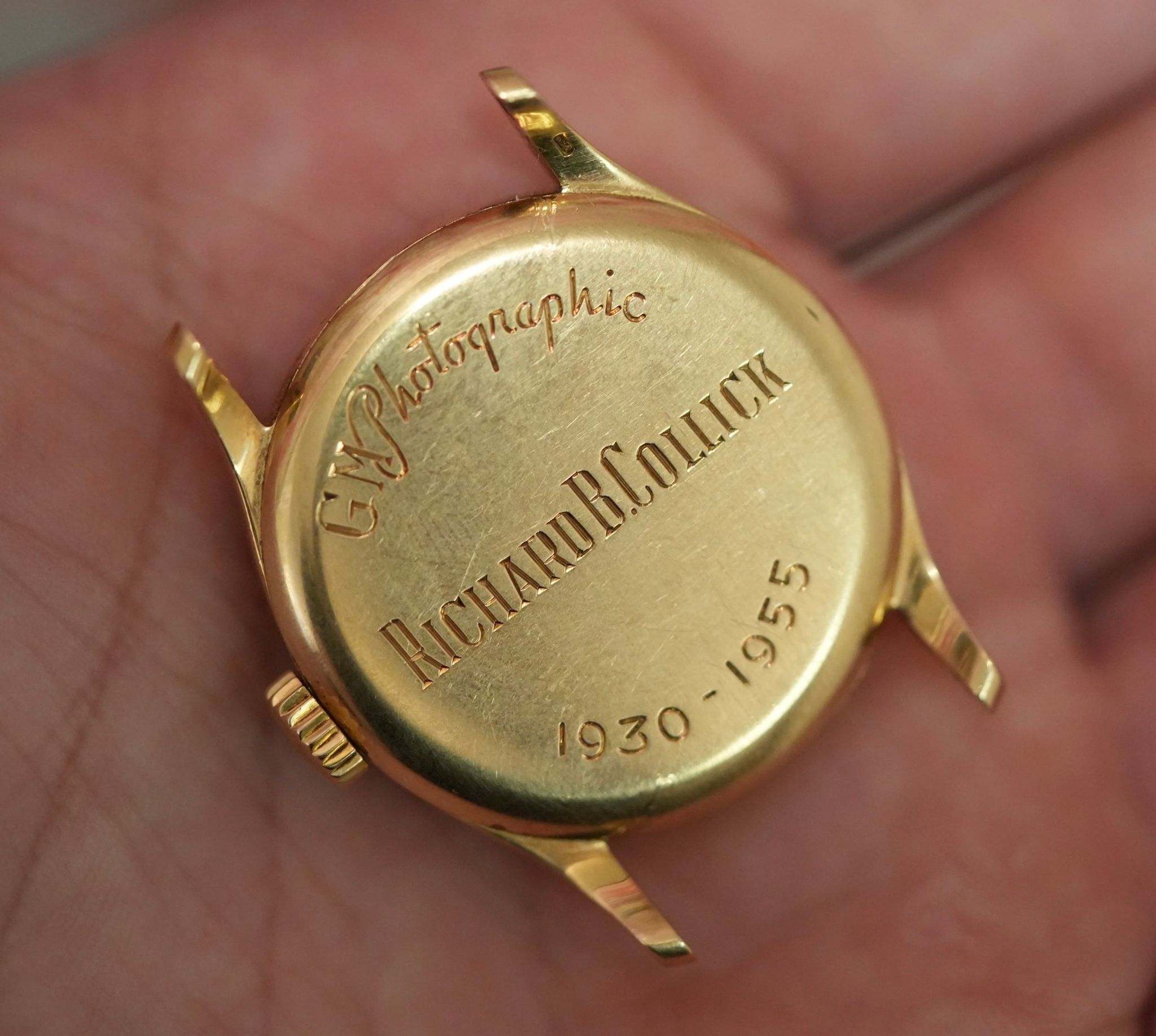 A classic ref. 96J Calatrava circa 1955 from the family of the original owner in Michigan. The caseback features an engraving which signifies the watch was given as a gift for 25 years of service at General Motors.