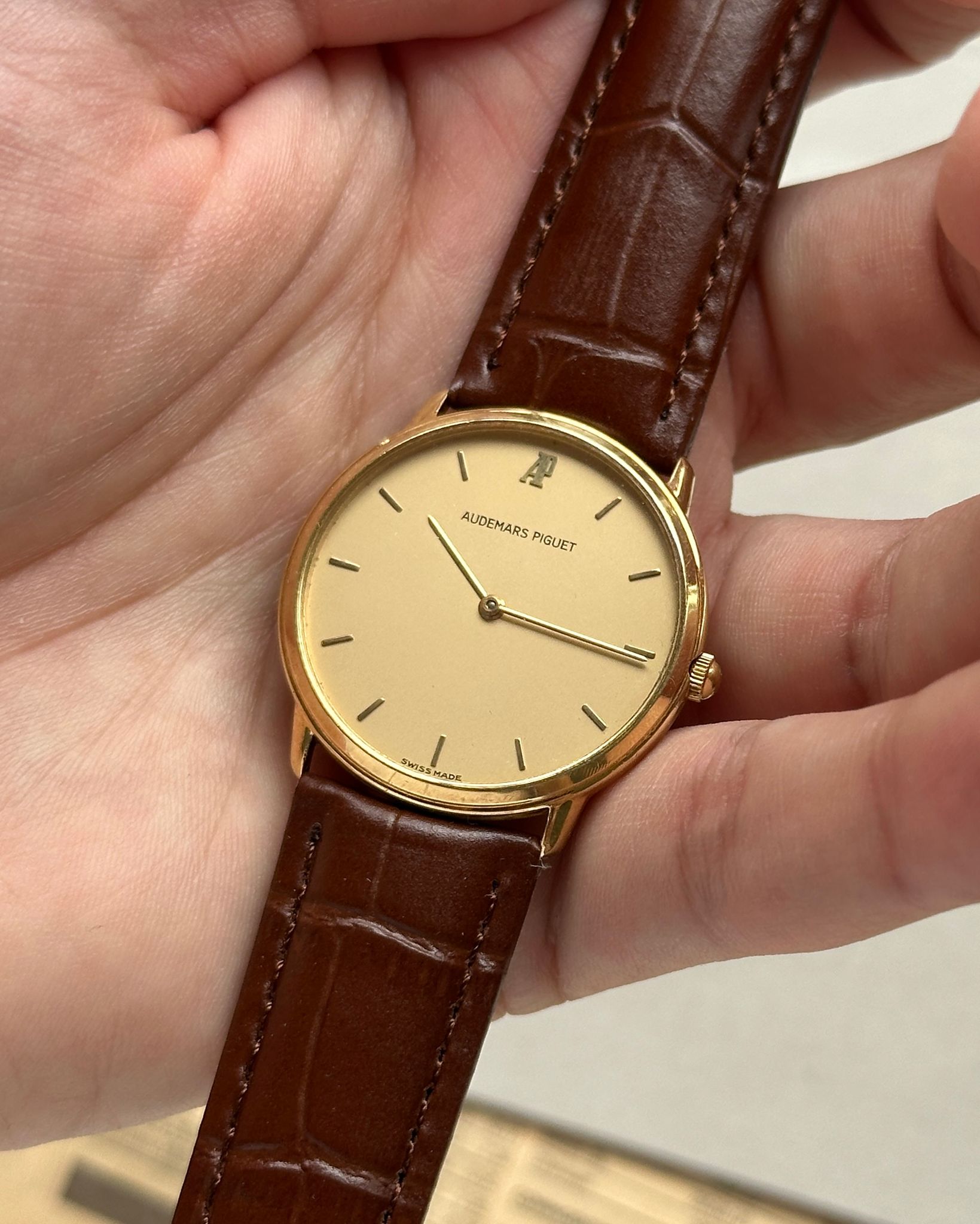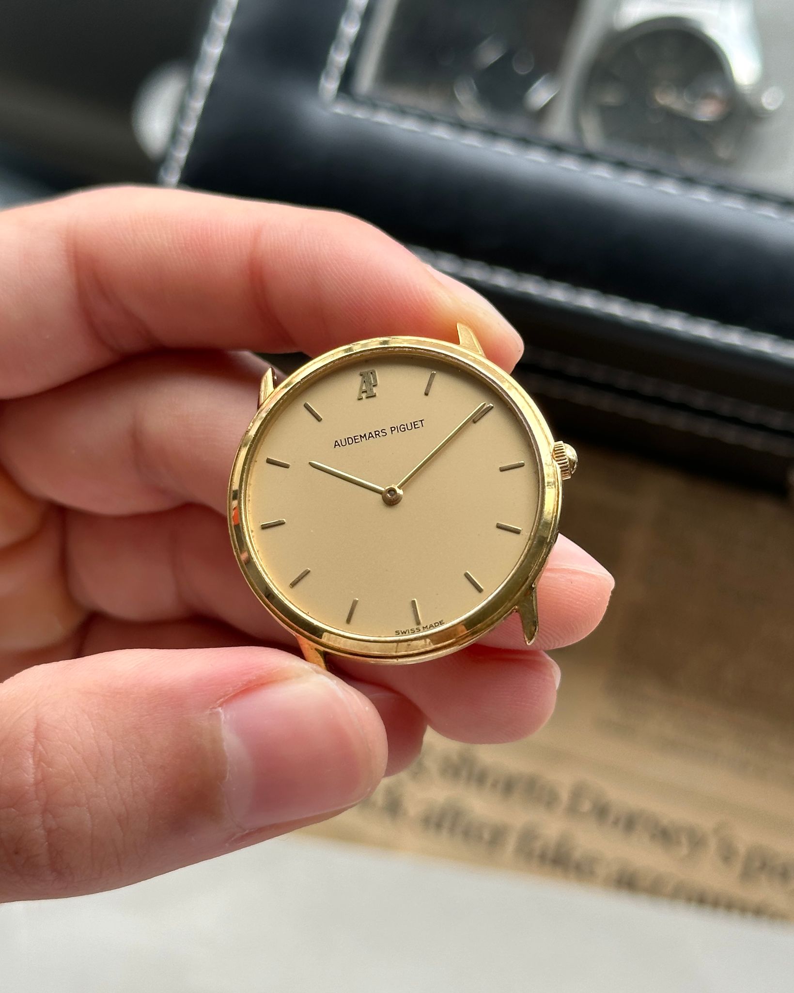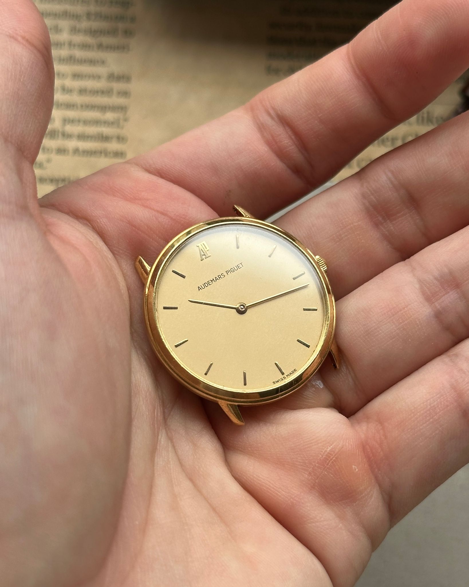 An exquisite 18K yellow gold Audemars Piguet Calatrava from the 1970s. This early example features a distinctive bombé caseback and a C-series case, showcasing a stunning champagne lemon dial and an ultra-thin profile.