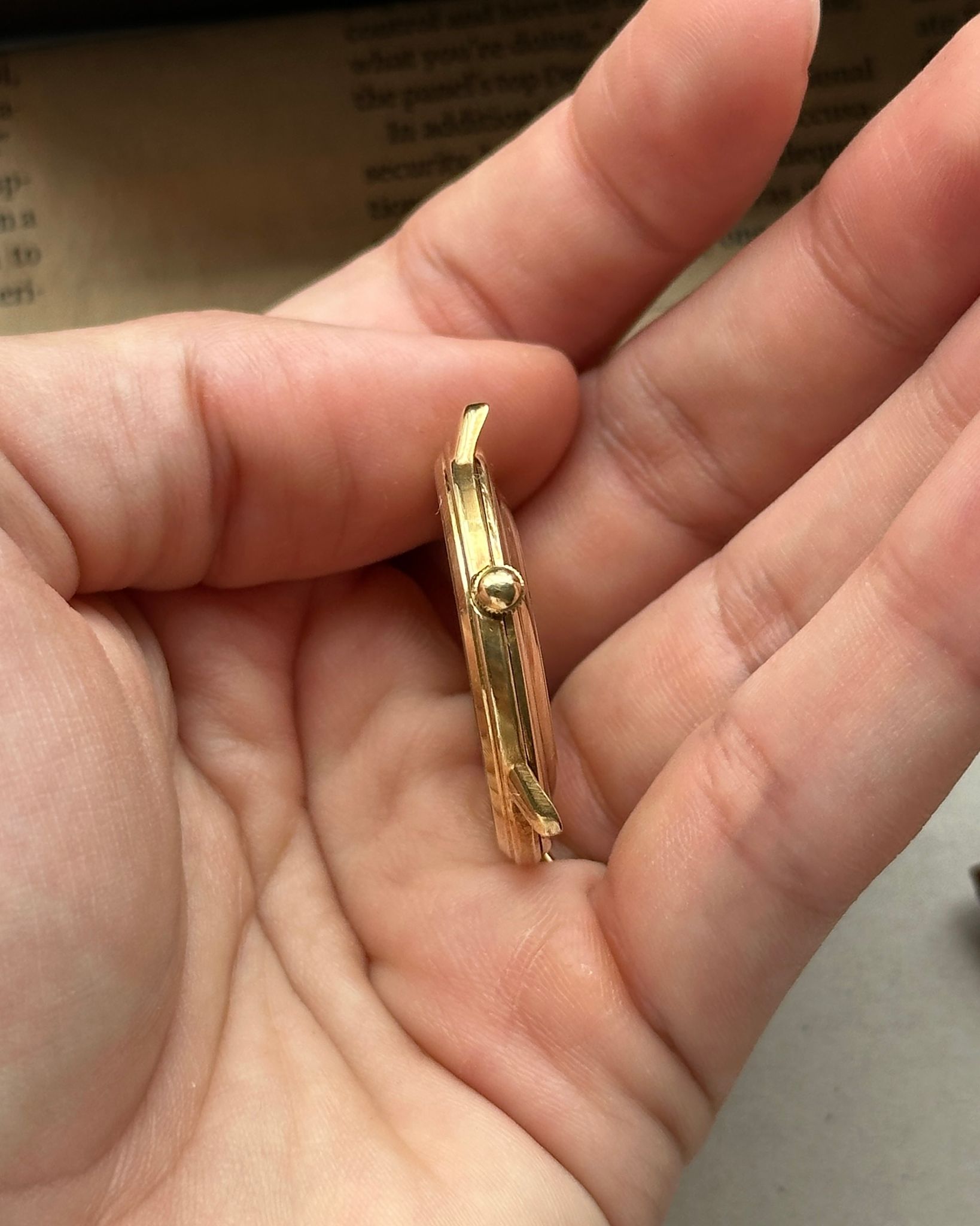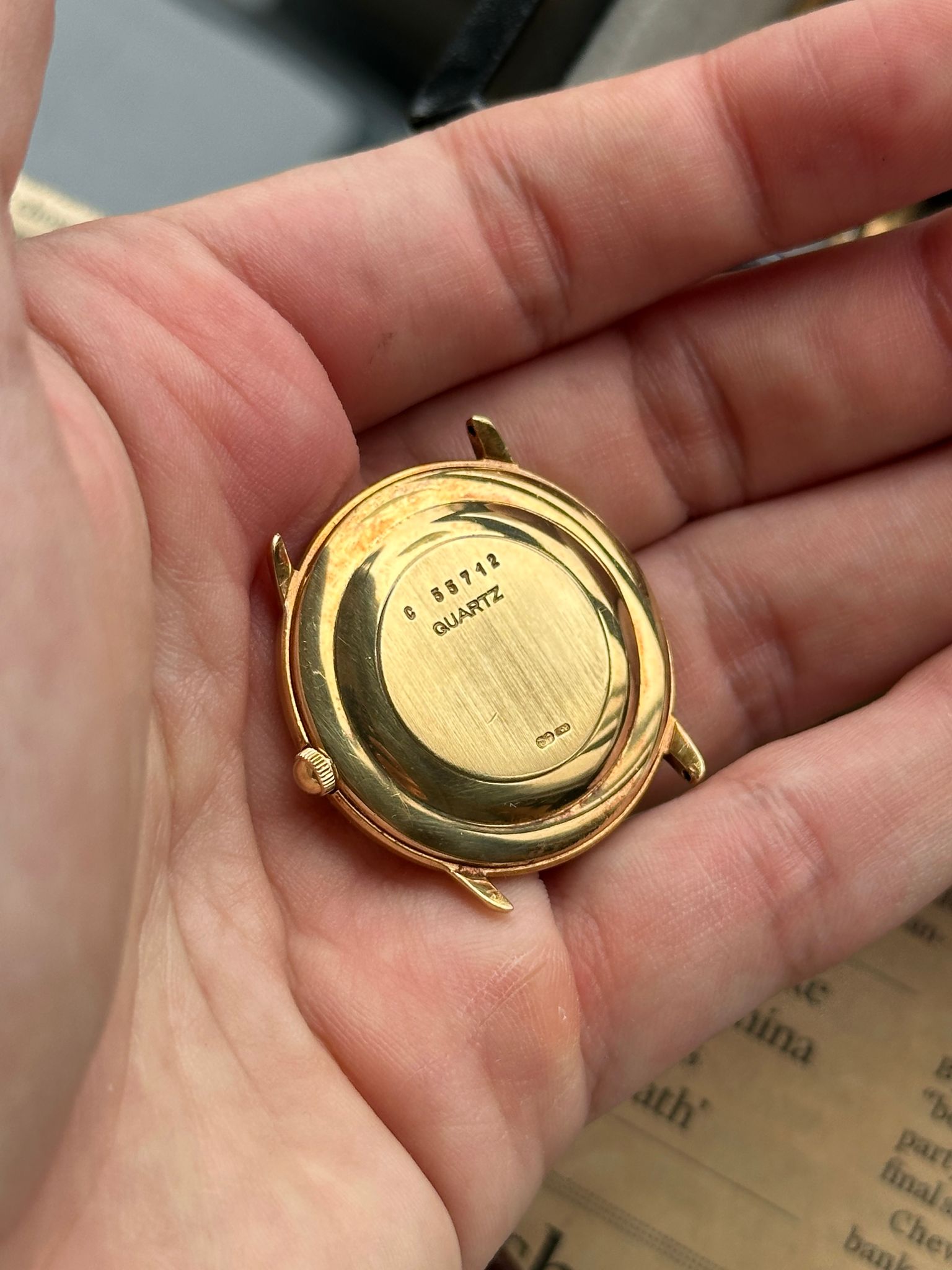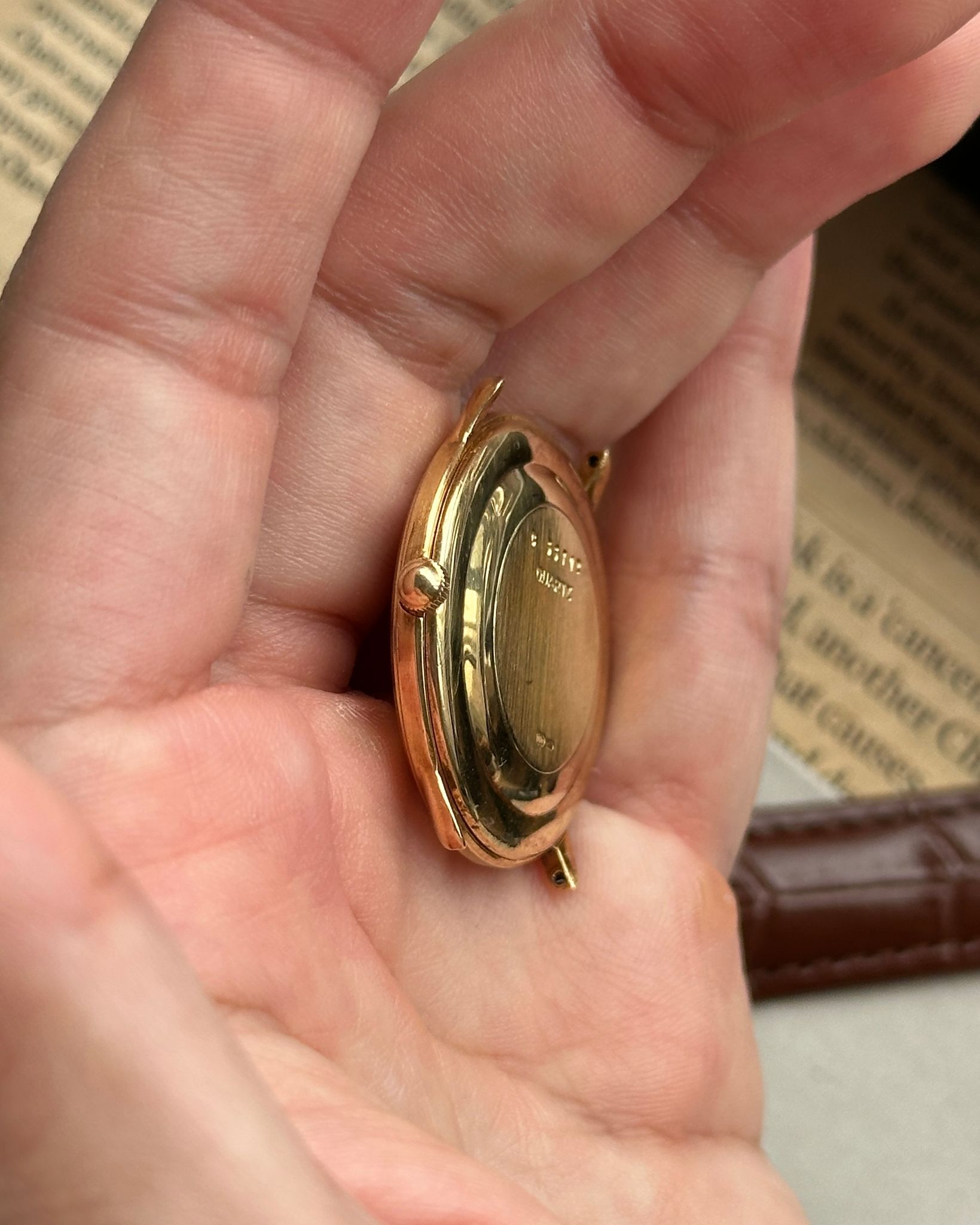 An exquisite 18K yellow gold Audemars Piguet Calatrava from the 1970s. This early example features a distinctive bombé caseback and a C-series case, showcasing a stunning champagne lemon dial and an ultra-thin profile.
