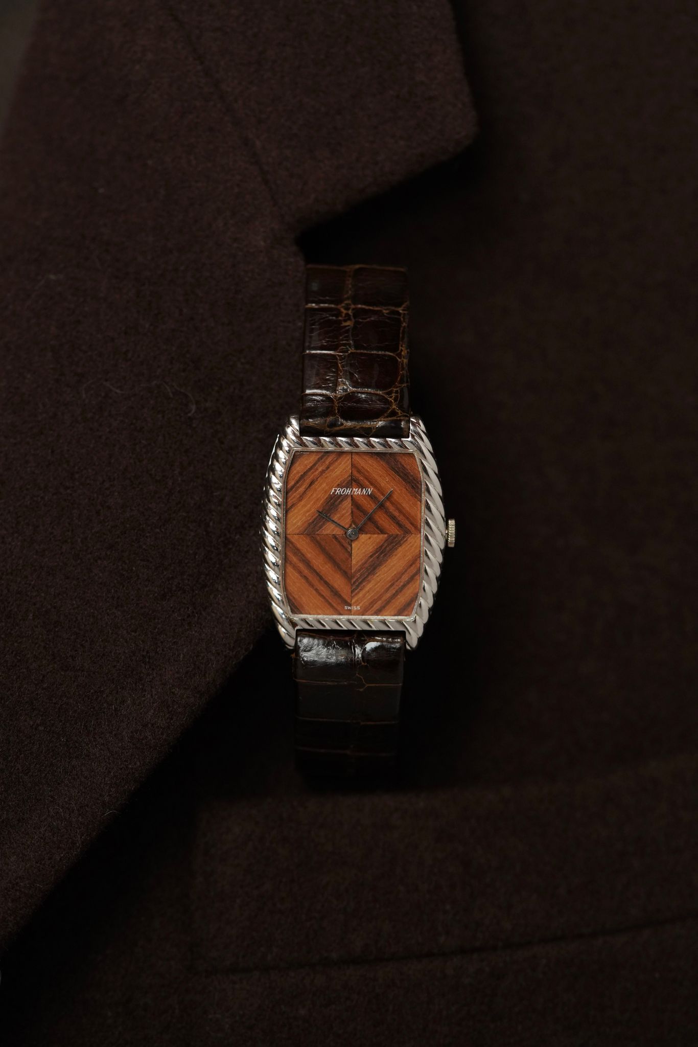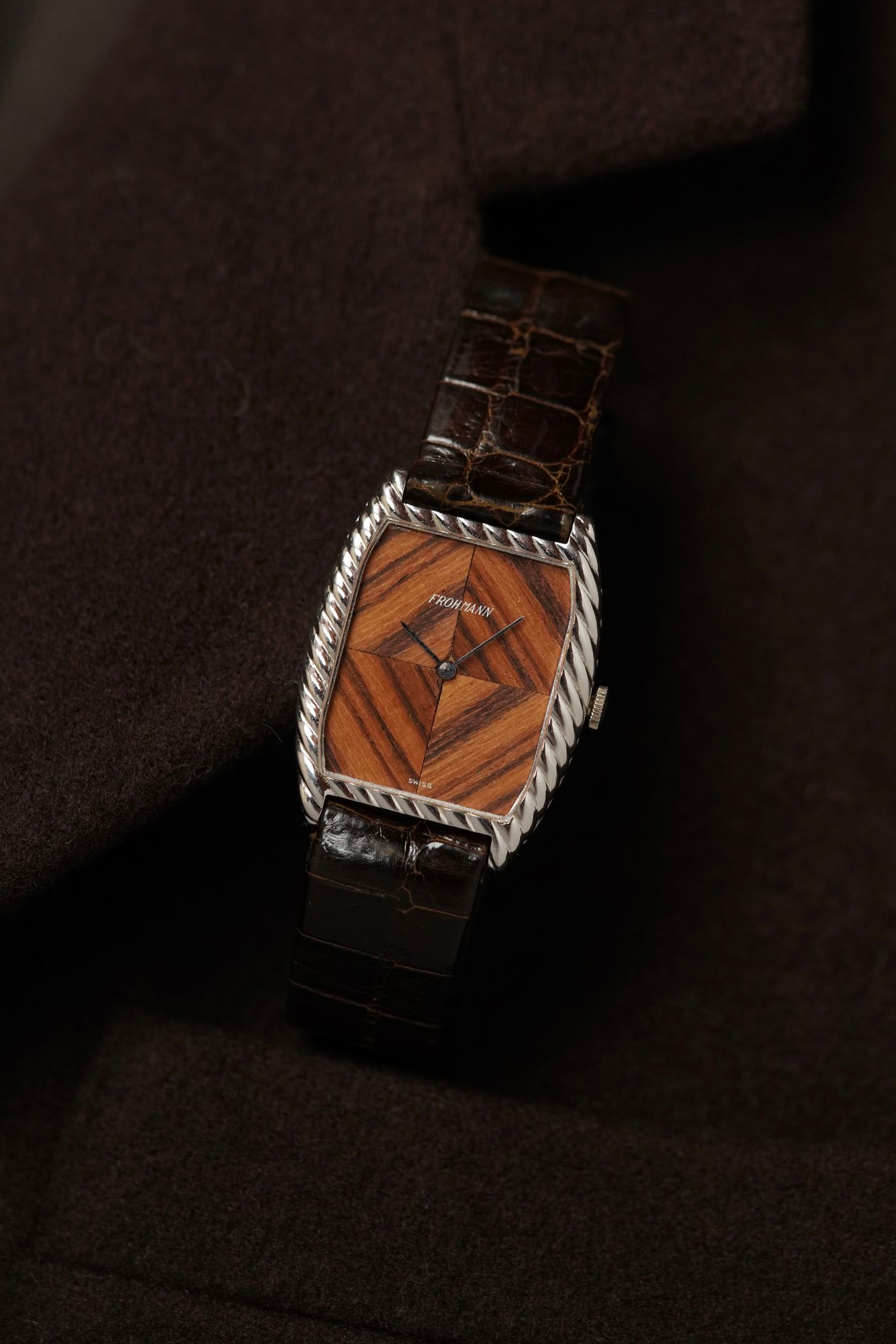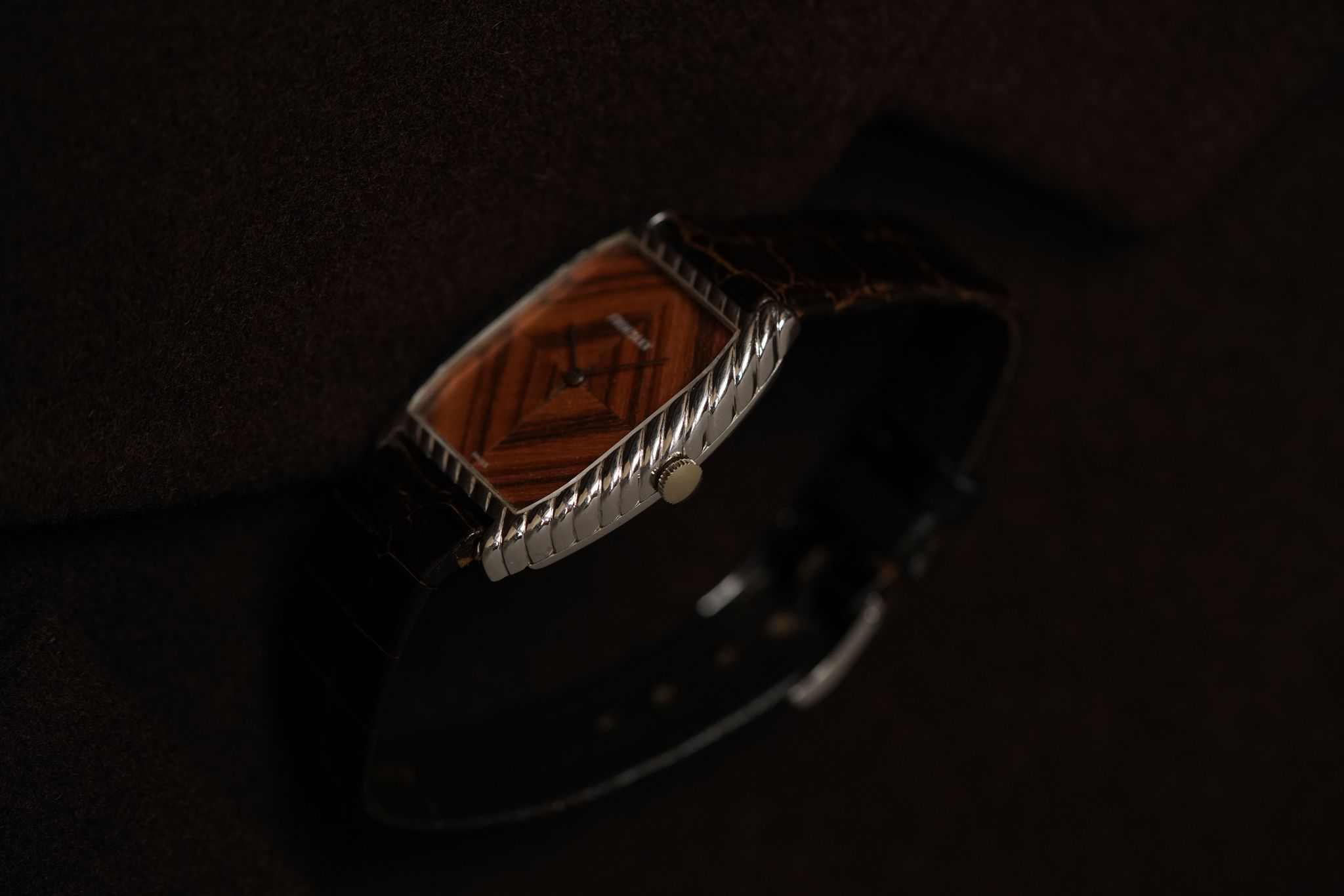 A large candy case in 18k white gold (29x35mm) with a perfectly symmetrical4 sector wooden dial cut so perfectly as to form a diamond motif. Made by Gerald Genta using a manual wound Ebel calibre for the Antwerp based jeweller Frohmann.