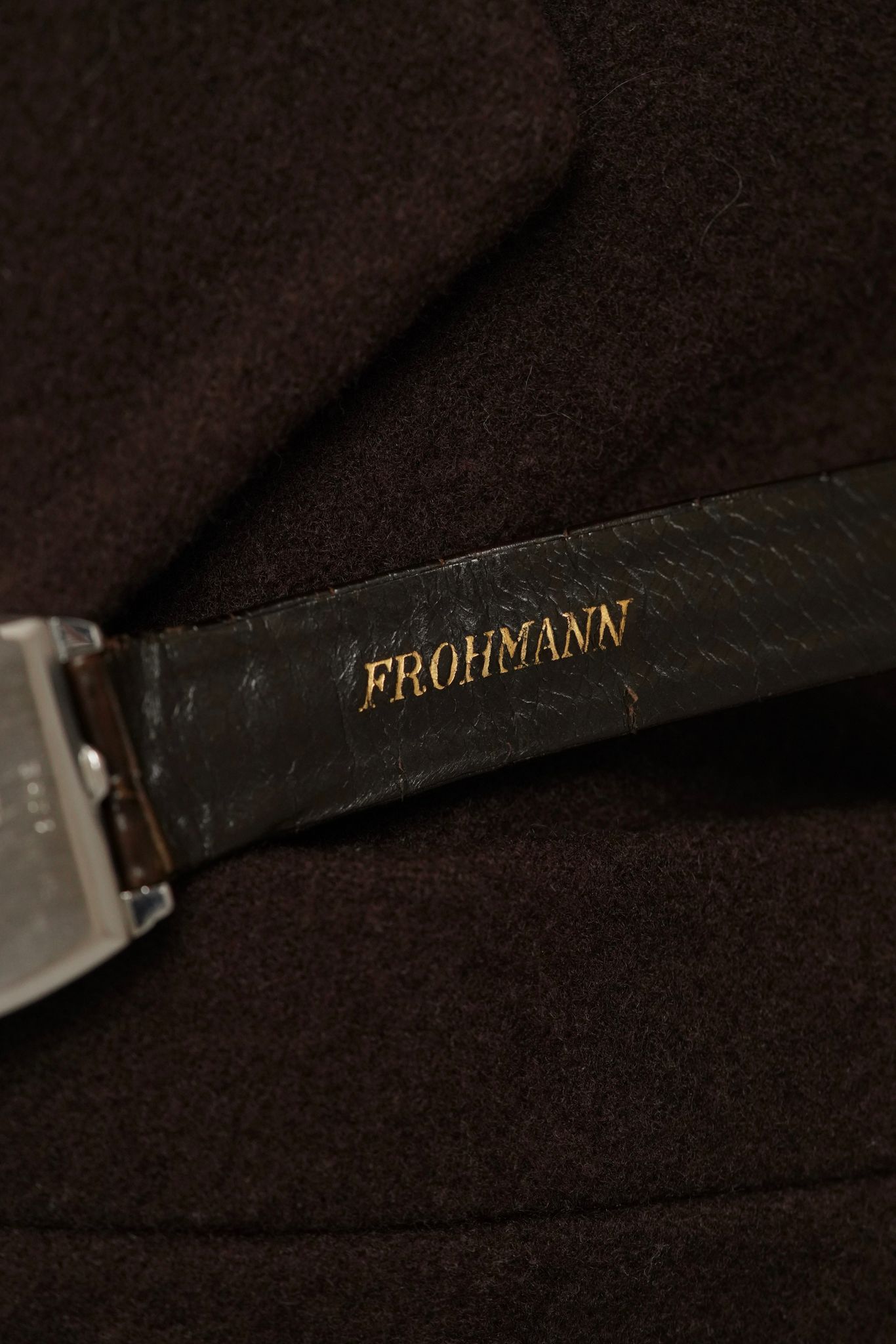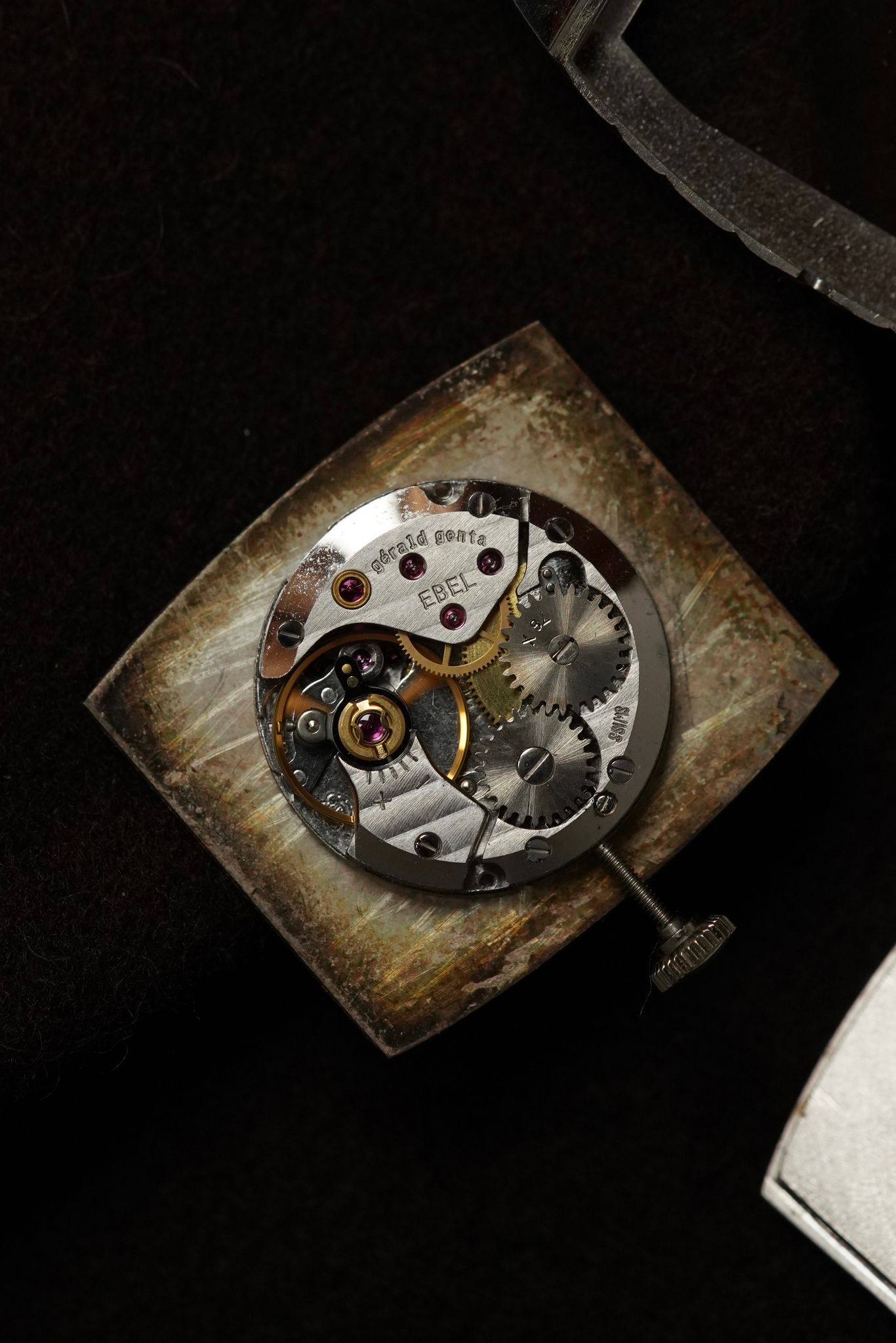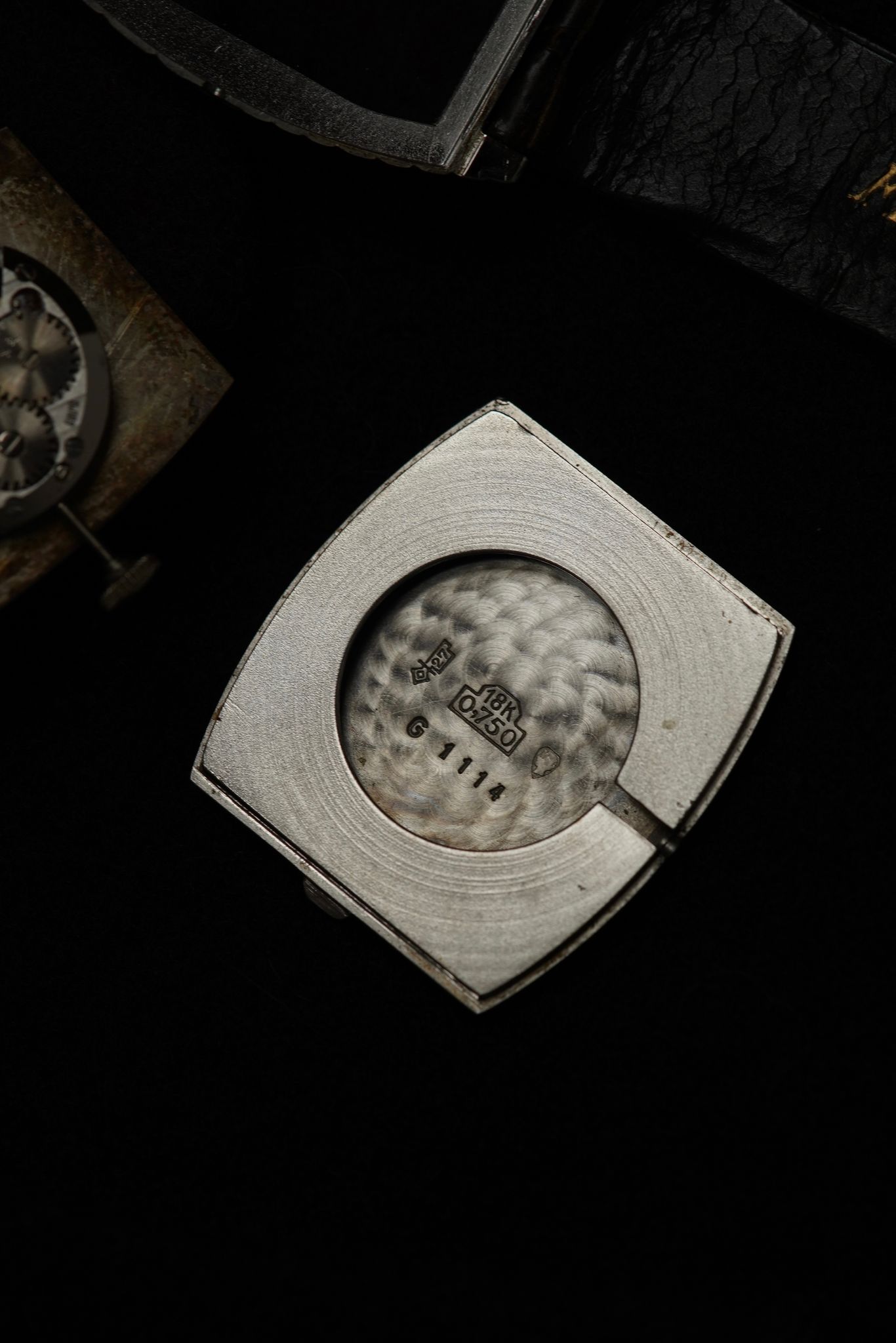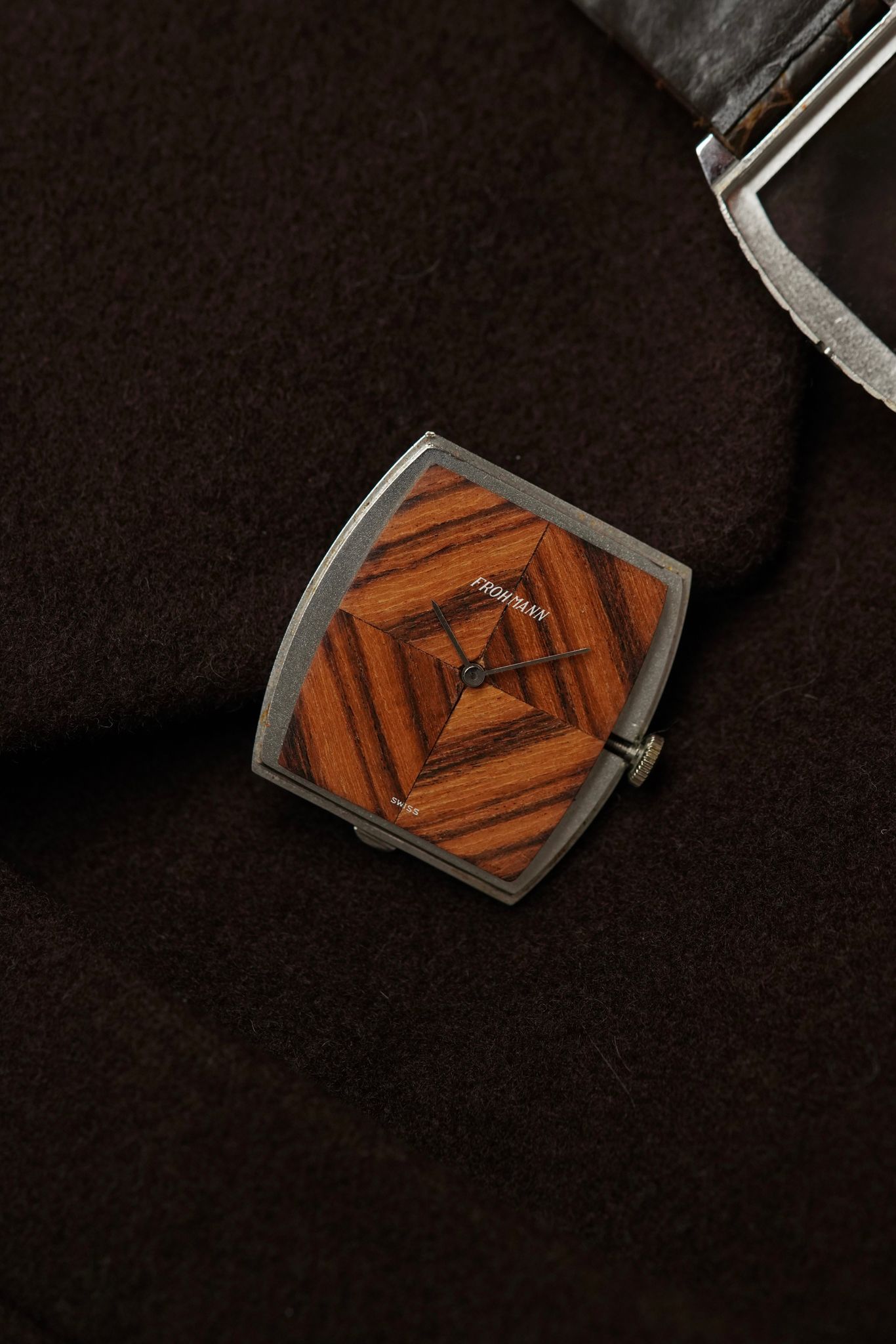 A large candy case in 18k white gold (29x35mm) with a perfectly symmetrical4 sector wooden dial cut so perfectly as to form a diamond motif. Made by Gerald Genta using a manual wound Ebel calibre for the Antwerp based jeweller Frohmann.