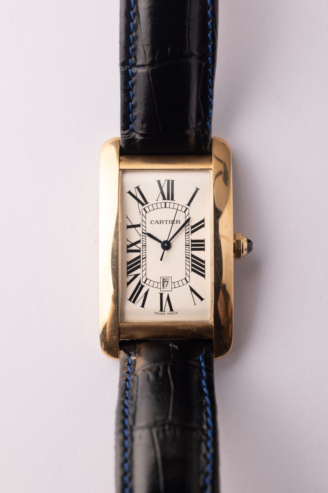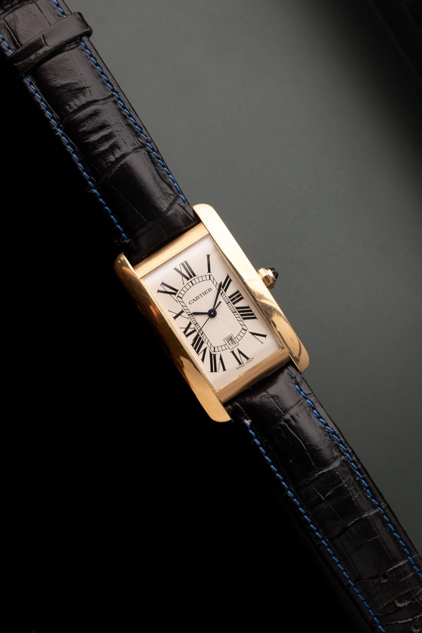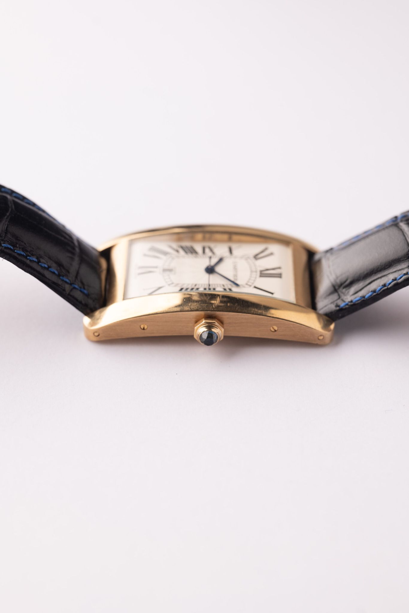 The Tank Américaine is the jumbo xl Tank with a beautiful curvature that melts onto your wrist. The dimensions are 44×27 mm and the iconic eggshell dial includes Cartier’s hidden logo in the VII o’clock marker. Hands are blued steel and the leather band has contrasting blue stiching. Comes with box only.