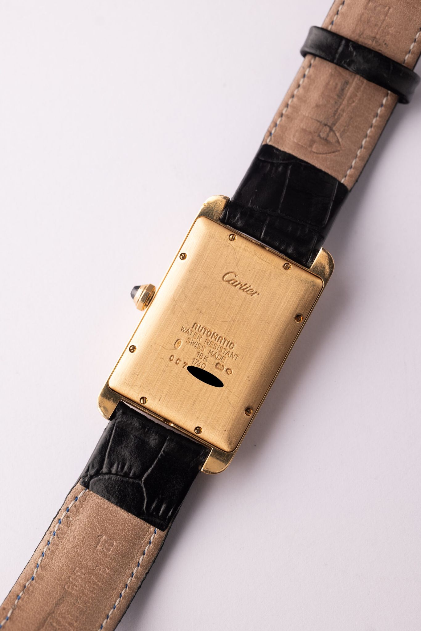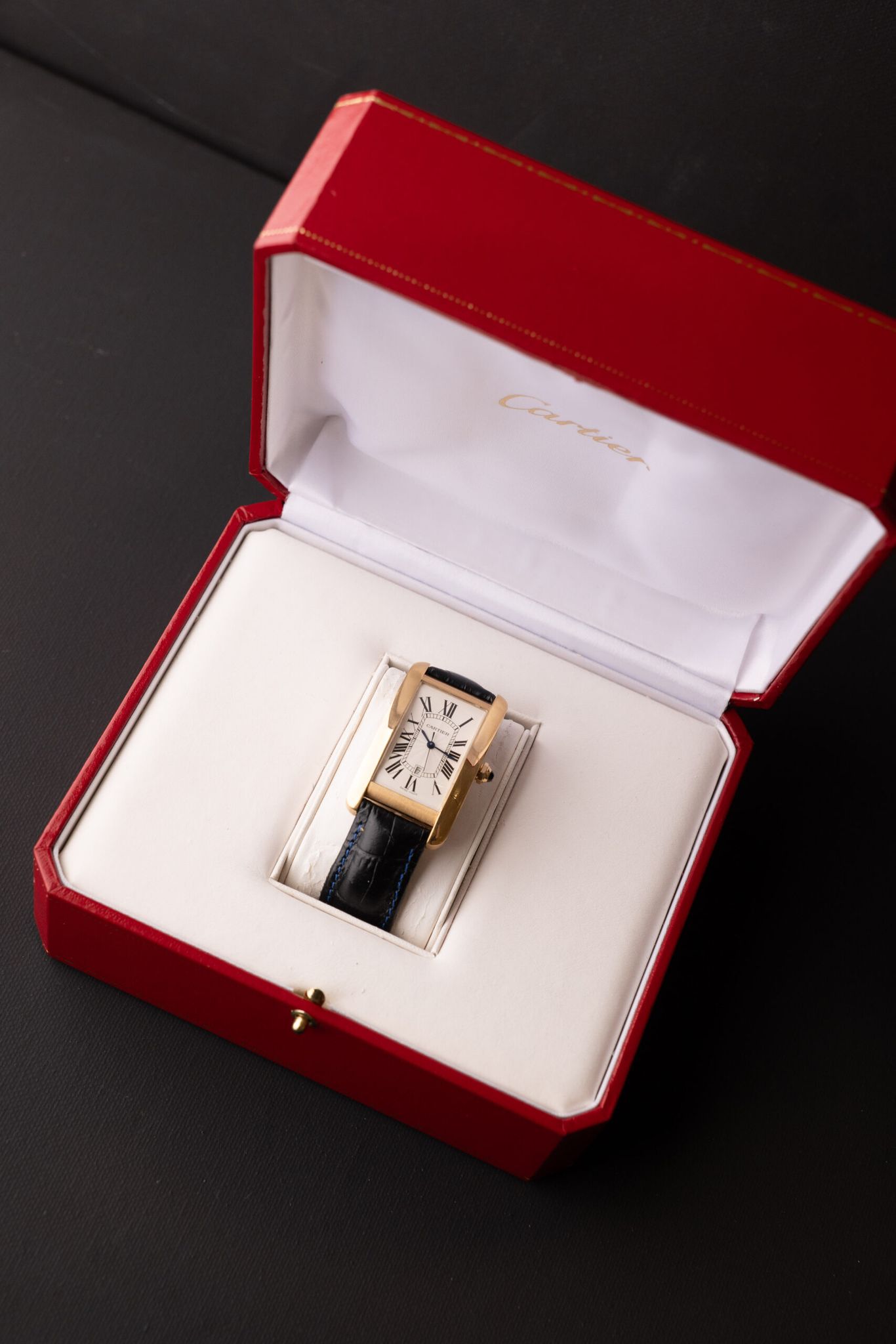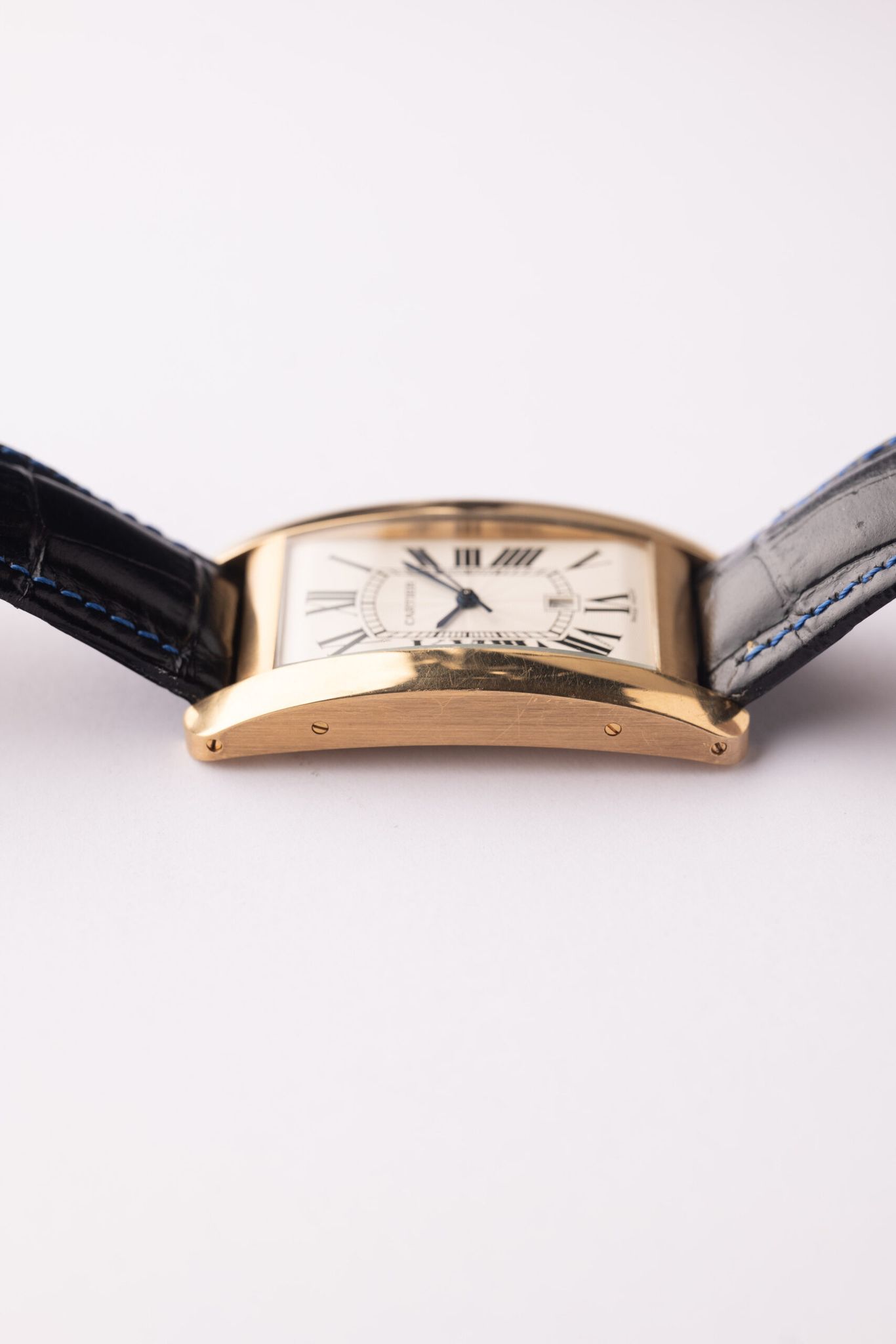 The Tank Américaine is the jumbo xl Tank with a beautiful curvature that melts onto your wrist. The dimensions are 44×27 mm and the iconic eggshell dial includes Cartier’s hidden logo in the VII o’clock marker. Hands are blued steel and the leather band has contrasting blue stiching. Comes with box only.
