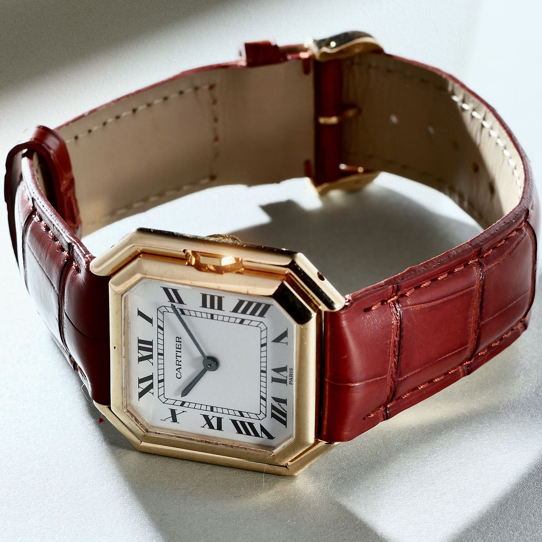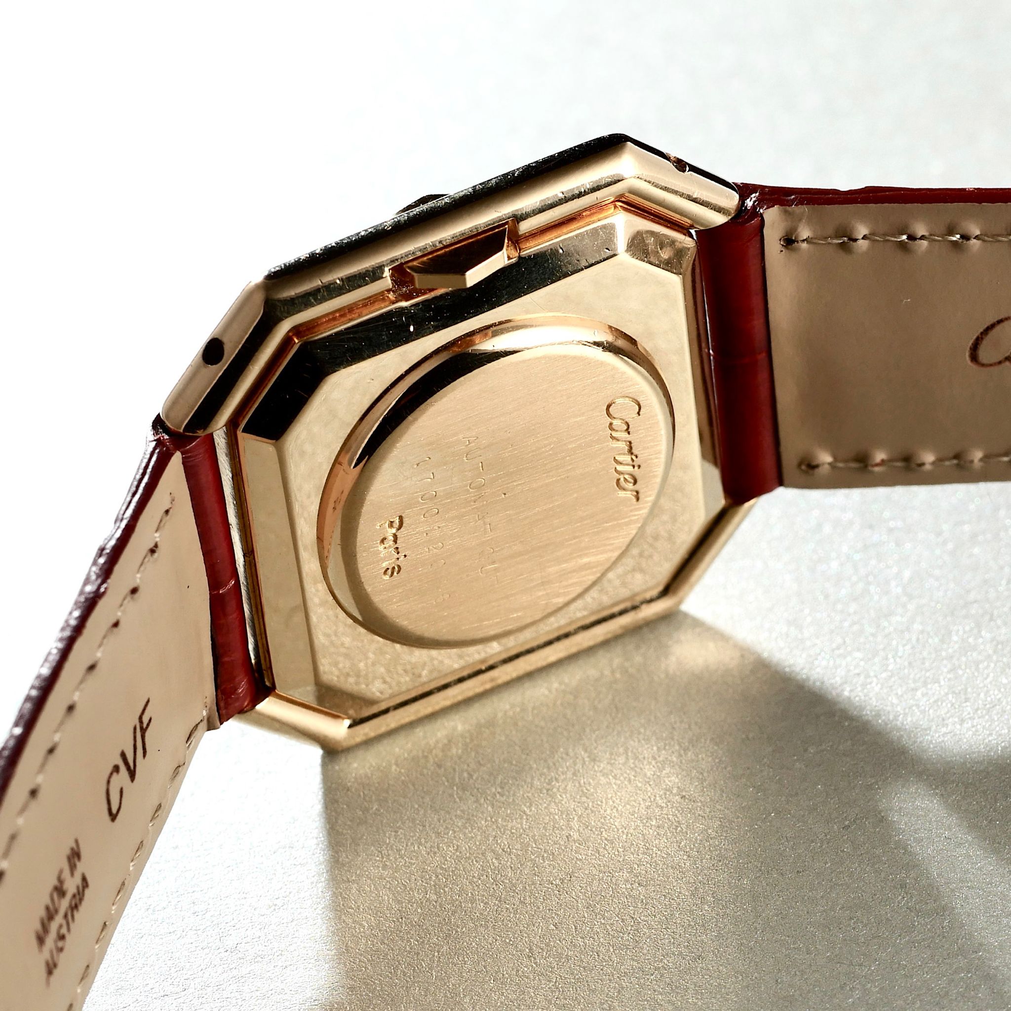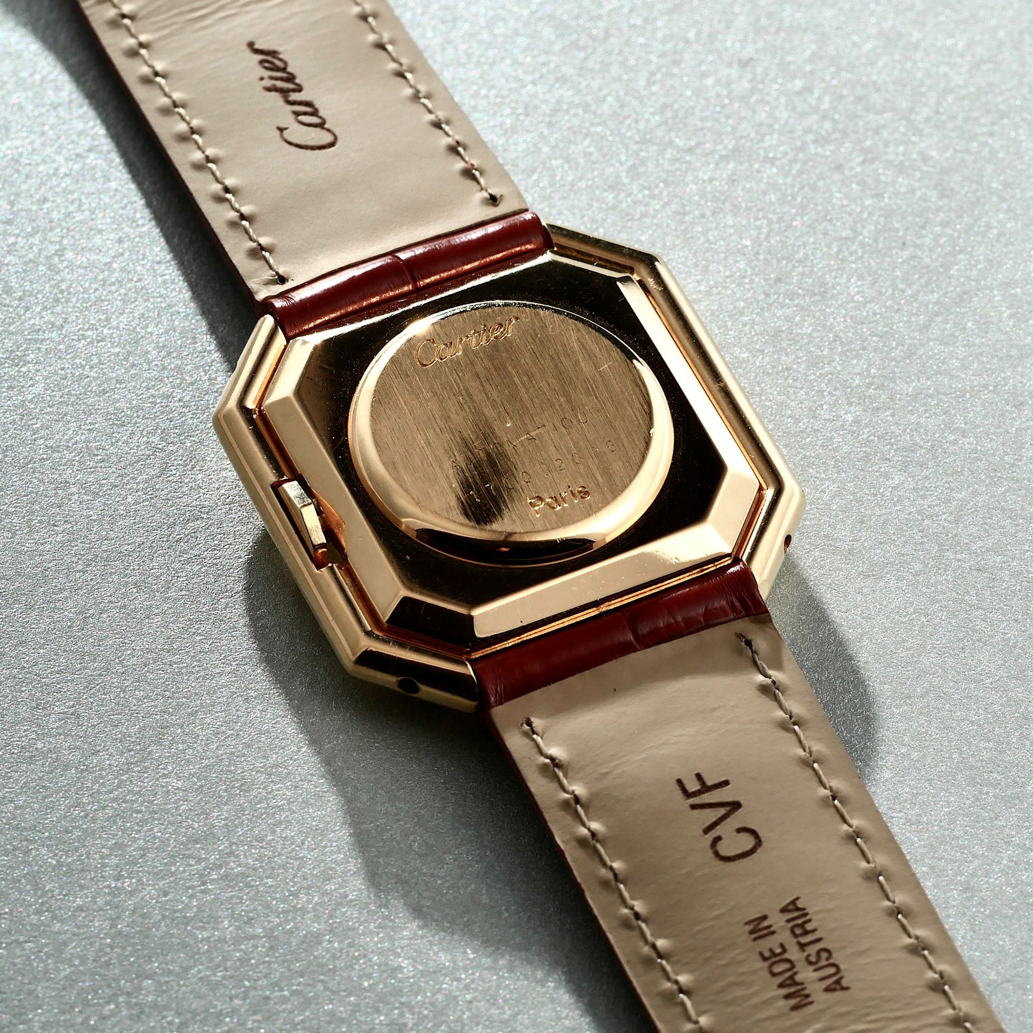FEATURES: 18k gold, Solid Caseback, Original Cartier brown leather strap, Original gold Cartier Clasp, 31 mm x 31 mm case, Limited Production, Bubble back, Paris Dial