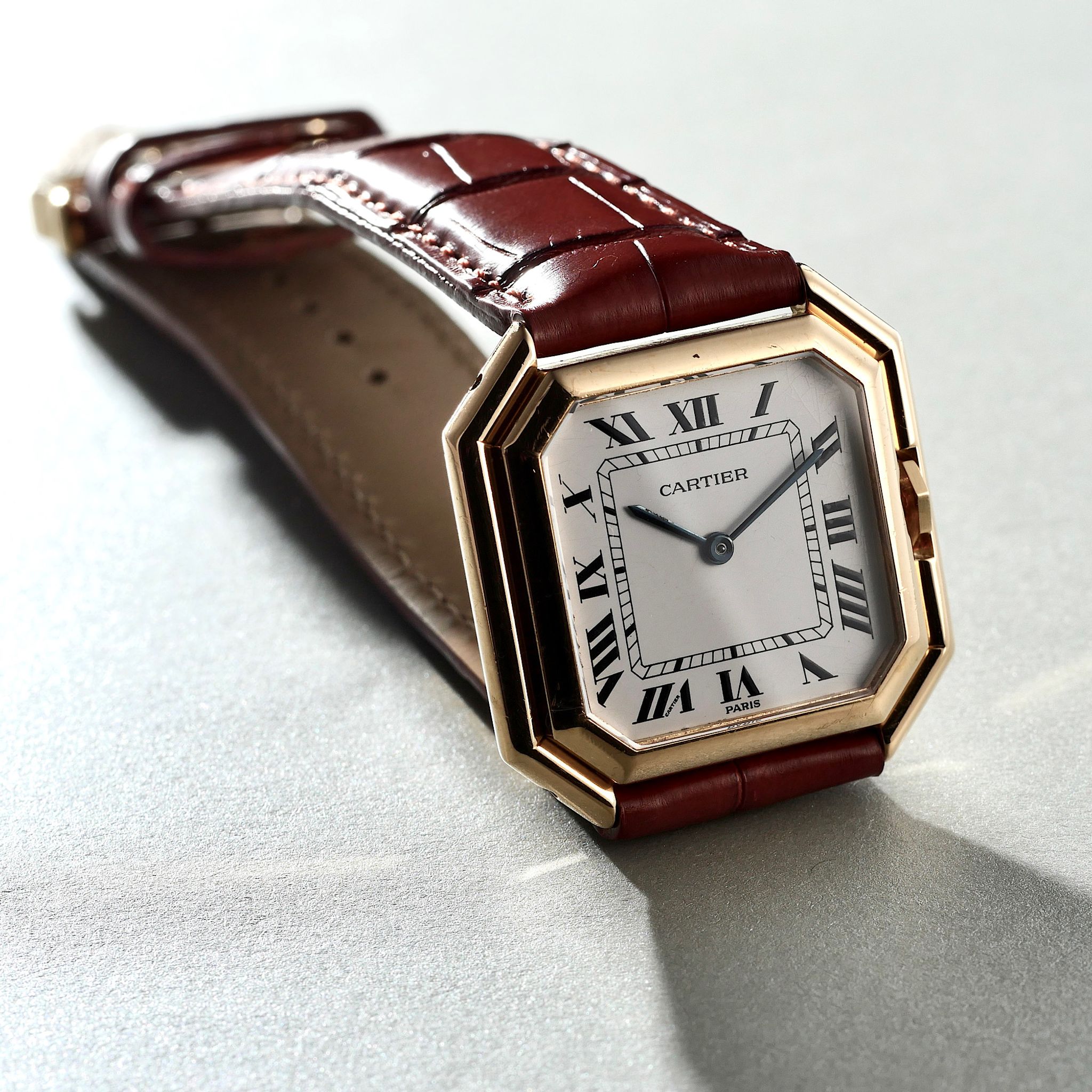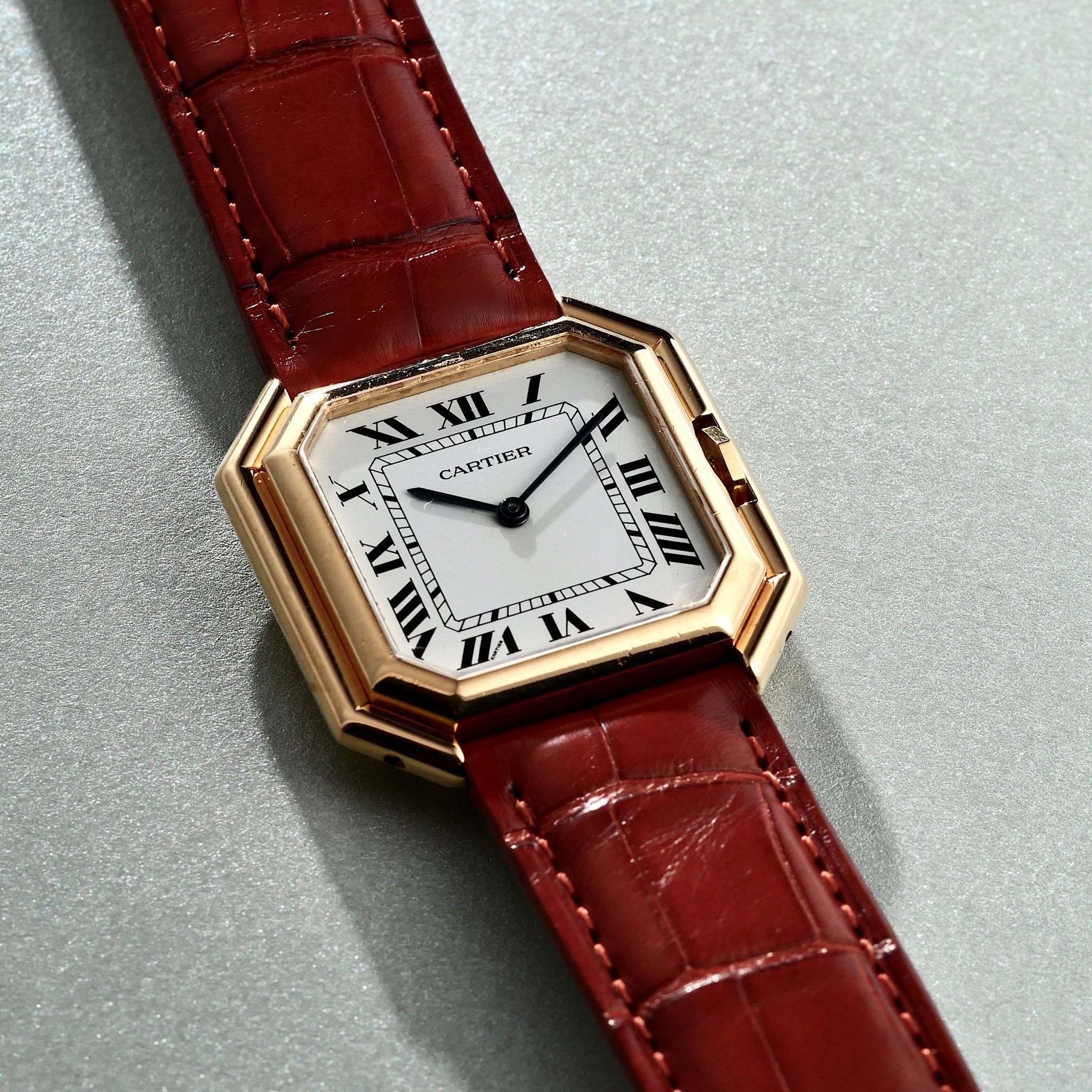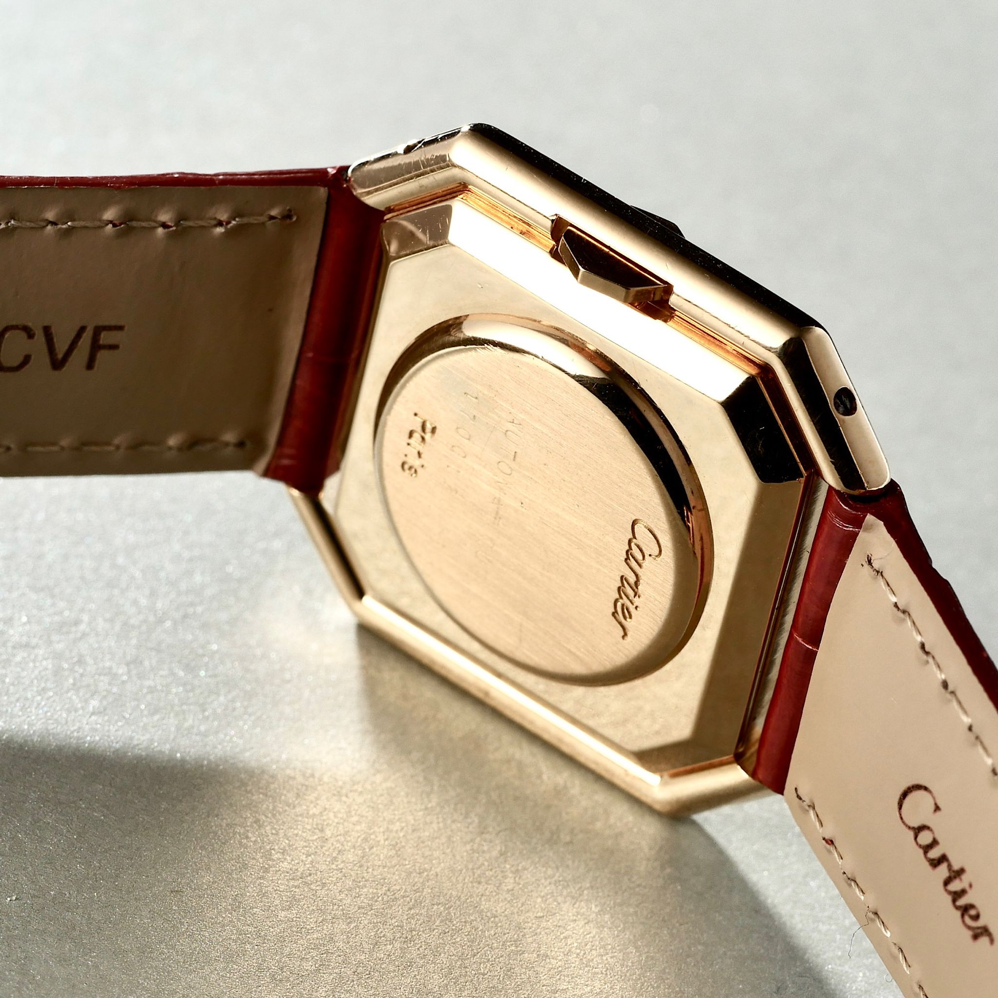 FEATURES: 18k gold, Solid Caseback, Original Cartier brown leather strap, Original gold Cartier Clasp, 31 mm x 31 mm case, Limited Production, Bubble back, Paris Dial