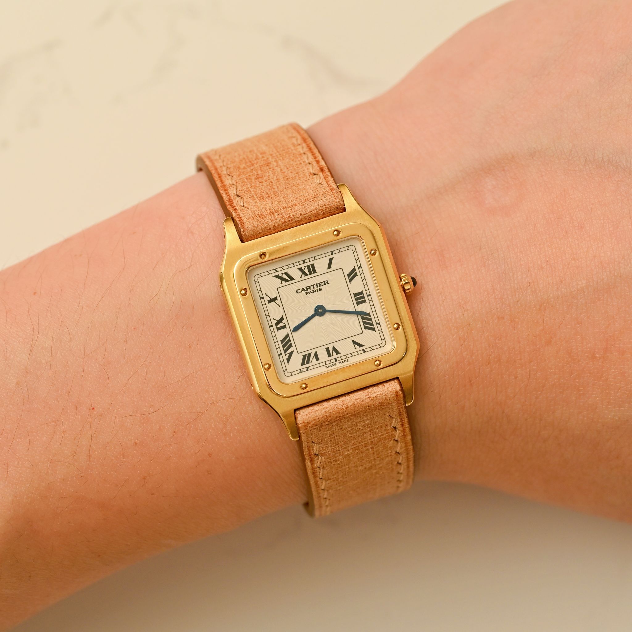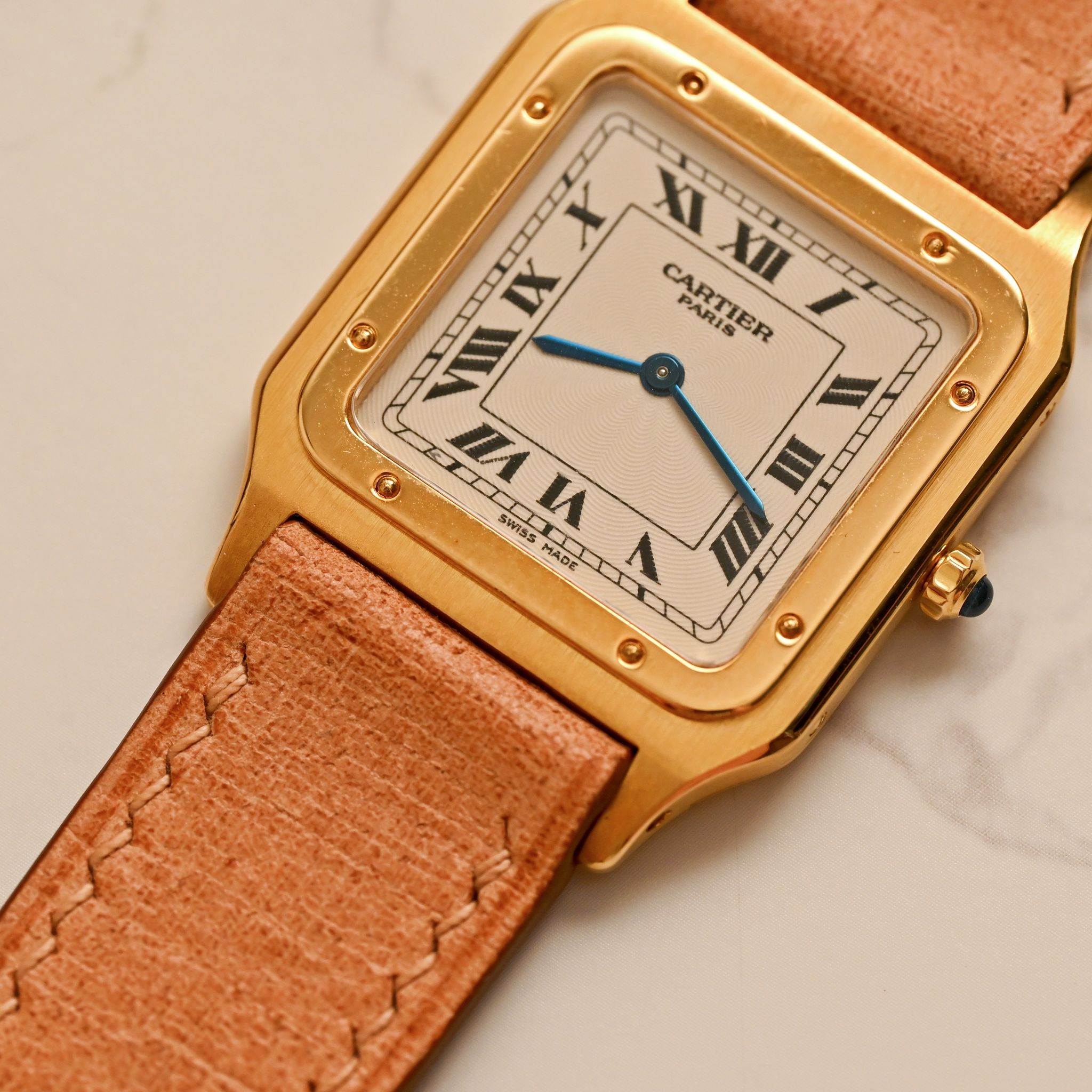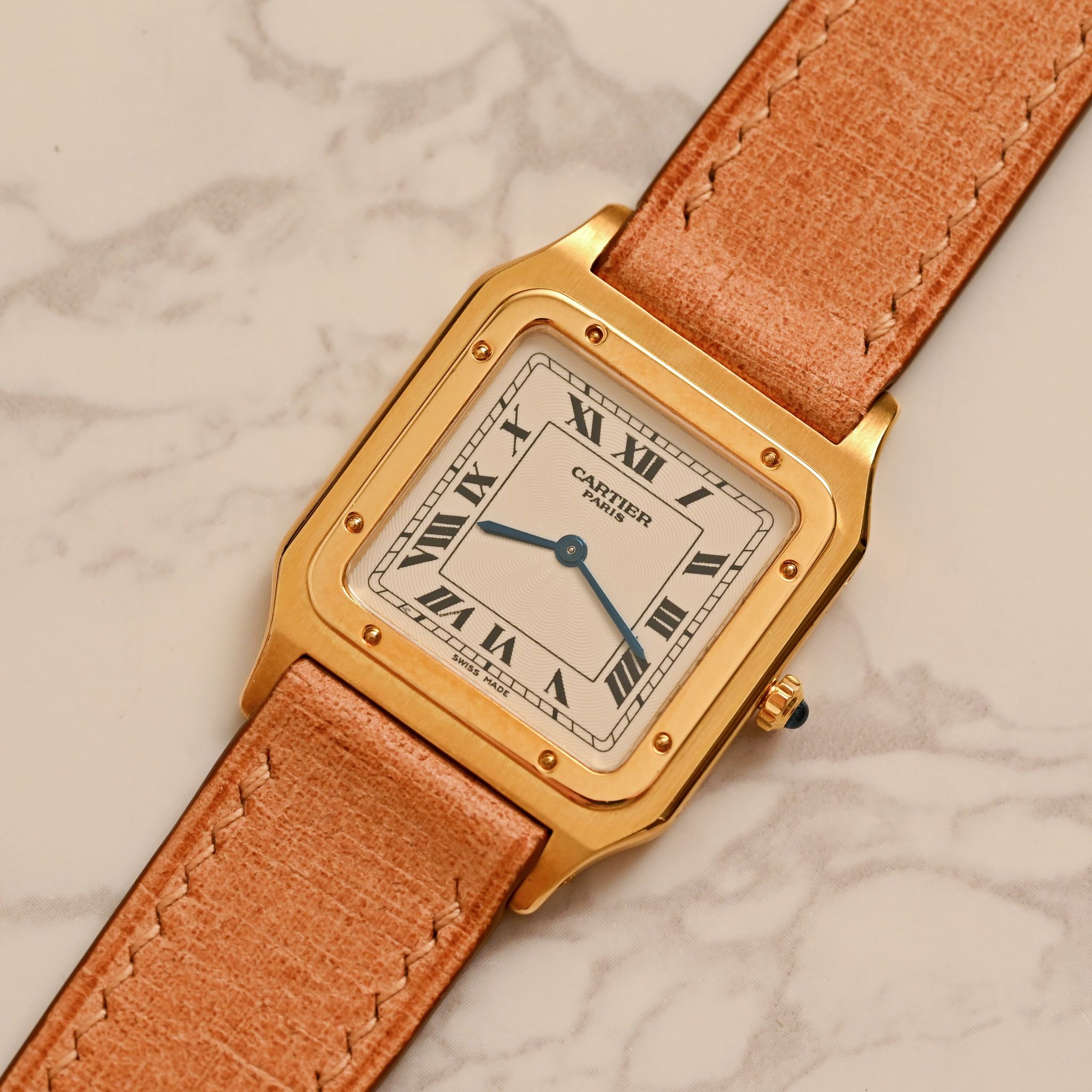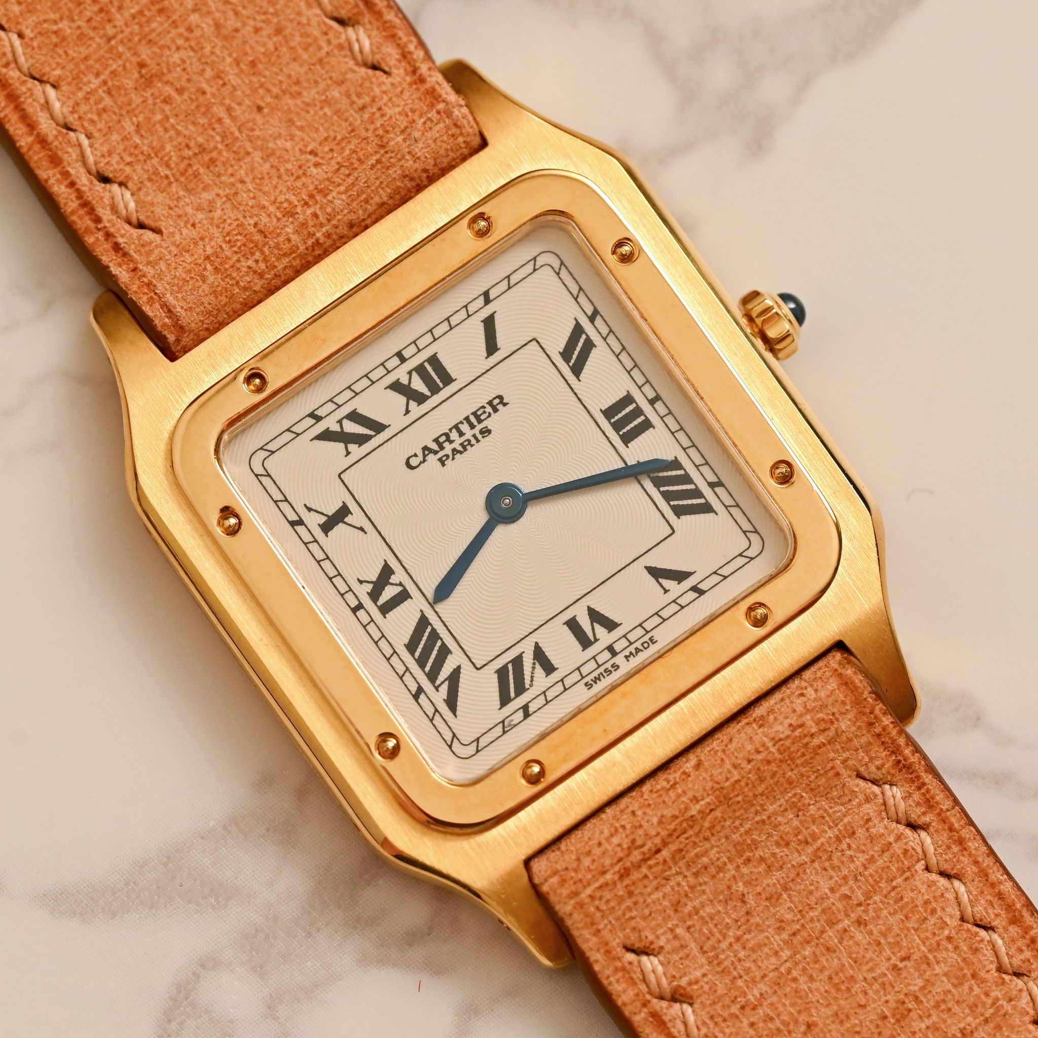 The Santos Dumont, created in 1904 for aviator Alberto Santos-Dumont, is one of Cartier's most iconic watches, known for its practicality and elegance. This particular CPCP model, from the late 1990s, features a 18k yellow gold case and a pristine dial. The ref. 1576B measures 27 mm by 36mm, making it ideal for those with slightly larger wrists. It houses the high-quality FP manual winding movement and is in exceptional condition, making it a valuable addition for any collector.