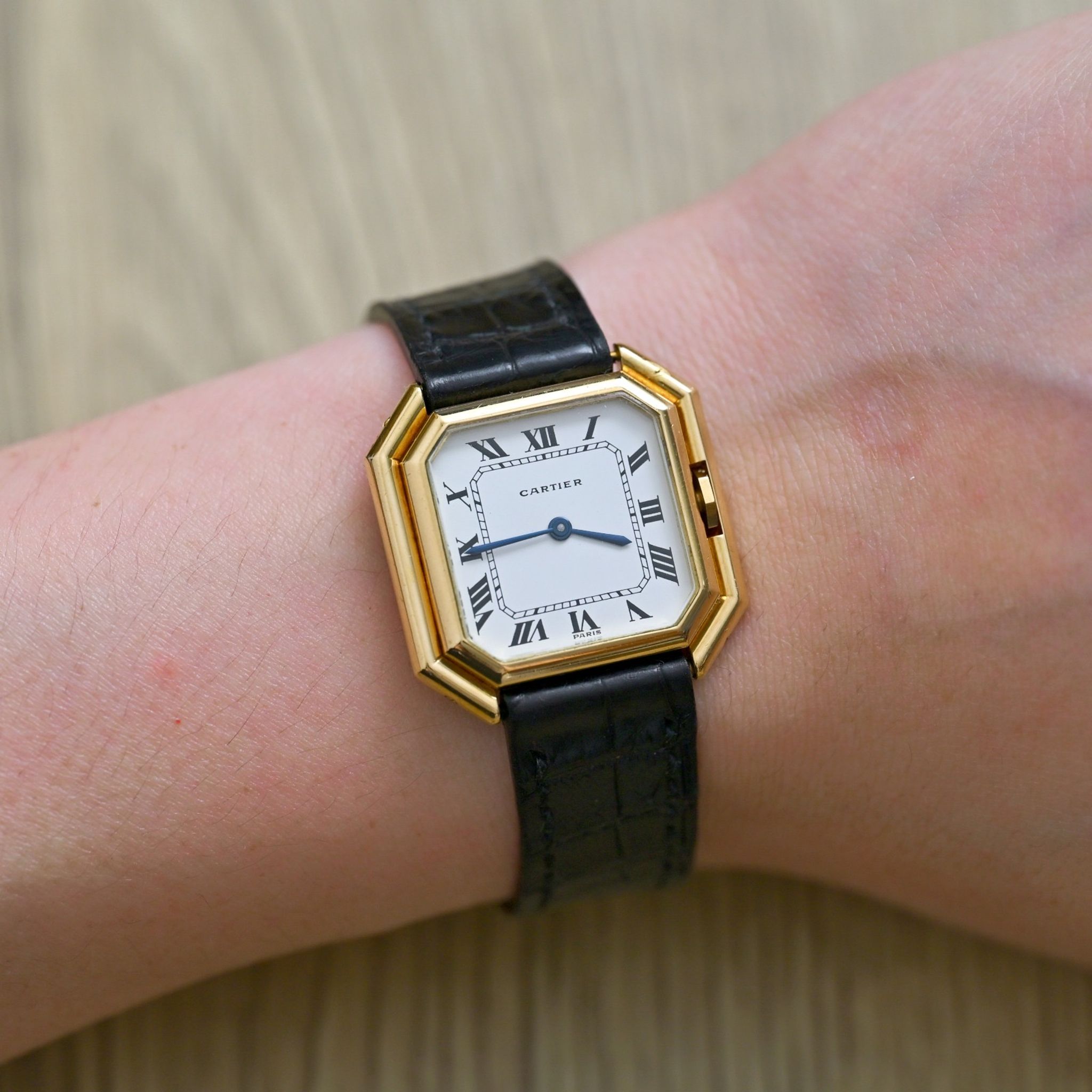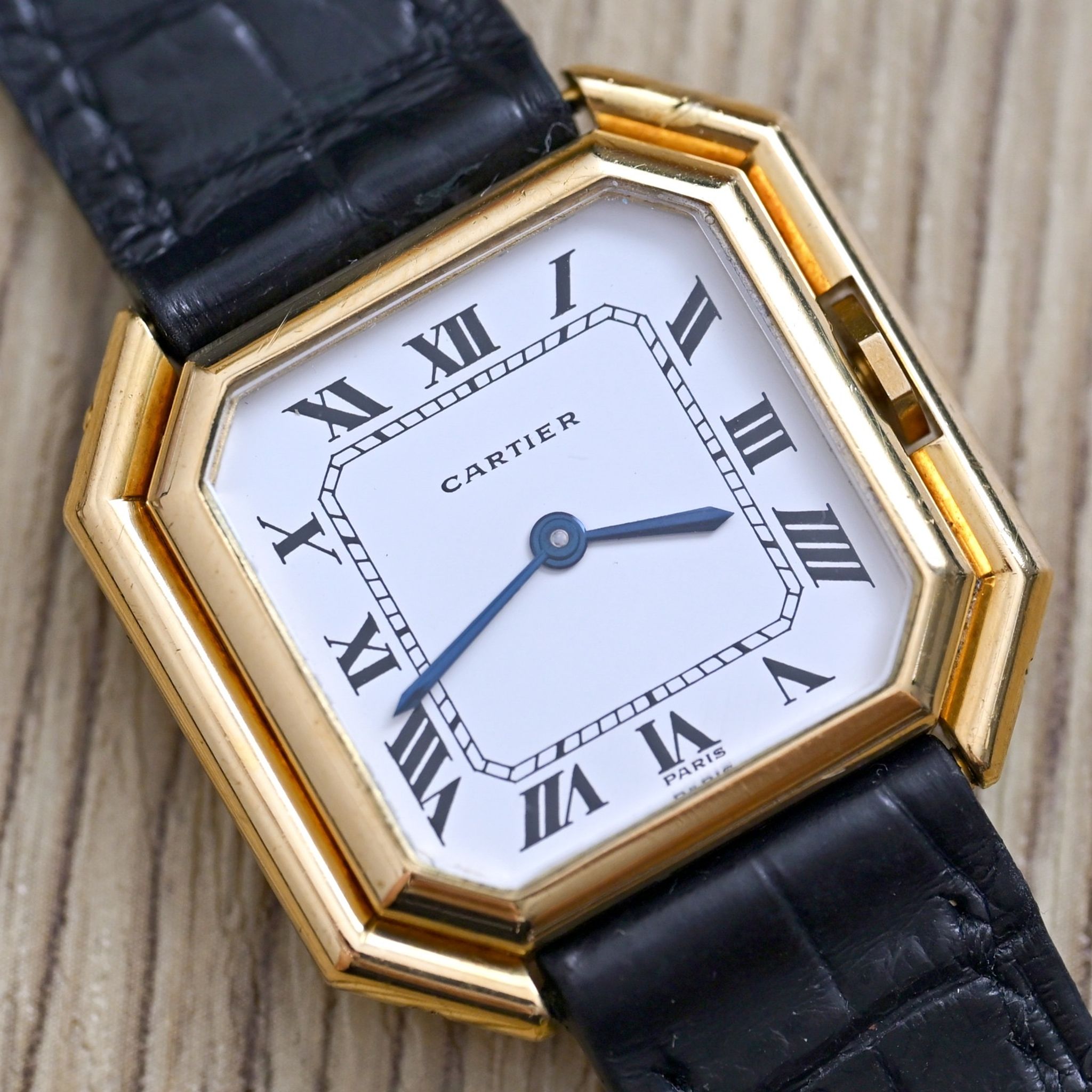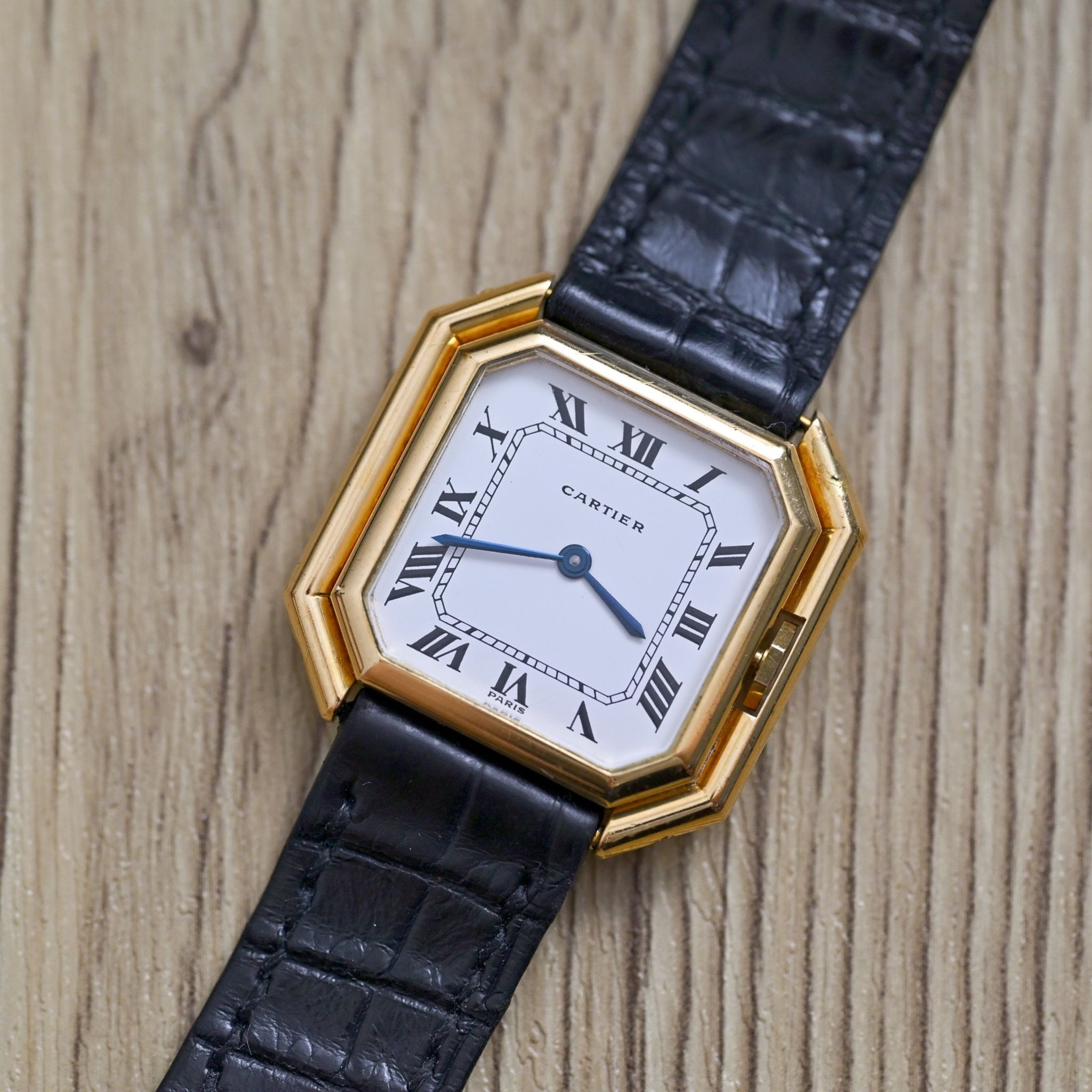 The Cartier Ceinture is an often overlooked yet eclectic timepiece from the Cartier brand. Produced for only a brief period during the 1970s, this model has never been recreated since. True to its name, which translates to "belt" in French, the Ceinture's square case with missing corners was intentionally designed to mimic the aesthetic of a belt buckle. This unique and unconventional case shape, crafted in 18K yellow gold, sets the Ceinture apart from Cartier's more well-known watch models, making it a distinctive and sometimes forgotten gem within the brand's storied history. Powered by an automatic movement, the Cartier Ceinture combines an eye-catching design with reliable mechanical functionality.