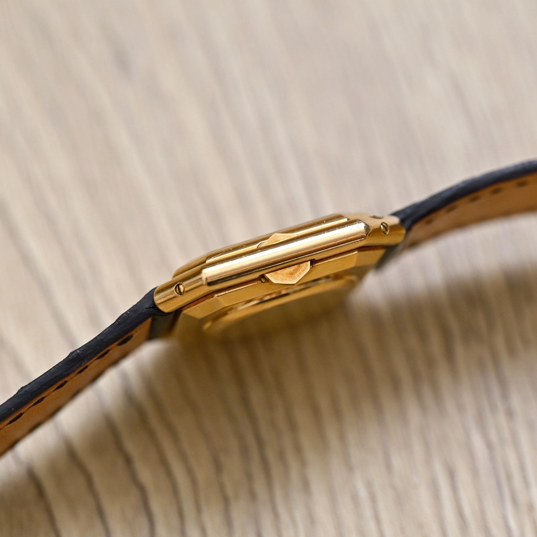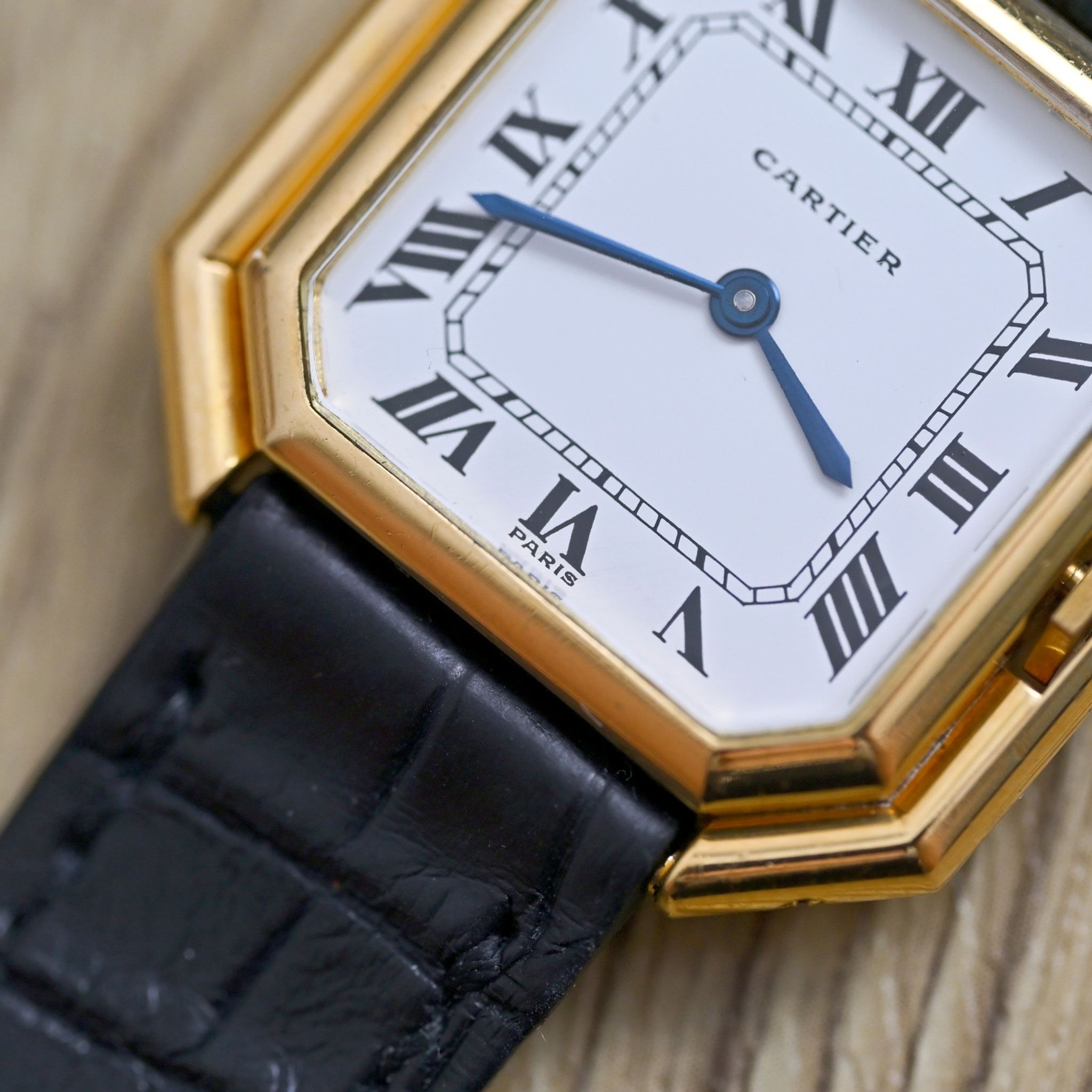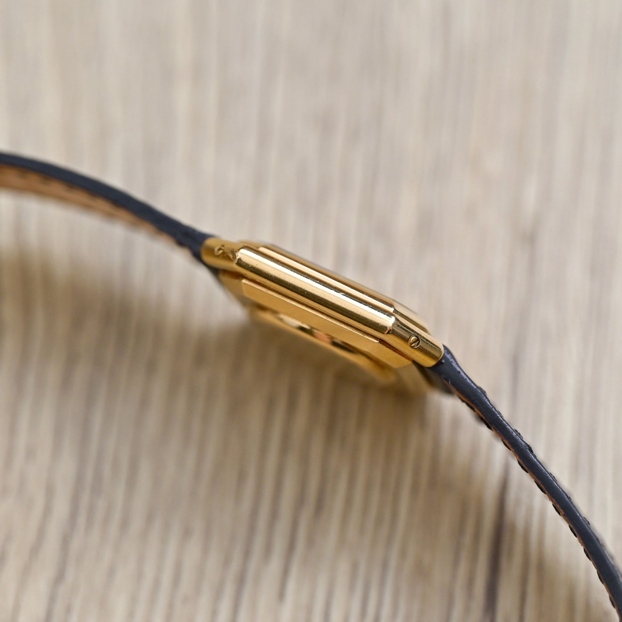 The Cartier Ceinture is an often overlooked yet eclectic timepiece from the Cartier brand. Produced for only a brief period during the 1970s, this model has never been recreated since. True to its name, which translates to "belt" in French, the Ceinture's square case with missing corners was intentionally designed to mimic the aesthetic of a belt buckle. This unique and unconventional case shape, crafted in 18K yellow gold, sets the Ceinture apart from Cartier's more well-known watch models, making it a distinctive and sometimes forgotten gem within the brand's storied history. Powered by an automatic movement, the Cartier Ceinture combines an eye-catching design with reliable mechanical functionality.