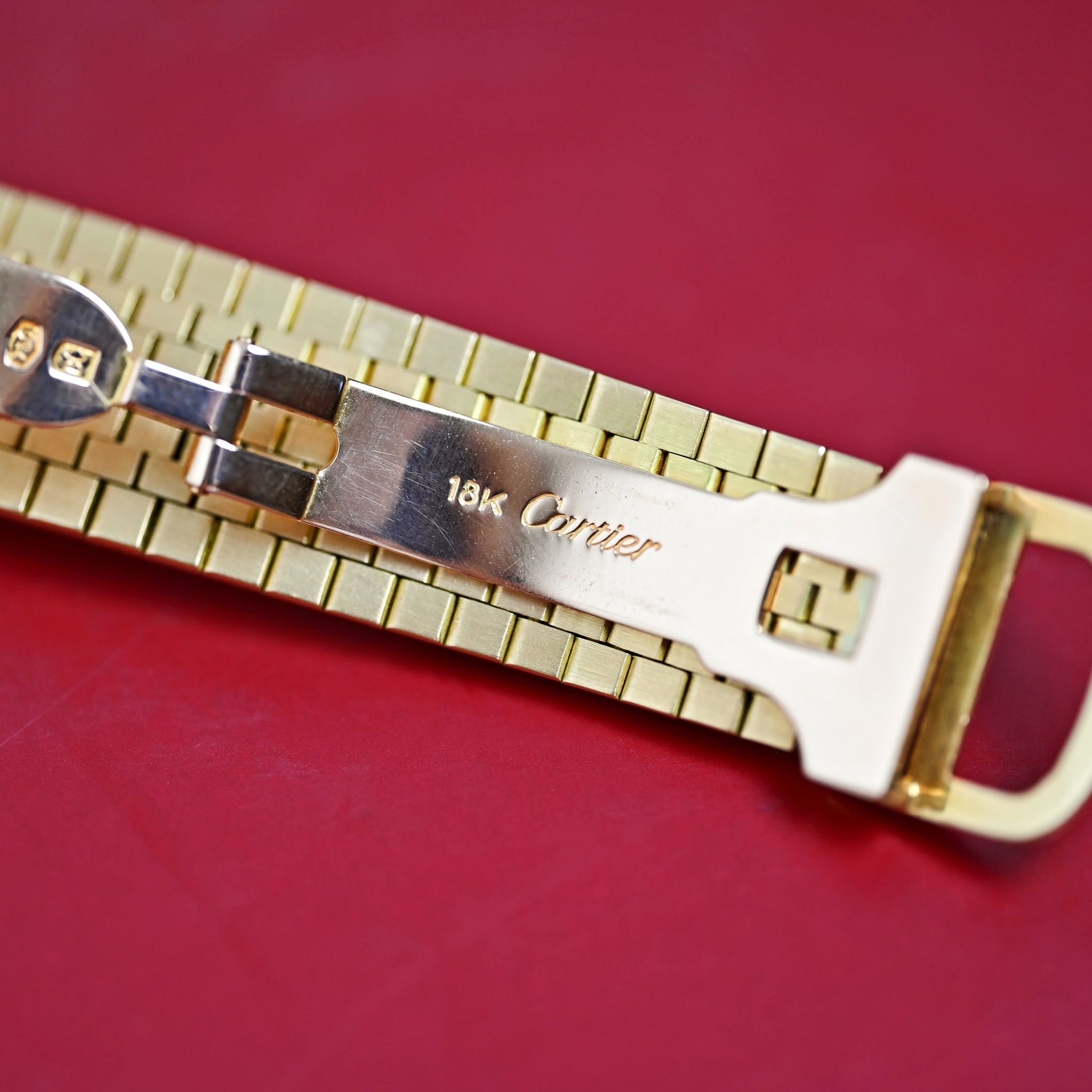 Case: Show sign of wear with the 18K Yellow Golc Case in size 23mm x 30mm without crown; Cartier serial numbers engraved on the case back