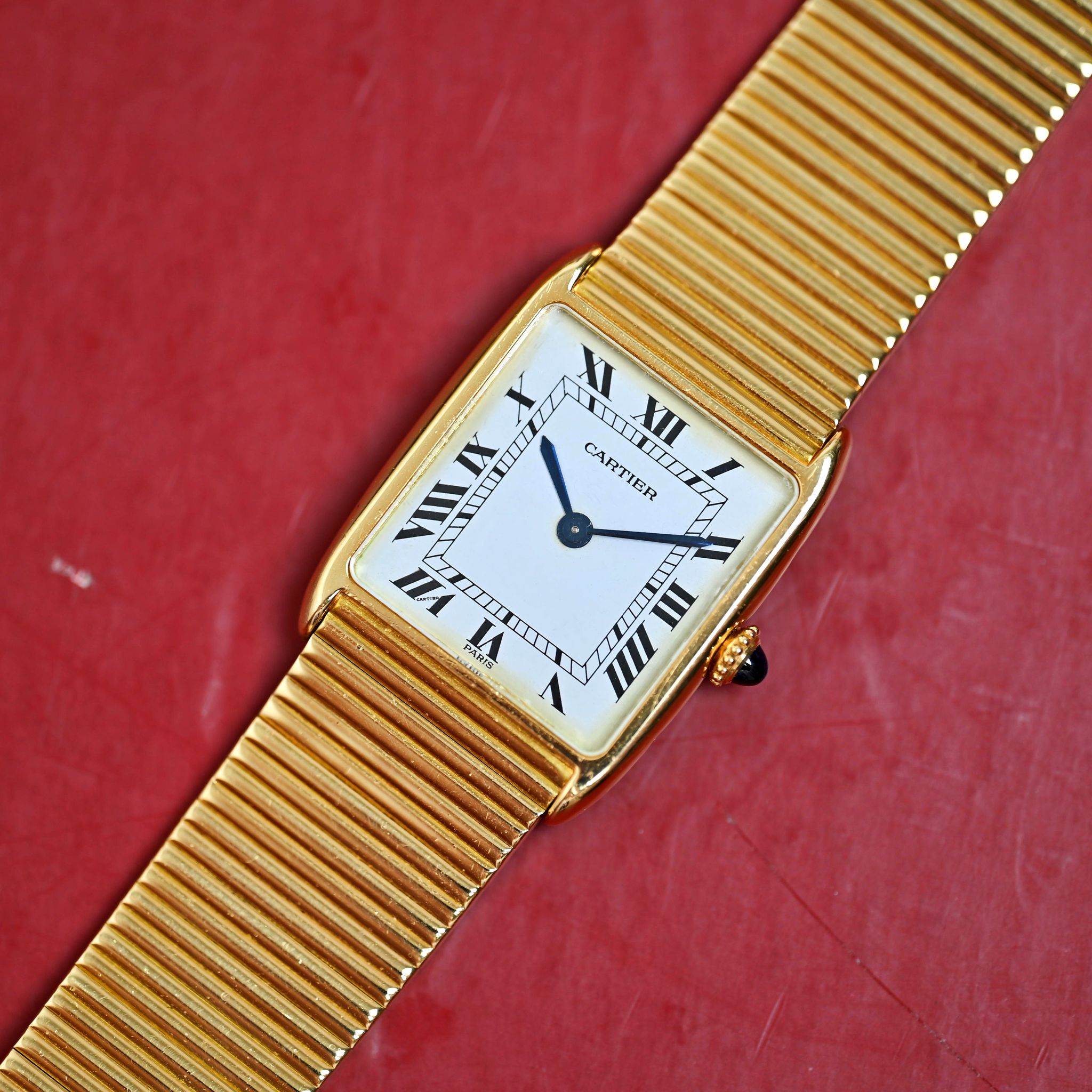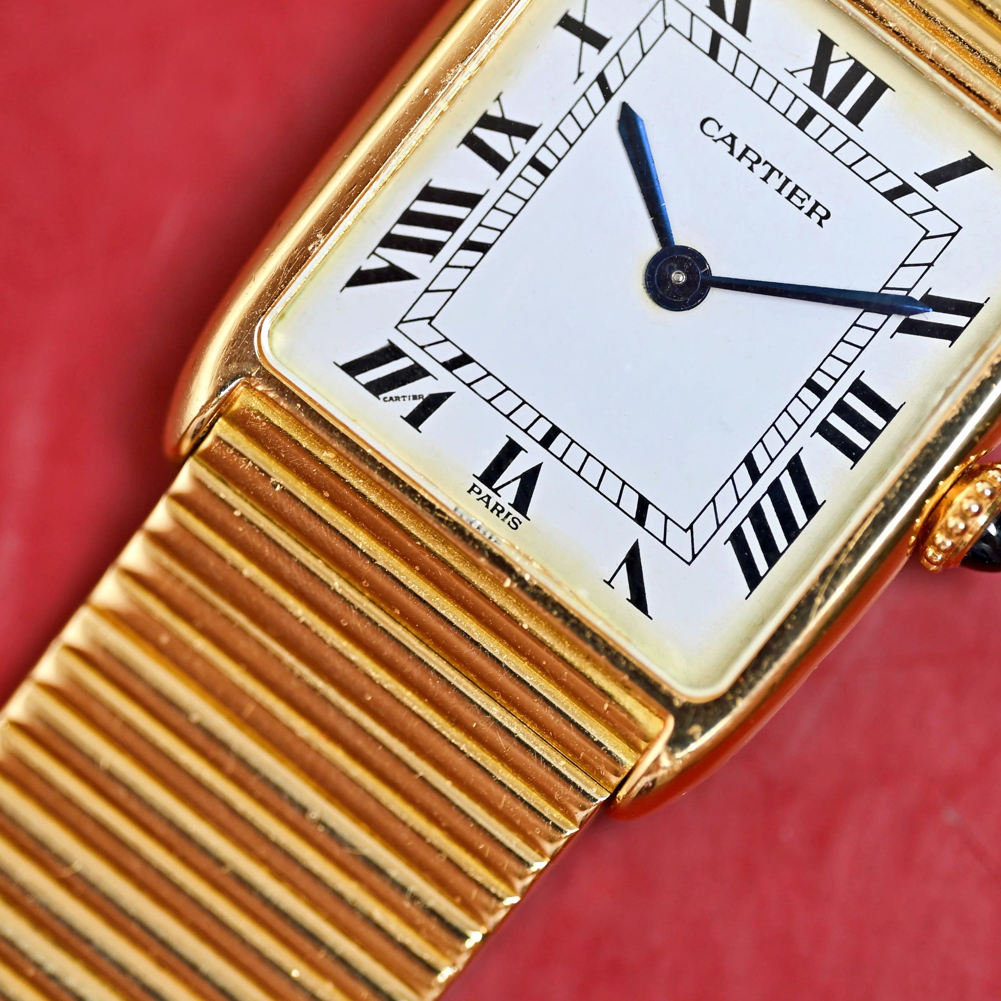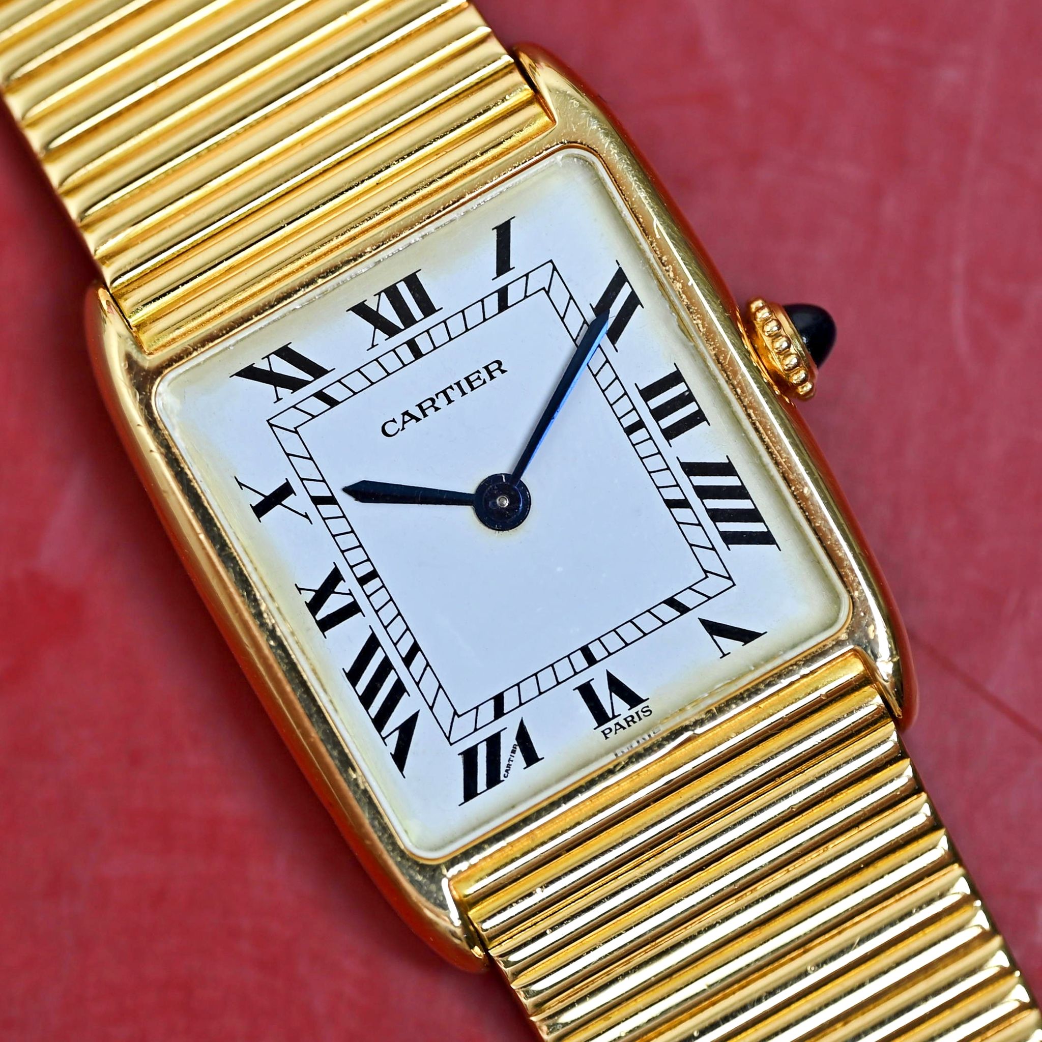This stunning Arrondie from the 1980s showcases an exquisite 18k yellow gold case, measuring 23 x 30 mm, and features a classic manual winding movement. Instead of the usual leather strap, it boasts a magnificent integrated Cartier bracelet, composed of delicate 18k yellow gold bars, capturing the essence of its era while remaining effortlessly chic.