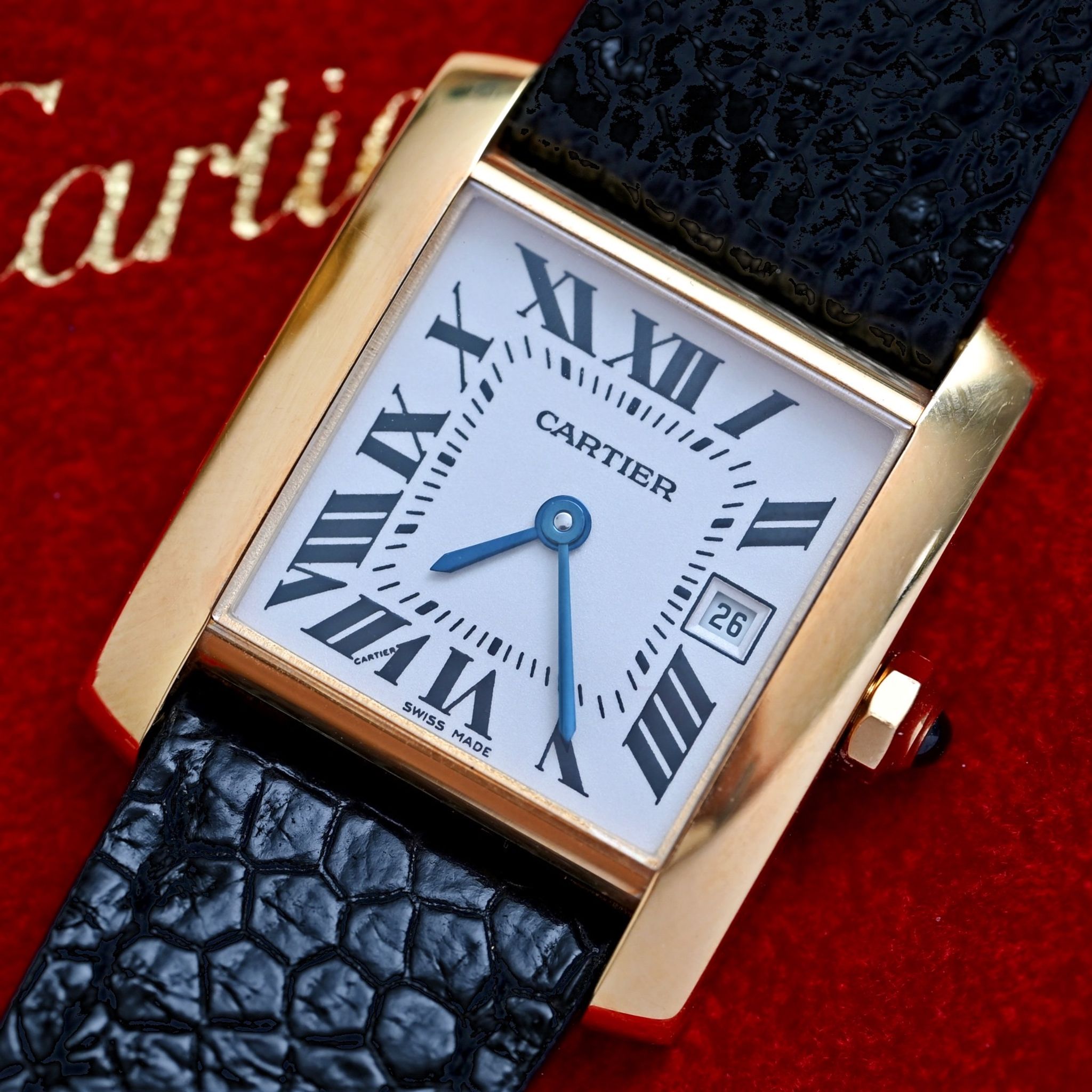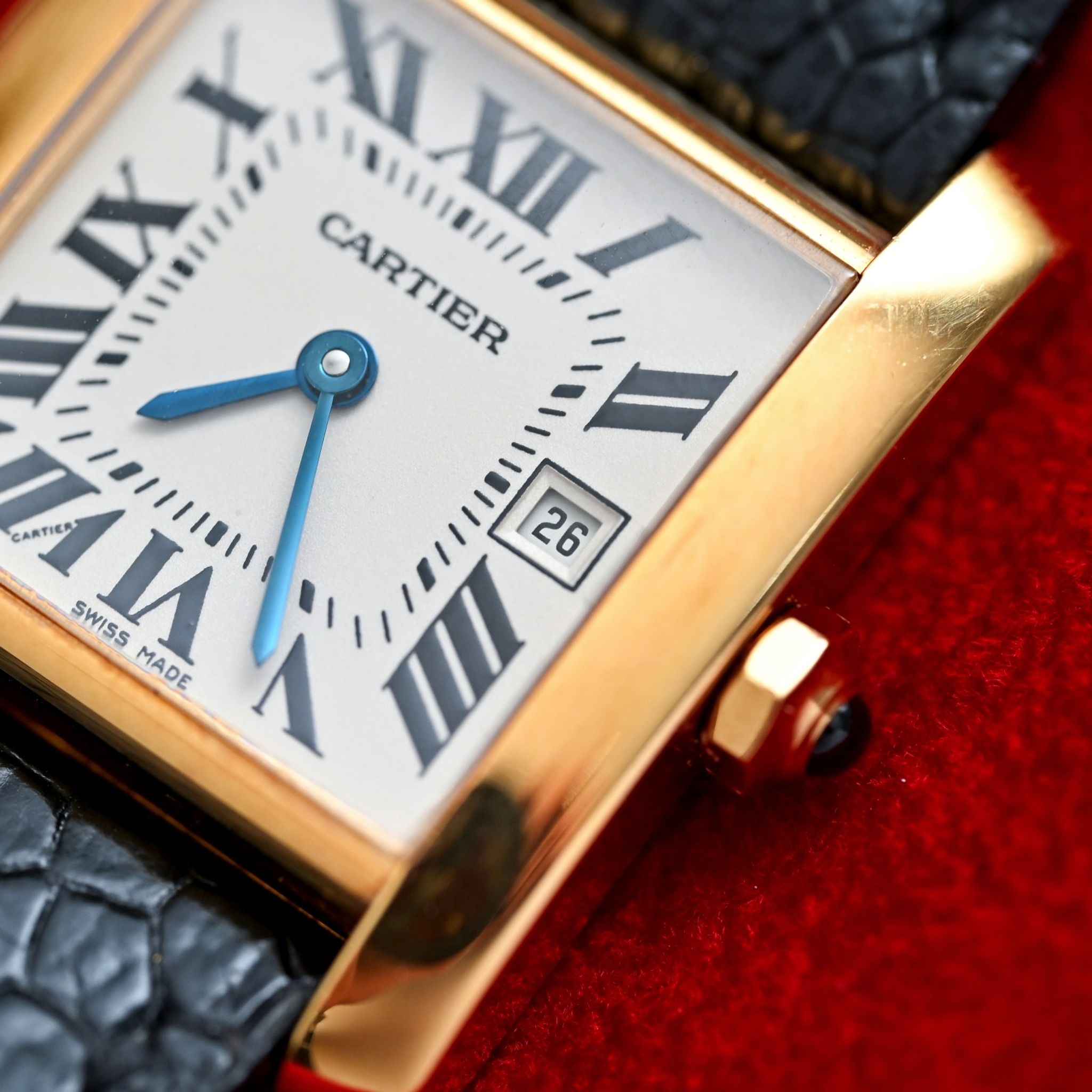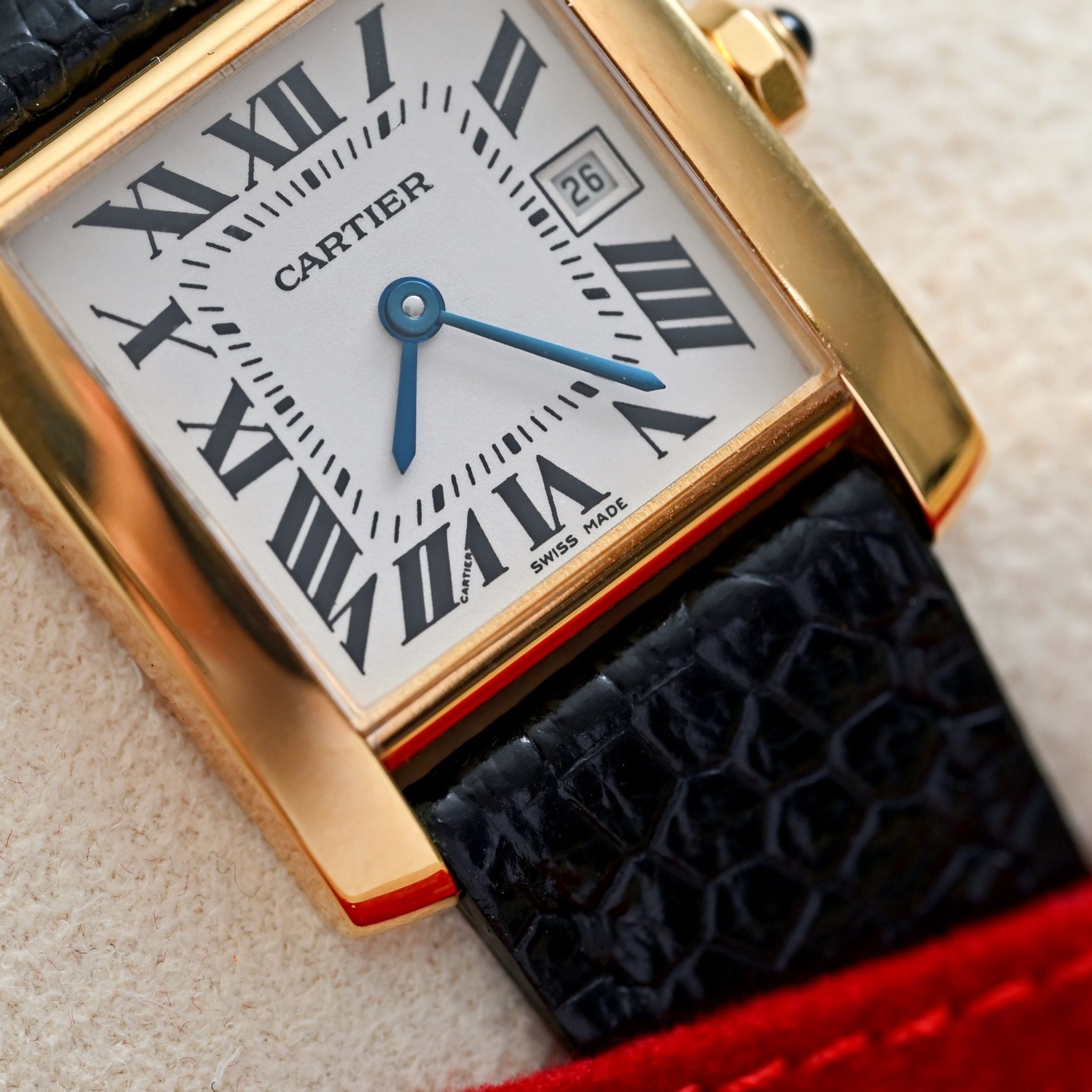 Dial: It features Cartier signature white roman numerals and black railroad type minute track dial and blue steel hands