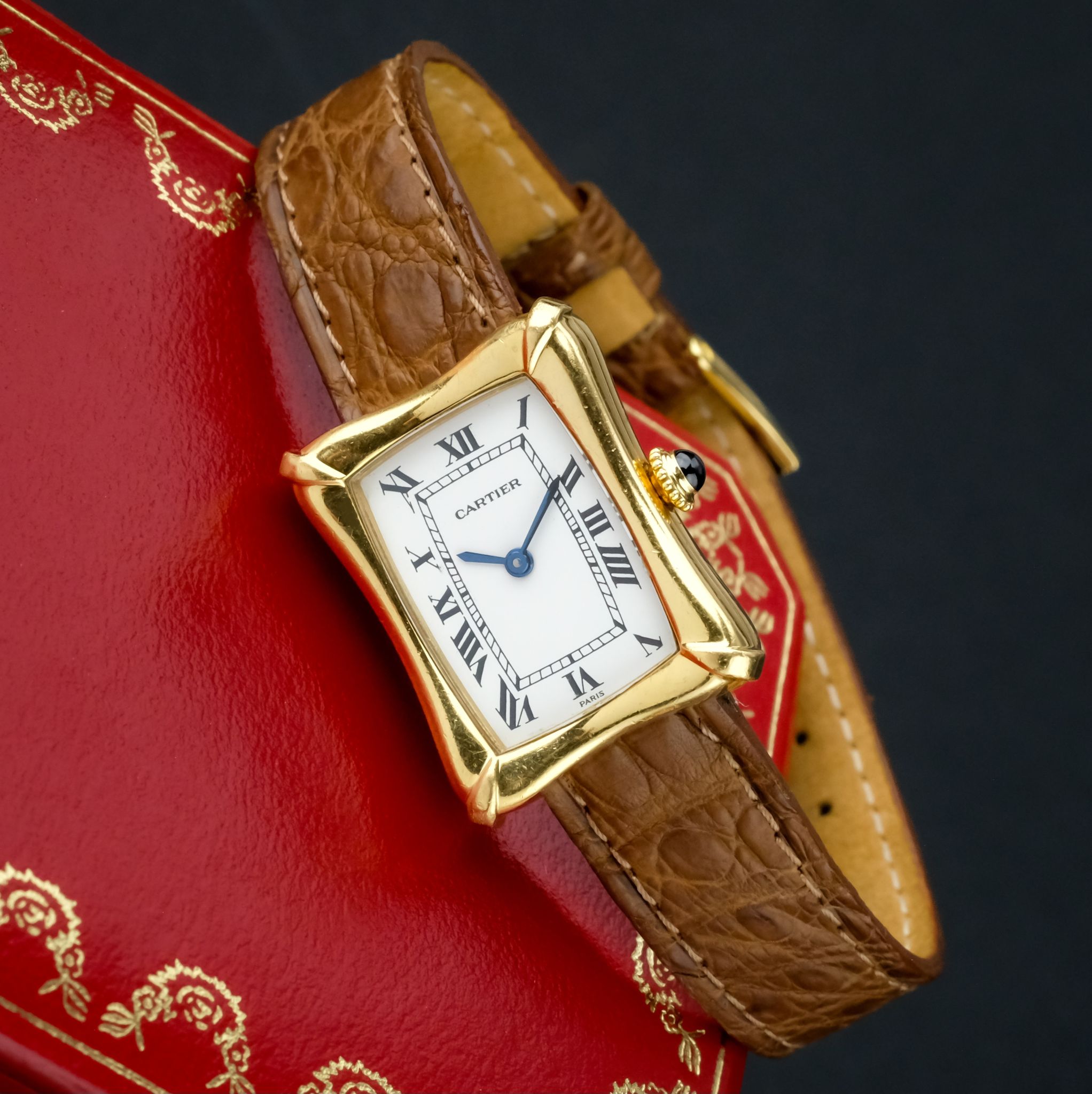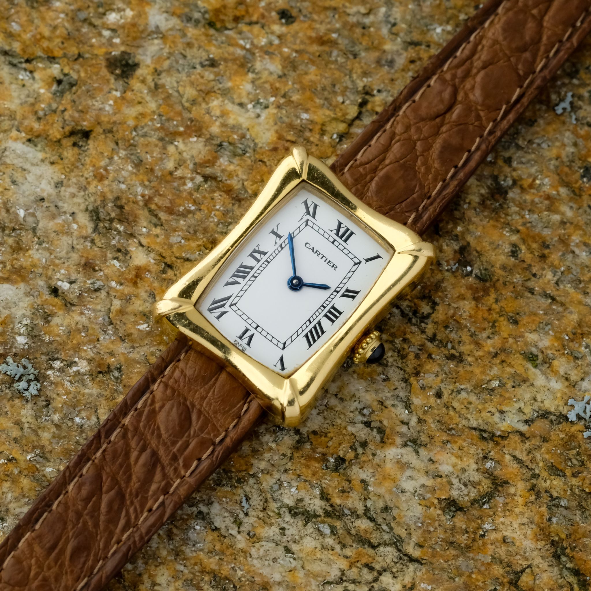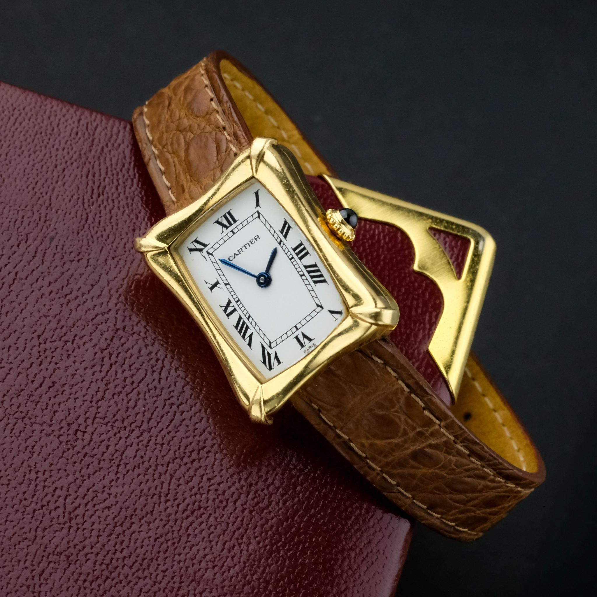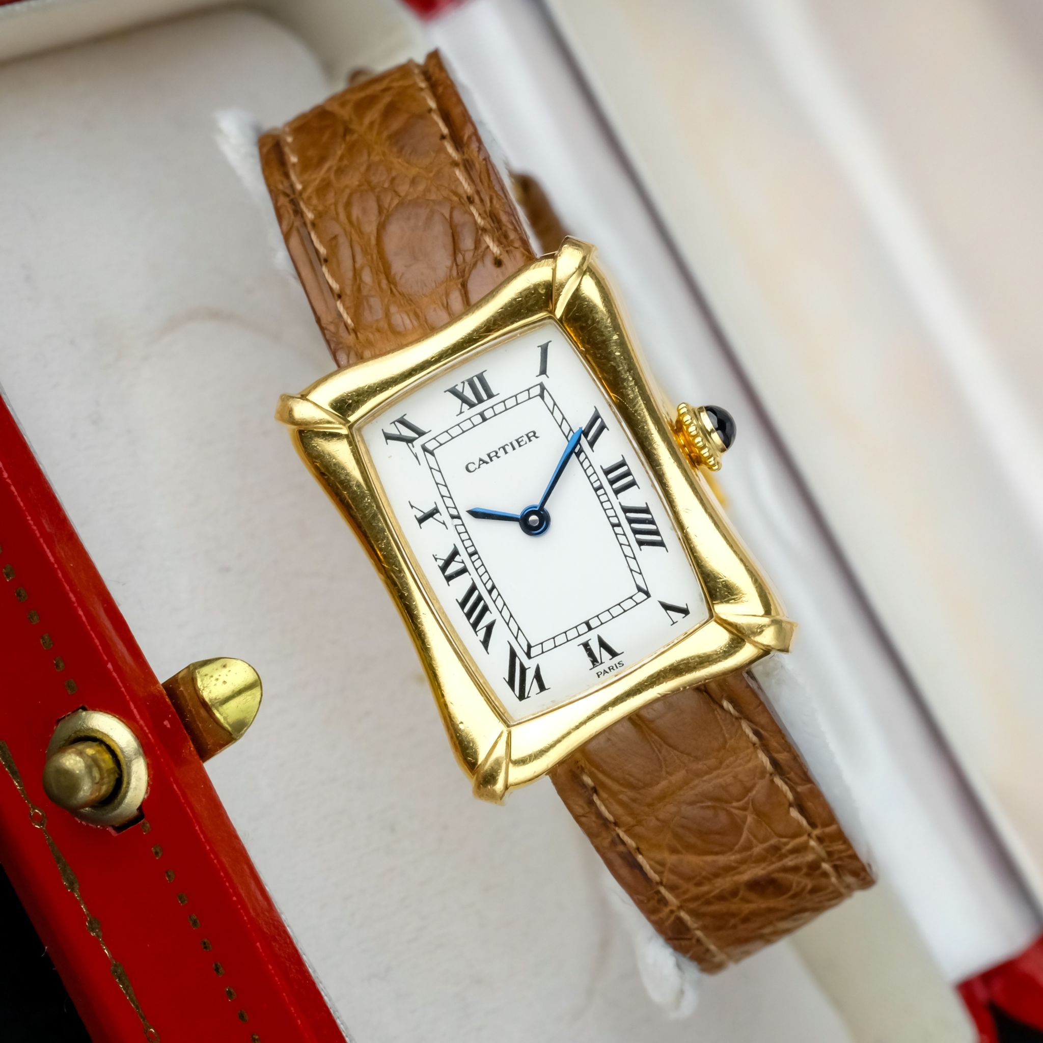 This Cartier Coussin ‘Bamboo’ PM is one of the maison’s most elusive vintage creations, blending whimsical design with Cartier’s timeless elegance. Crafted in solid 18k yellow gold, the case features the distinctive bamboo-style lugs and bezel, a rare aesthetic detail that sets this model apart from the classic Tank and other Cartier icons. This is the small PM version, perfect for a discreet yet unmistakably luxurious wrist presence. Its Paris-signed dial is a mark of its vintage pedigree, adding significant collectability to this already scarce reference. Powered by a manual-winding movement, the watch maintains Cartier’s tradition of slim, elegant dress watches with impeccable proportions. Considered ultra rare and seldom seen on the market, the Coussin Bamboo Ref. 78110 represents a fascinating chapter in Cartier’s design history—a true treasure for seasoned collectors seeking something exceptional beyond the maison’s mainstream classics.